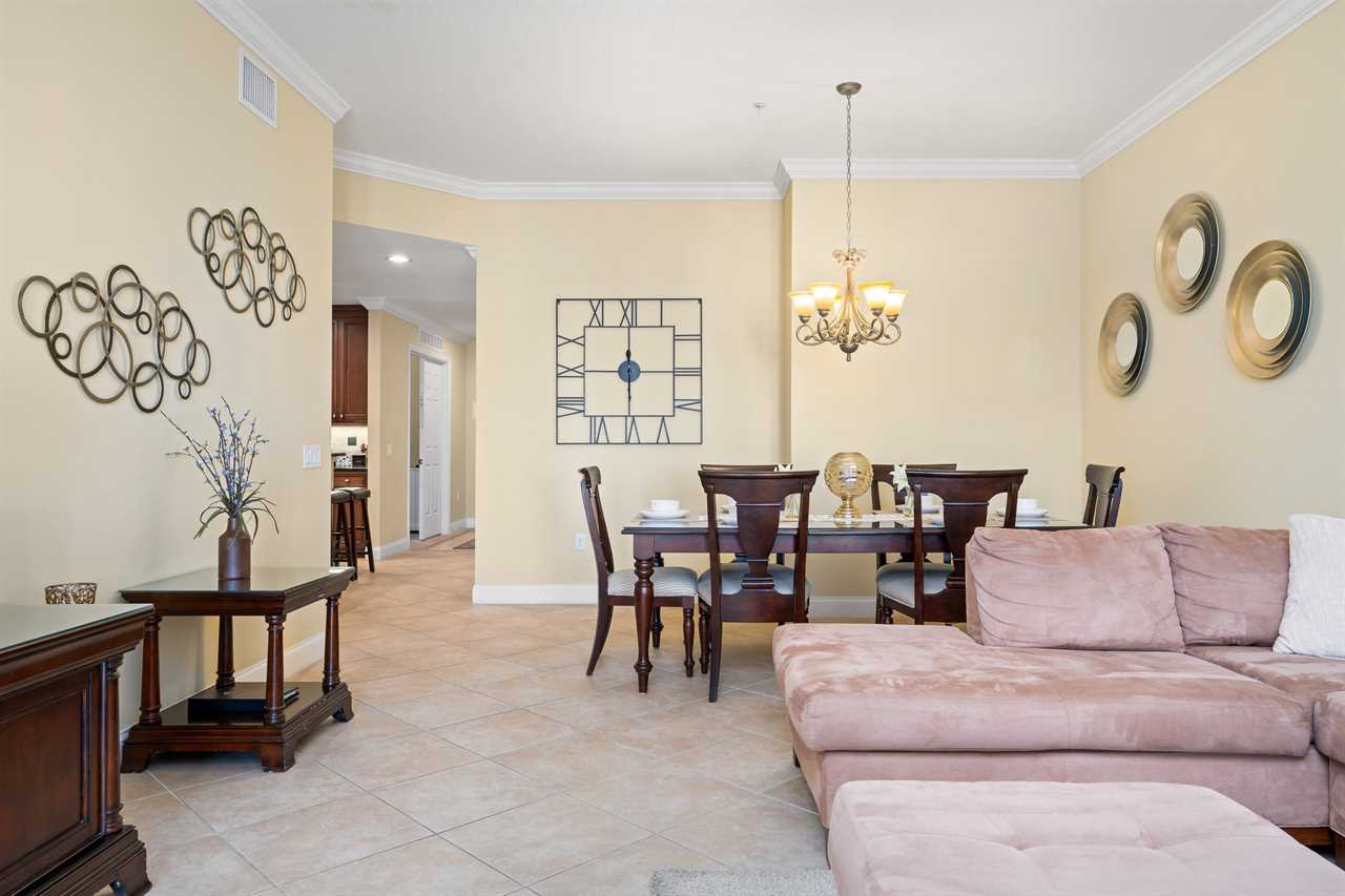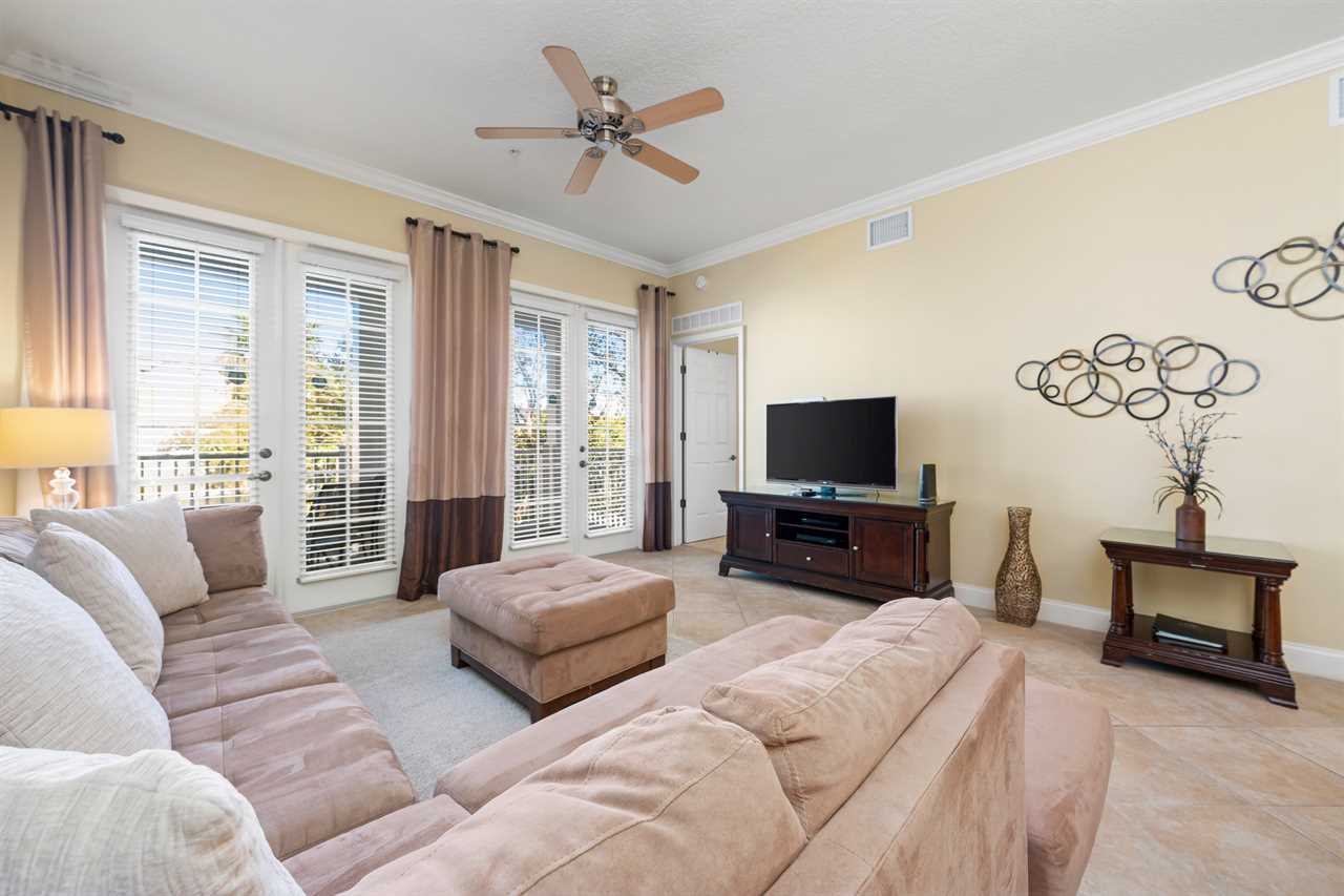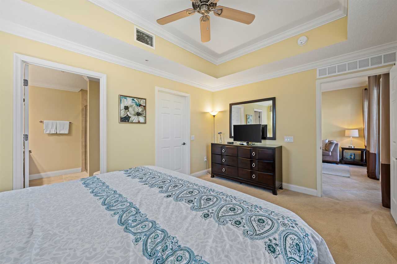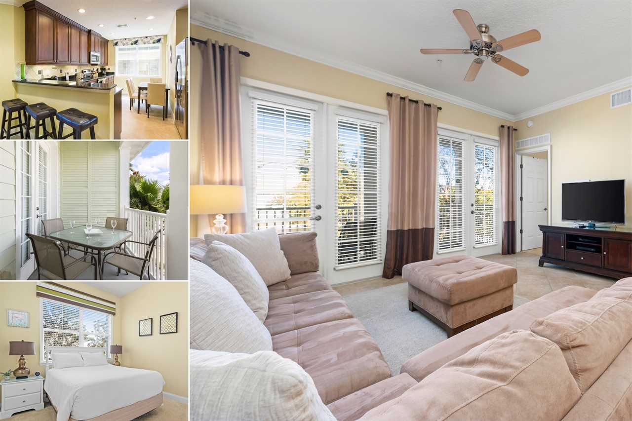 This luxuriously appointed 2nd floor vacation rental condo boasts 1,419 square feet of living space. There are three elegant bedrooms, a fully equipped kitchen, and two full bathrooms. The main gathering area offers living space, kitchen, and dining room.