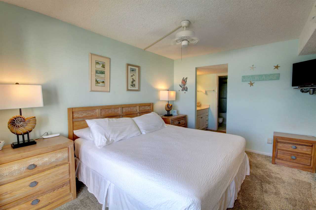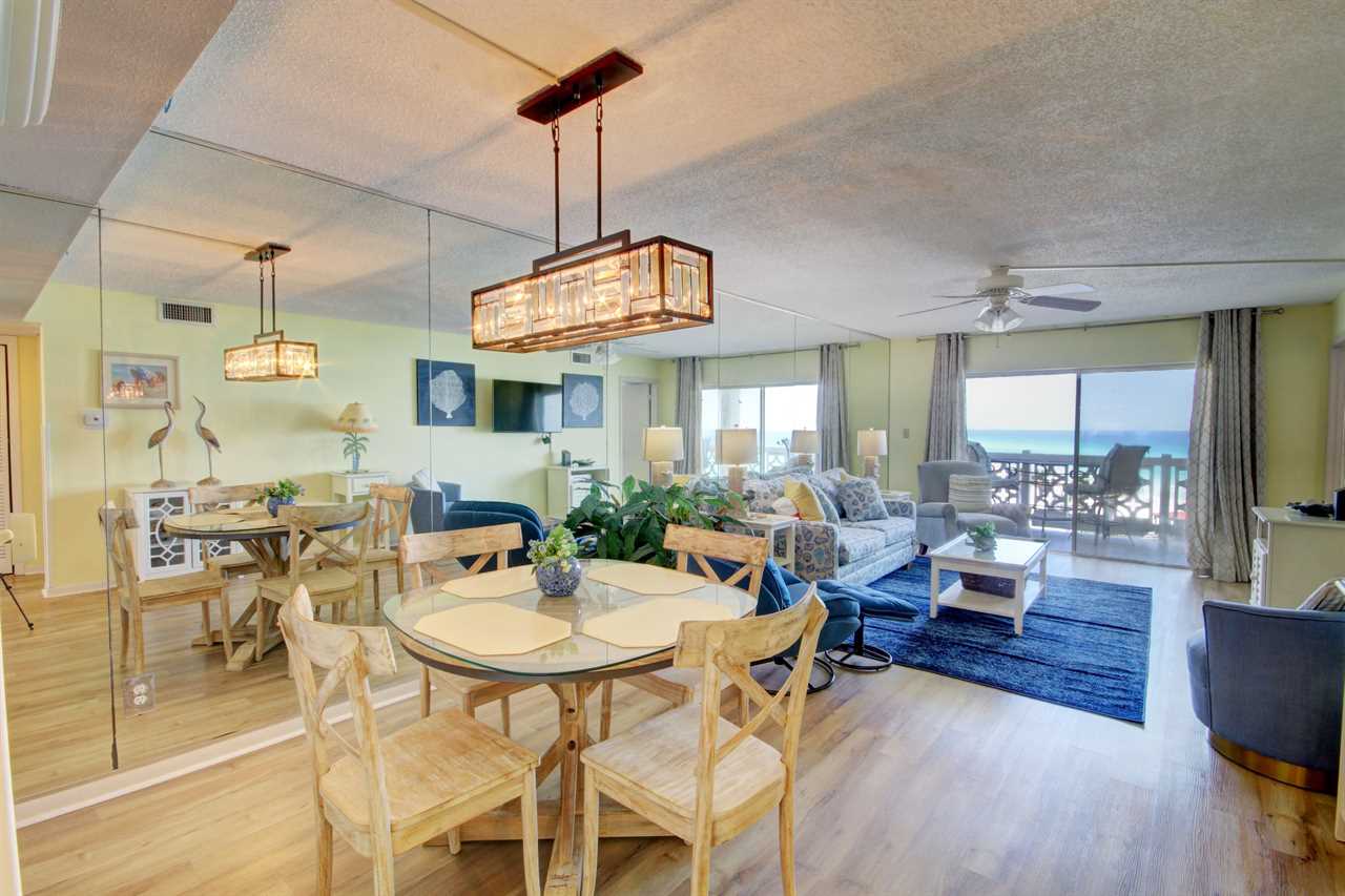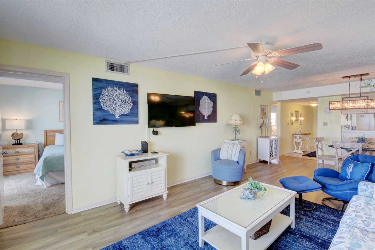 This two bedroom, two bathroom unit carries the blues from the ocean into your living space and invites you to relax among wave songs. The kitchen is fully furnished with everything you need to enjoy a great meal while you watch the waves crash onto the beach from your balcony. With three TV's in the unit, everyone can watch what they want and there is plenty of space for sleeping six. The fun decorations within the unit enhances your vacation experience.