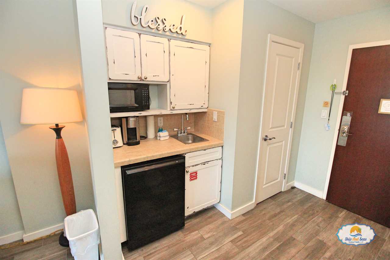 The studio at Luau is larger than many of the local hotel's rooms and even larger than many of their suites. Our studio at Luau comes with a king sized bed and pull out sofa in case you have a child in your party and sleeps three very comfortably. It has a flat screen TV in the room as well as a small table to eat at and a basic kitchenette with microwave, toaster, coffee pot, and dorm style fridge, just enough to cook basic meals. If you are more ambitious, Luau has some of the nicest gas grills on the beach and with a little practice you could grill just about anything and have some pretty tasty meals without having a kitchen or the cleanup.