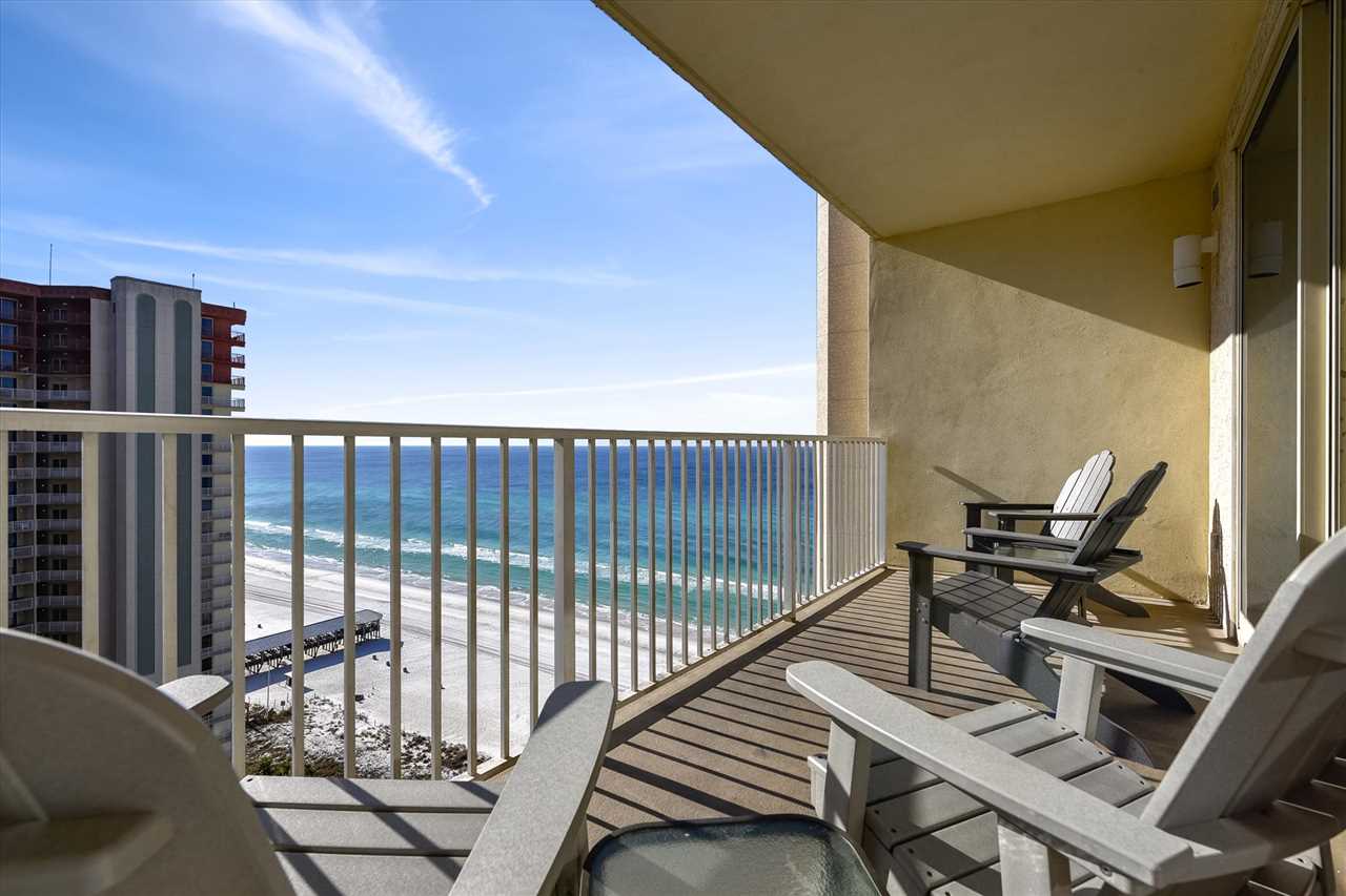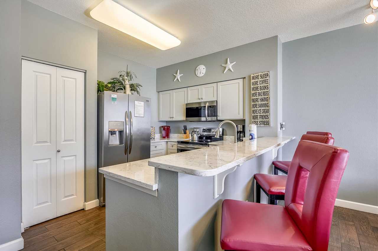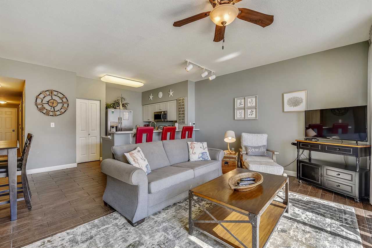 Welcome to Shores of Panama 1807, in Panama City Beach. This is the vacation getaway your family will never forget. When you walk into this 18th floor, recently updated condo. You will see brand new tile through-out the entire condo. You will find stunning views of the Gulf of America, or Mexico, the Ocean, or whatever you want to call it right from your very own balcony. This two-bedroom with bunks and 3 full baths has plenty of room for everyone. You and loved ones will enjoy the inviting living area that features a large flat-screen television, a DVD player, two chairs and a blue couch that includes a queen sleeper sofa. Attached is a dining table space for four and bar area for three. The fully stocked kitchen adjoins to the dining area to converse with family while preparing a meal.