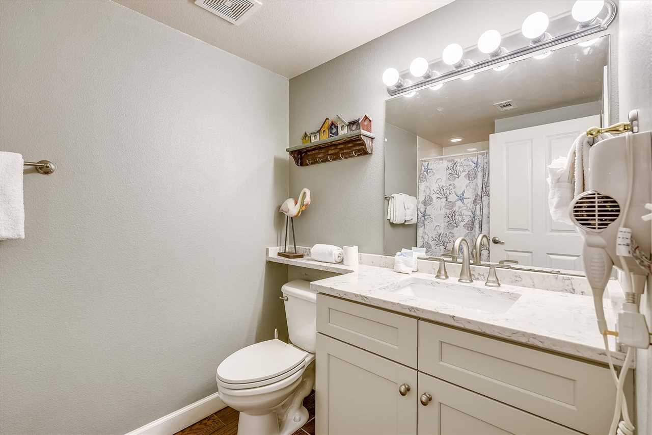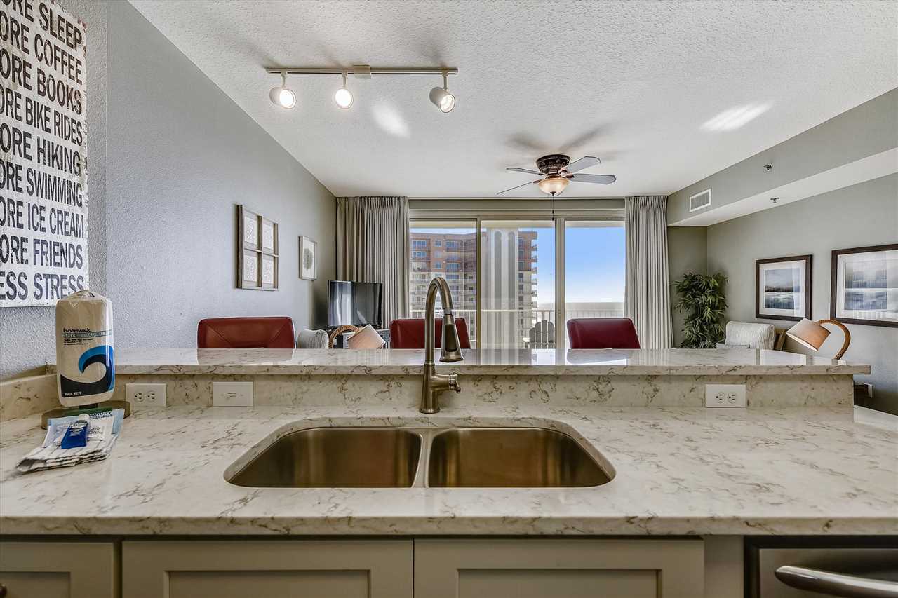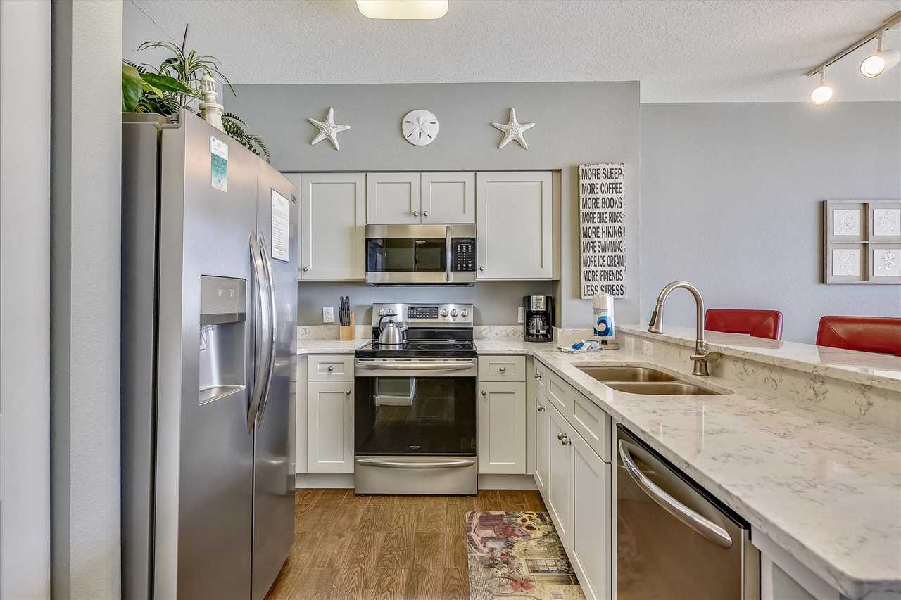 Welcome to Shores of Panama 1807, in Panama City Beach. This is the vacation getaway your family will never forget. When you walk into this 18th floor, recently updated condo. You will see brand new tile through-out the entire condo. You will find stunning views of the Gulf of America, or Mexico, the Ocean, or whatever you want to call it right from your very own balcony. This two-bedroom with bunks and 3 full baths has plenty of room for everyone. You and loved ones will enjoy the inviting living area that features a large flat-screen television, a DVD player, two chairs and a blue couch that includes a queen sleeper sofa. Attached is a dining table space for four and bar area for three. The fully stocked kitchen adjoins to the dining area to converse with family while preparing a meal.