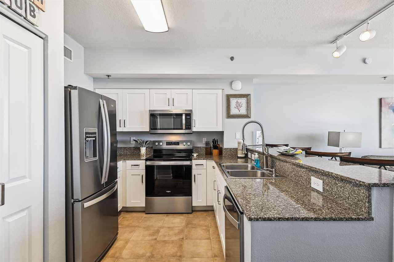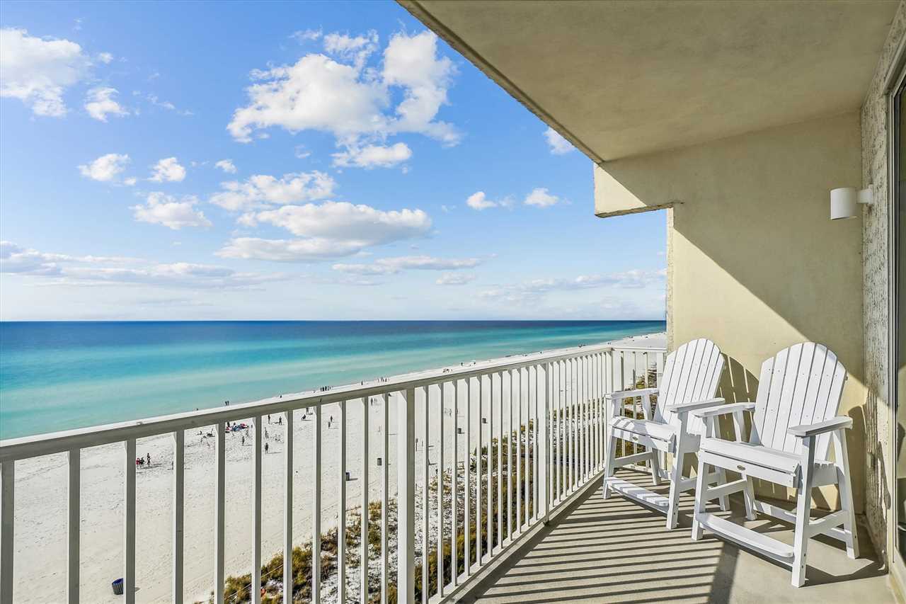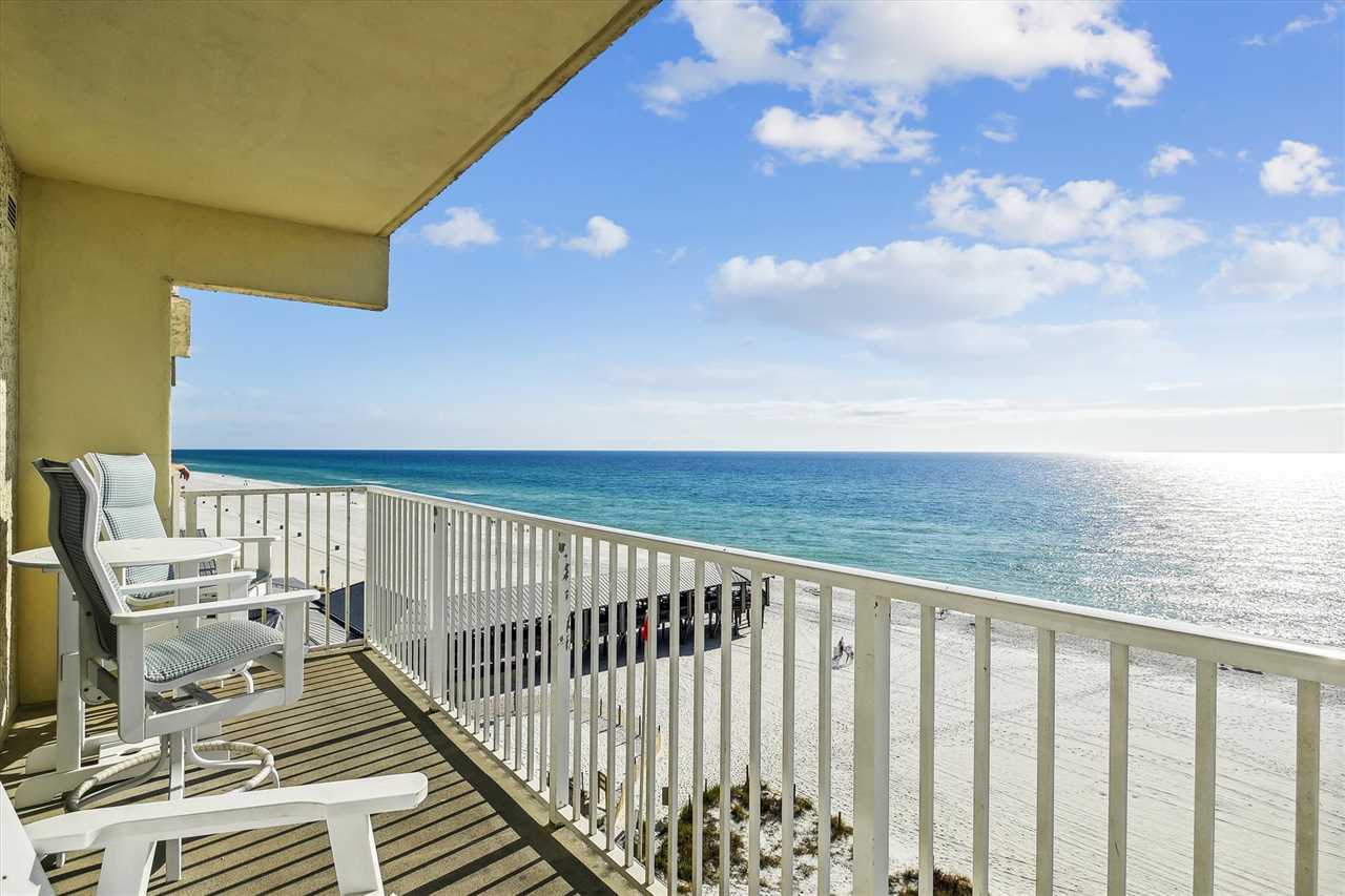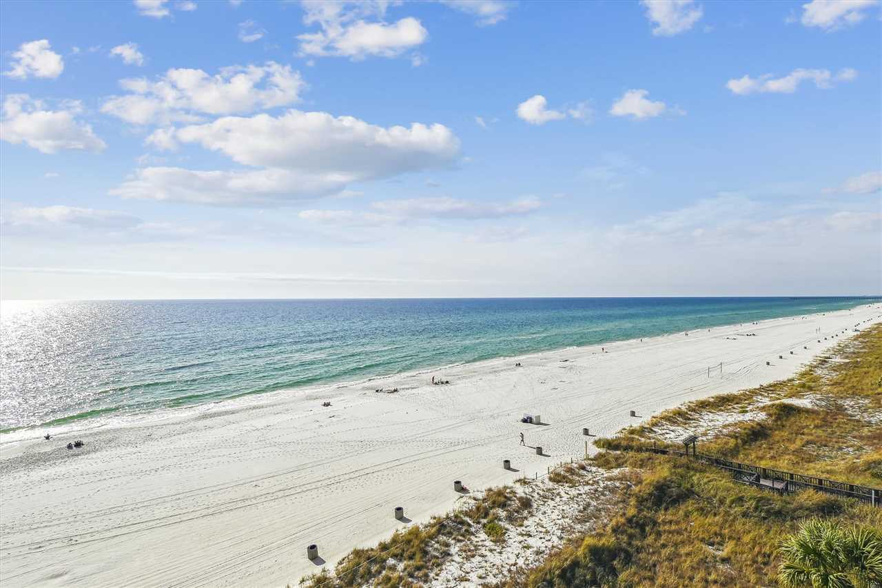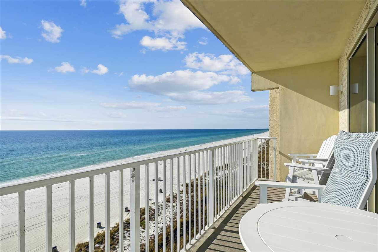 As soon as you enter the home, you will be taken aback by the breathtaking view over the bright blue water, white beach, nearby town, and never-ending coast line. Wake up in the morning by heading out to your private balcony and sit in one of the two chairs. Make a cup of coffee in your modern kitchen with the coffee pot or kettle, plop down in the chair, and take a video of the bright orange and red sunrise coming up over the expansive horizon.