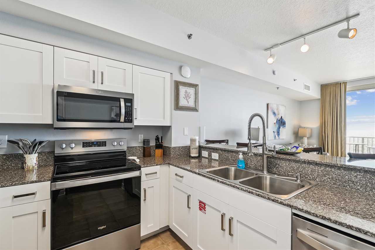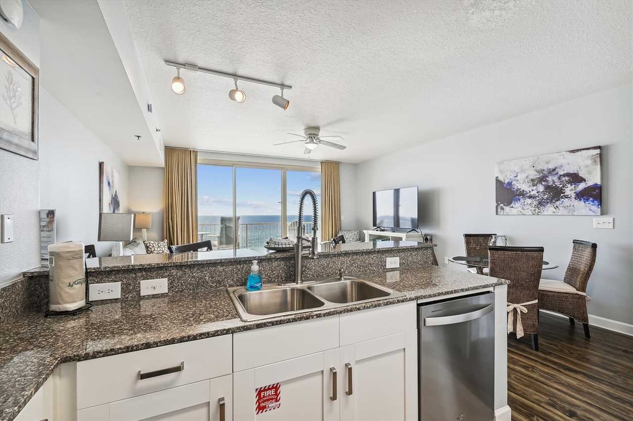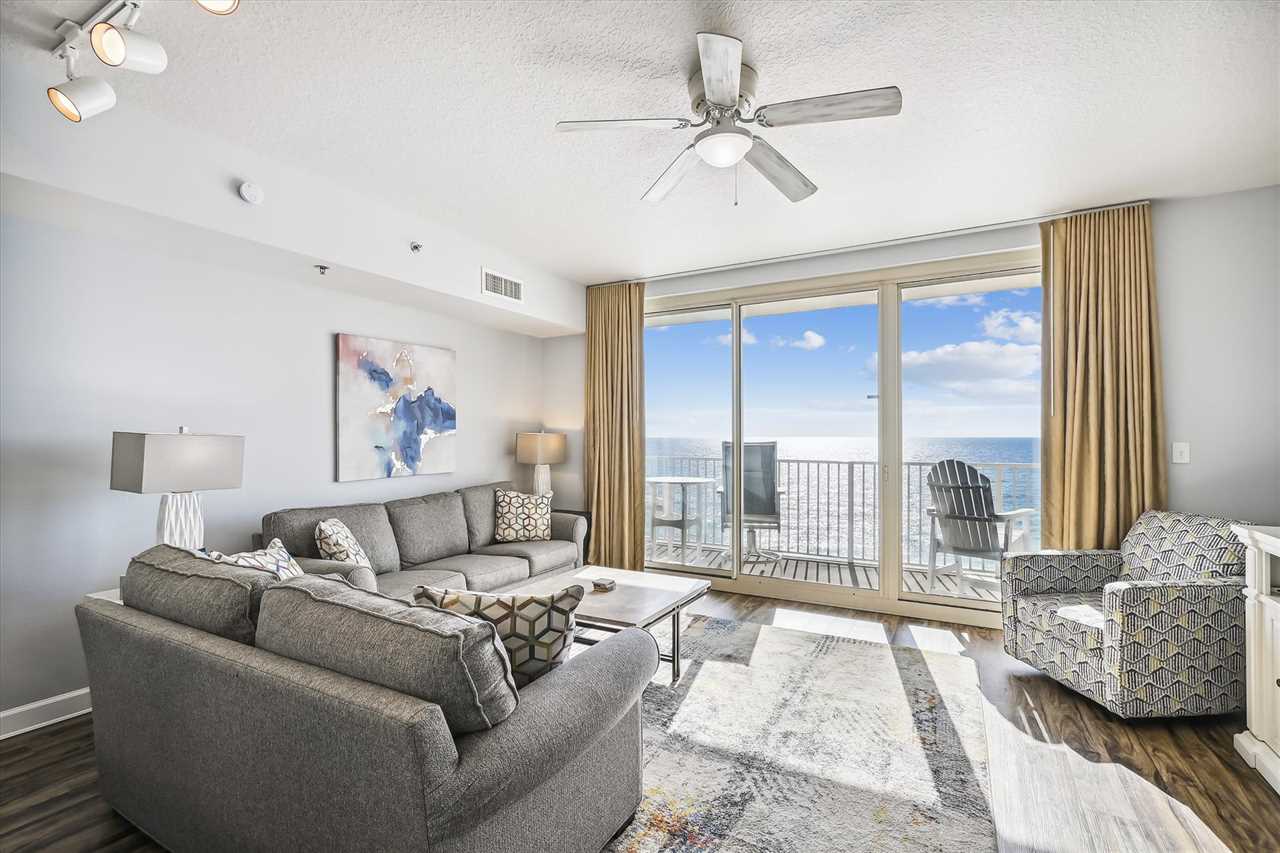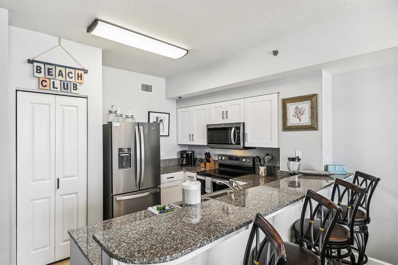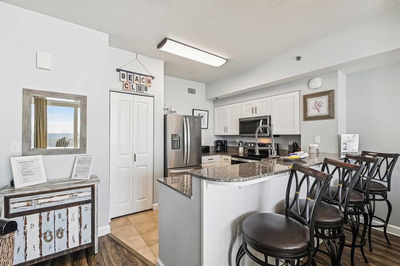 As soon as you enter the home, you will be taken aback by the breathtaking view over the bright blue water, white beach, nearby town, and never-ending coast line. Wake up in the morning by heading out to your private balcony and sit in one of the two chairs. Make a cup of coffee in your modern kitchen with the coffee pot or kettle, plop down in the chair, and take a video of the bright orange and red sunrise coming up over the expansive horizon.