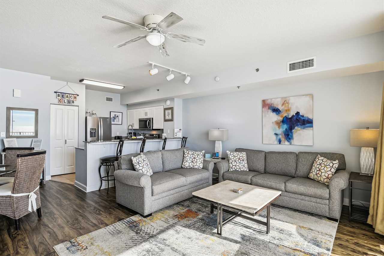 Check out Shores of Panama 630, a one-bedroom, two-bathroom condo that can fit you and your five best friends! Just because there is one bedroom, it doesn't mean it is cramped or small – this modern and spacious condo features an open floor plan, ample seating, comfortable furnishings, and plenty of rooms that can fit 6 people with ease.