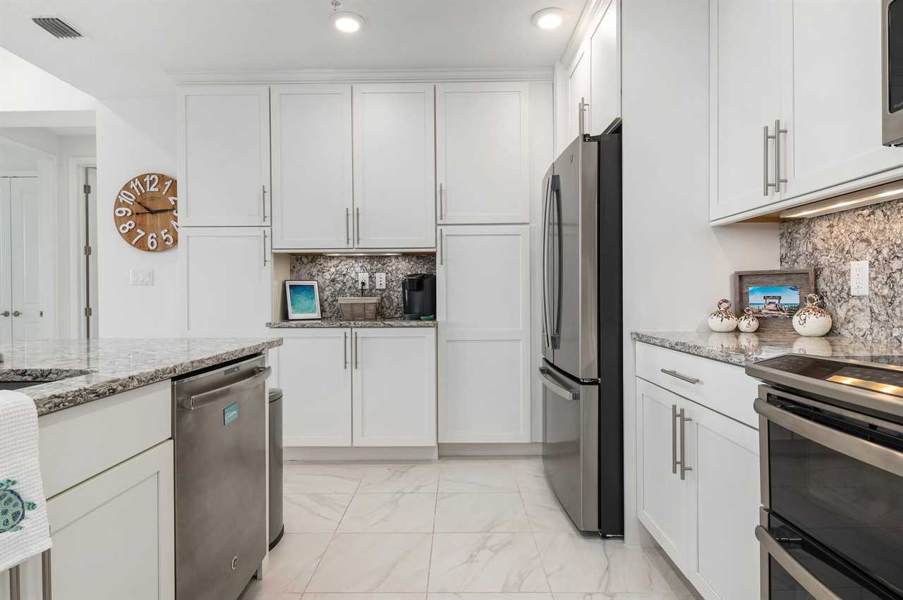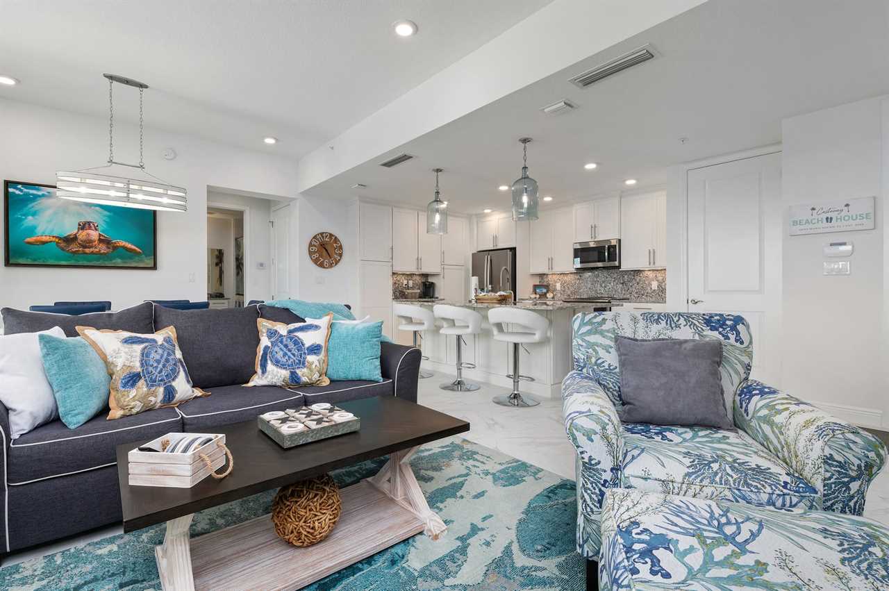 This well-appointed 2 bedroom/2 bath condo boasts all new furnishings and interior features including beautiful tile floors throughout. Enjoy modern beach-style decor with comfort, luxury, and relaxation in mind. This top-floor condo offers high ceilings and an open floor plan with the bedrooms on opposite sides of the space. The lanai overlooks the pool, offering stunning views of the community's lushness and swaying palms.