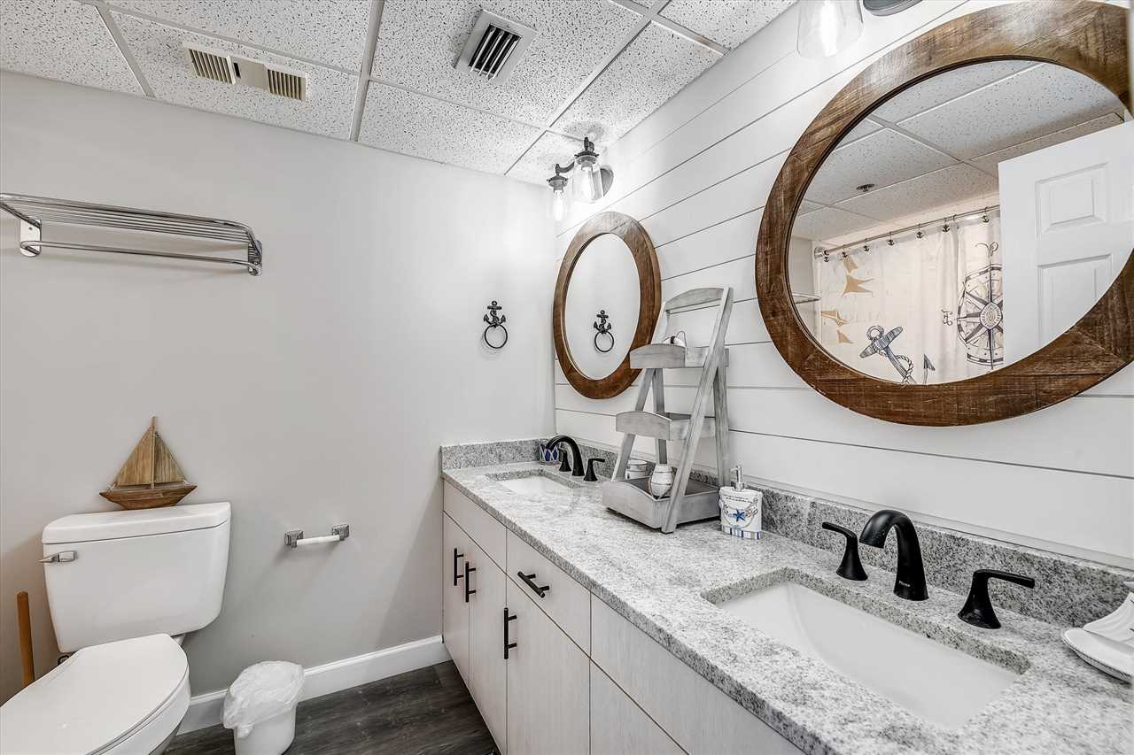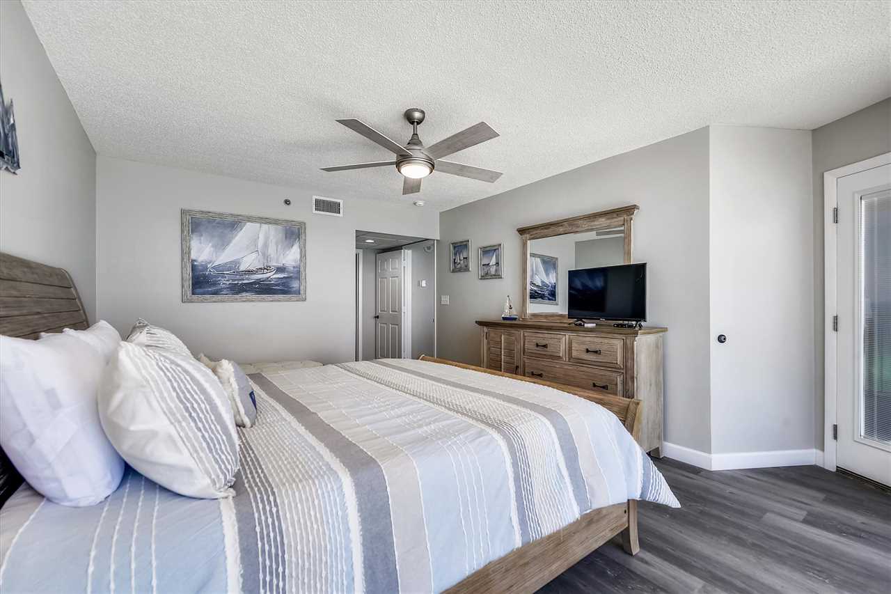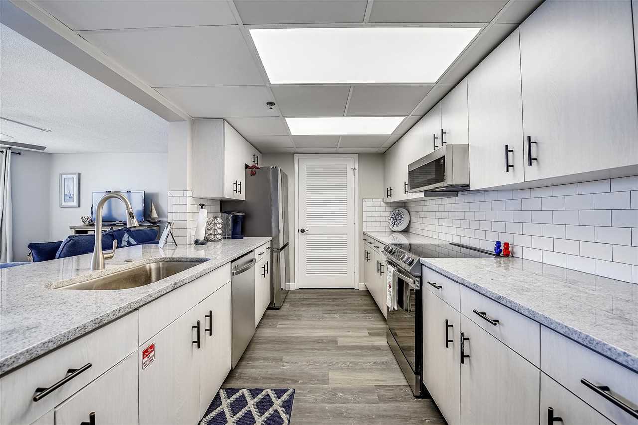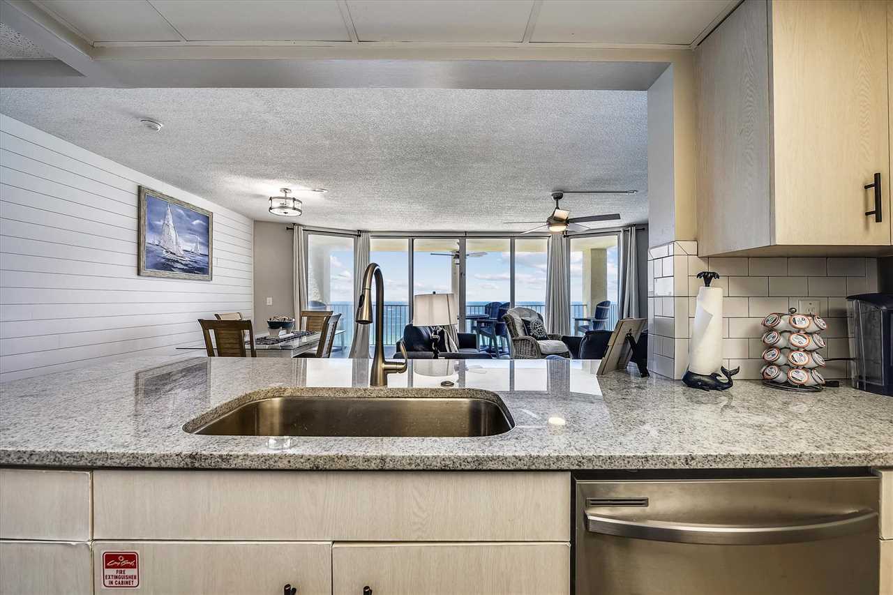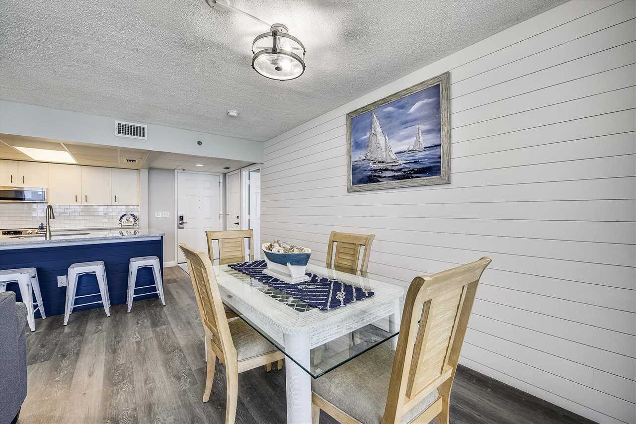 Enjoy lazy vacation meals with a view at the dining table for four, or grab a quick bite at the breakfast bar. The stunningly upgraded, fully-equipped kitchen features sleek stainless steel appliances and all the essentials you need to cook up your favorite dishes.