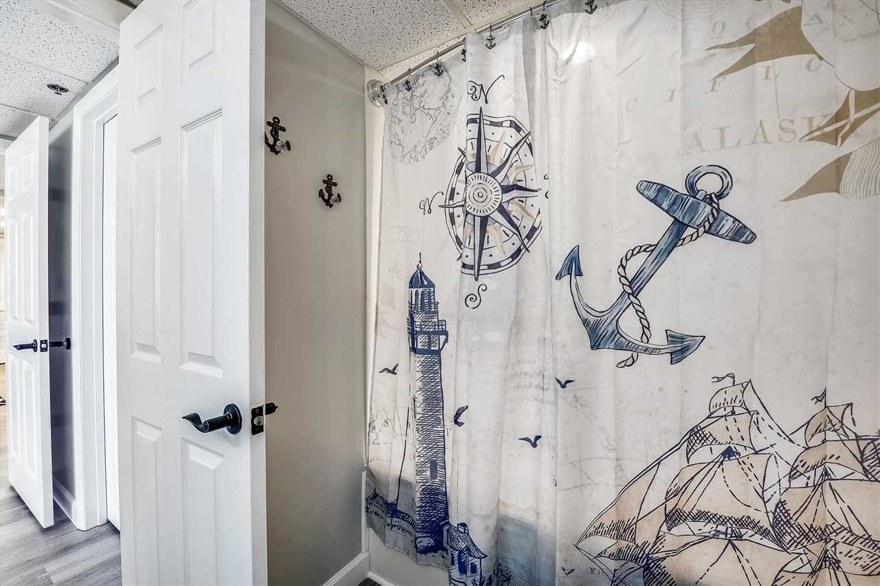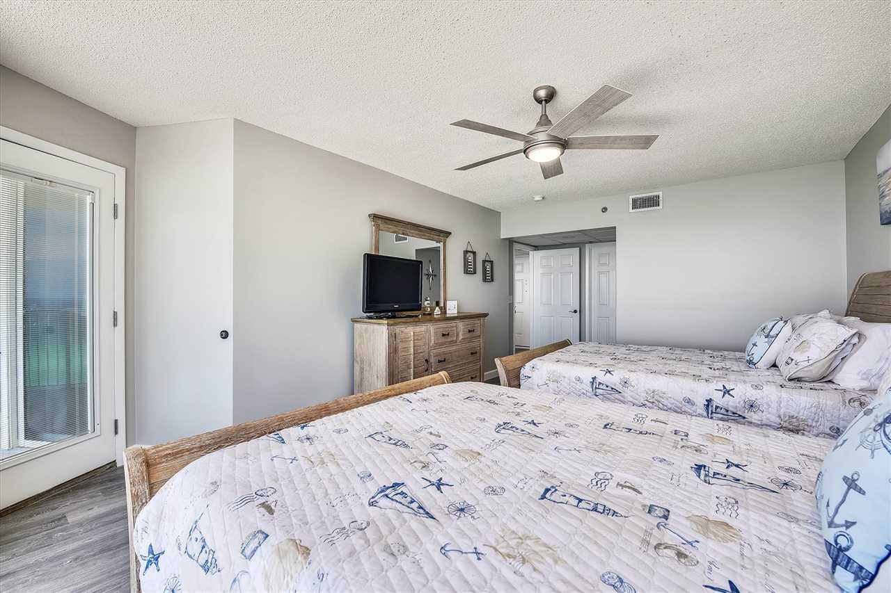 The spacious master bedroom offers a peaceful escape with a king sized bed and breathtaking Gulf views. The beautifully upgraded en-suite bathroom features a tub/shower combo and double vanity. The second bedroom boasts two queen size beds and sweeping Gulf views. An adjoining bathroom also features a tub/shower combo and is equally as impressive as the master. A stackable washer/dryer is tucked away for your convenience, making laundry a breeze.