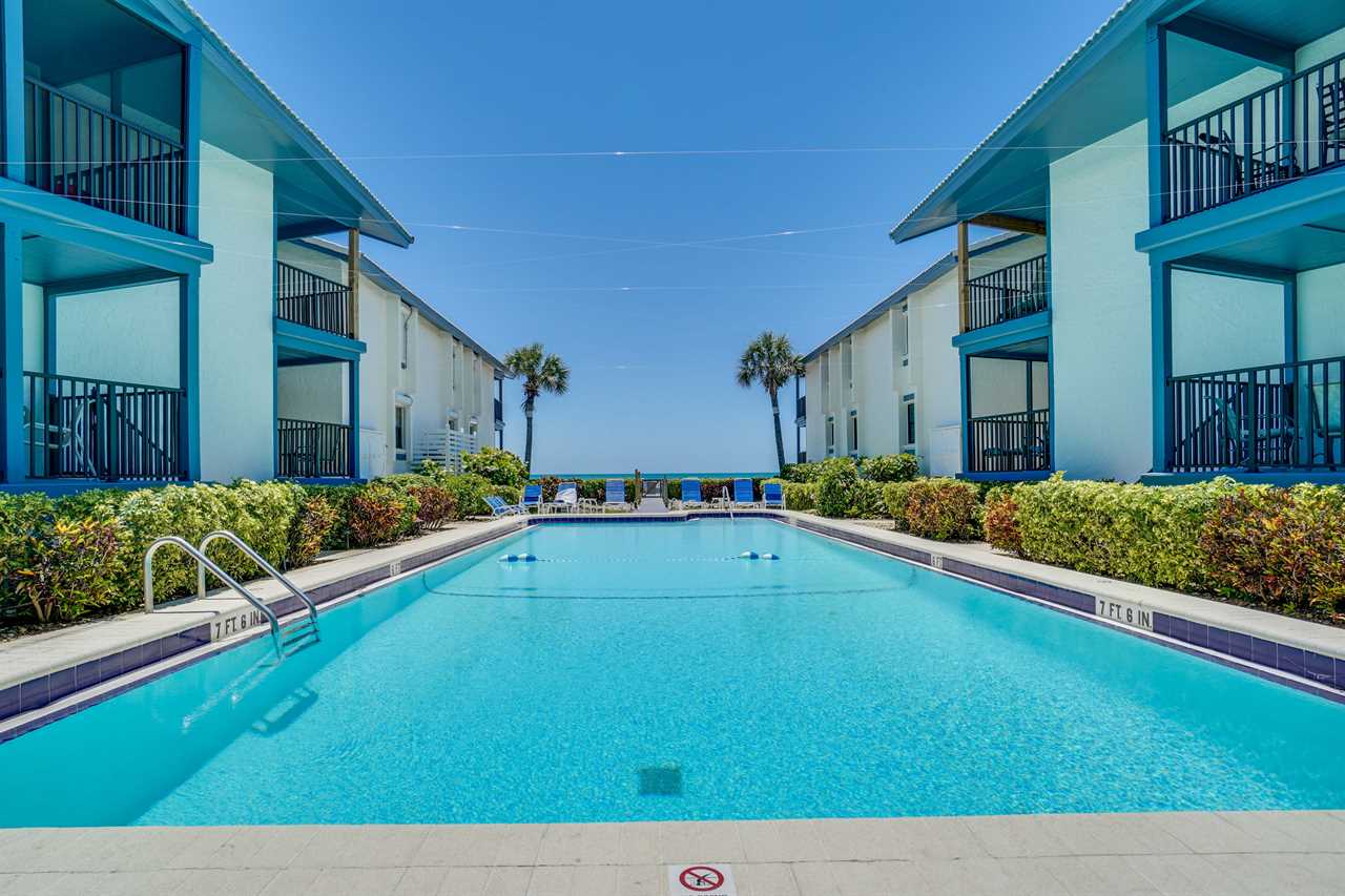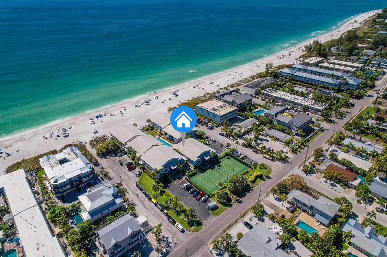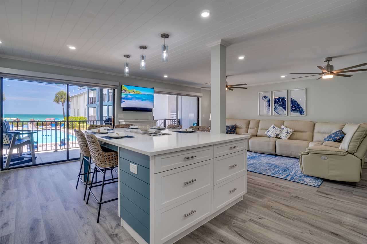 Located on the tranquil beaches of Anna Maria Island, Sandy Turtle is mere steps away from the beach and offers picturesque views of the Gulf of Mexico. The only thing distancing the balcony from the sand is a large, heated, shared swimming pool. This condo is one of the few originals left on the island and offers that laid back feel with 3 bedrooms and 2 full baths to accommodate up to 6 guests. Upon entry, you will find the living room & dining room area that provide an open-floor plan with gulf front views beyond the balcony. The full-size kitchen with built-in breakfast bar has everything you need to make a quick snack or full-course meal. Off the living room and dining room, you will find the oversized balcony where you can enjoy your morning coffee or evening cocktail while watching the sunset. The primary bedroom features a king-size bed and ensuite bathroom and flat-screen TV. The first guest room also features a king-size bed while the third room features a queen-size bed. This unit also has a washer/dryer and beach chairs for guest use.
