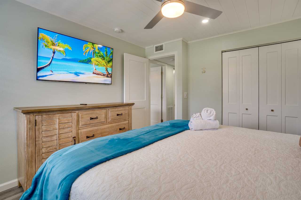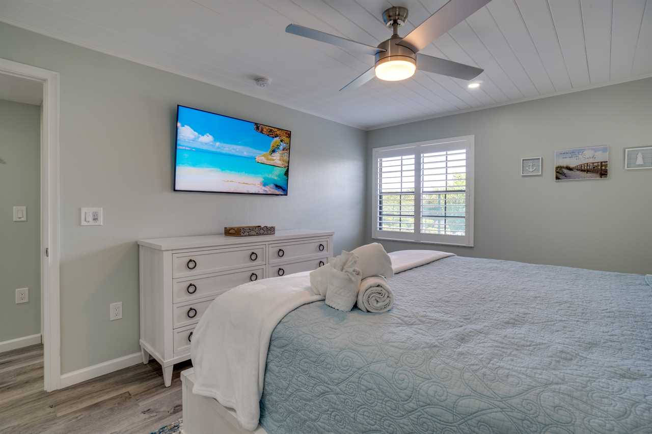 The primary bedroom features a king-size bed, flat screen TV and private ensuite bathroom.