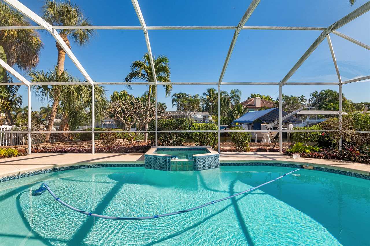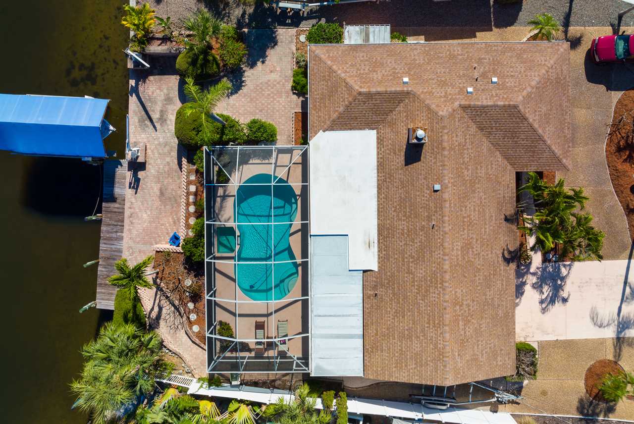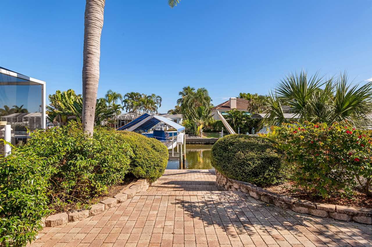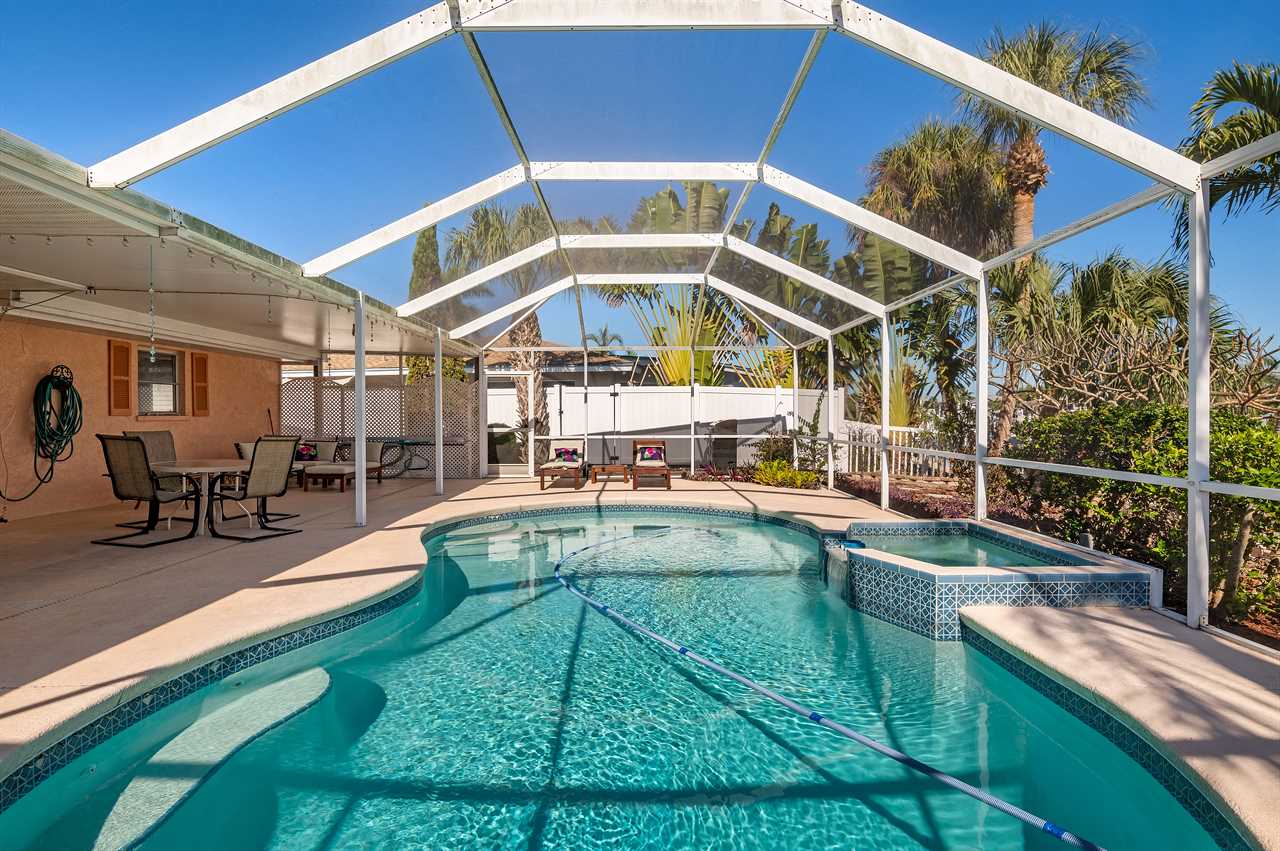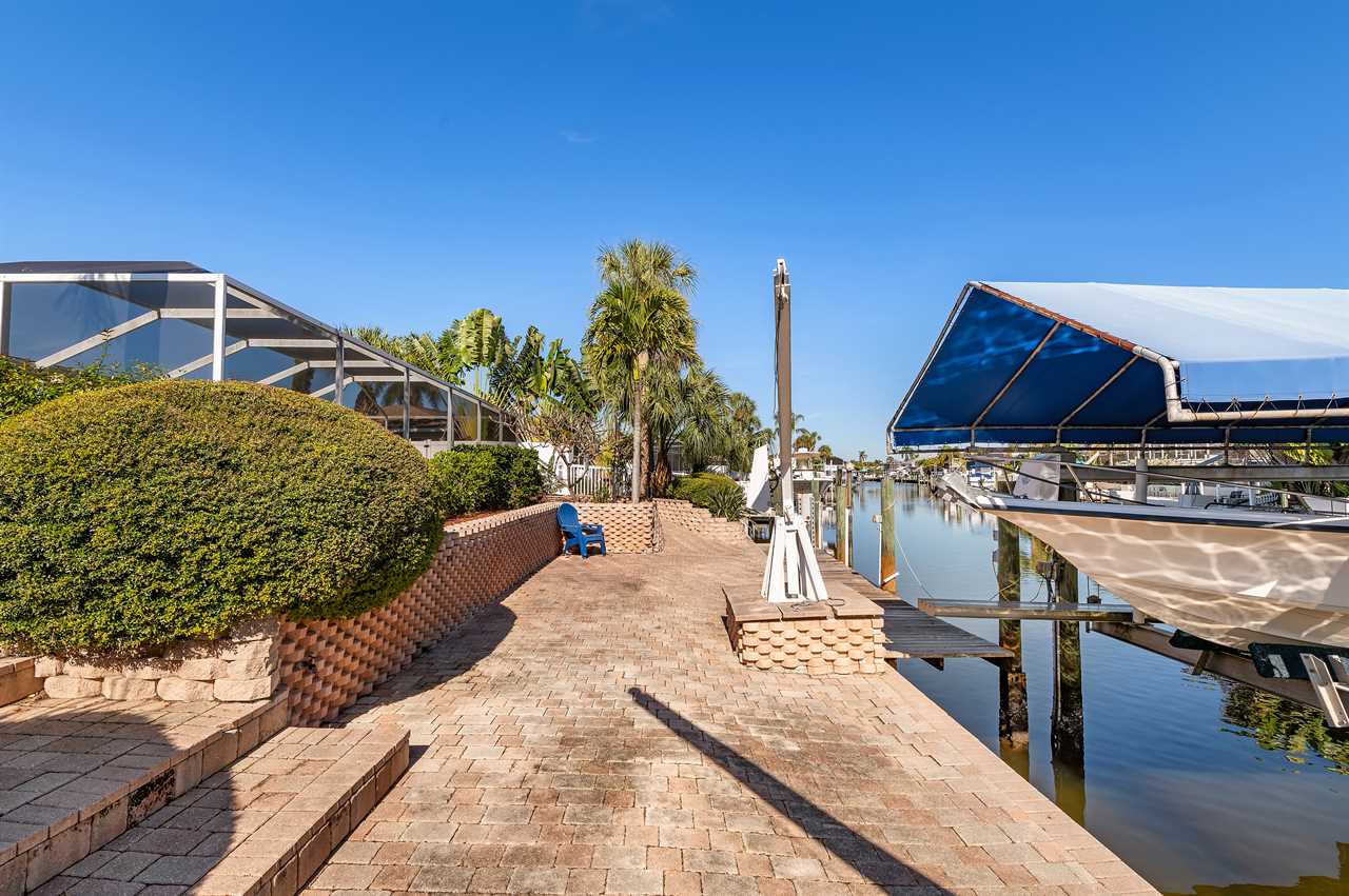 Leading out to the lanai the pool area has a large covered area and also available space to enjoy the sun in the loungers. The private pool can be heated for an additional fee during the colder months of the year. (This property DOES NOT have a spa). Leading out onto the deck is a large brick paver area as well as an extended dock perfect for your boat along with electricity and water.