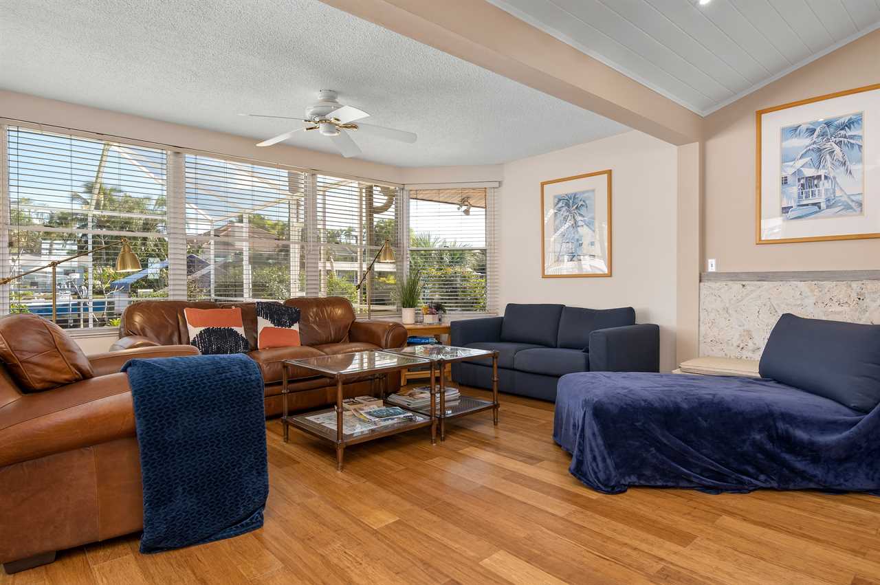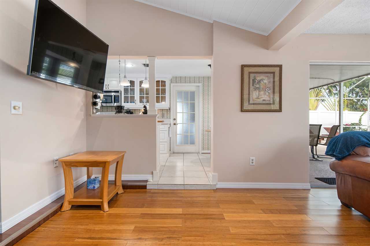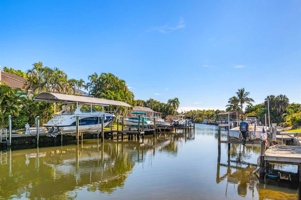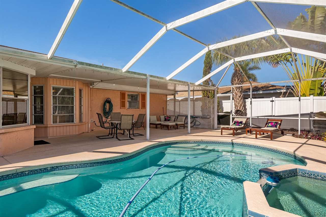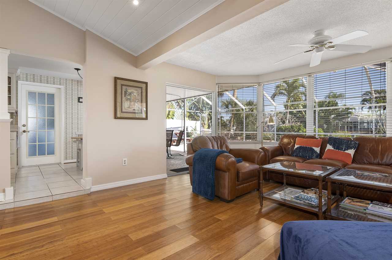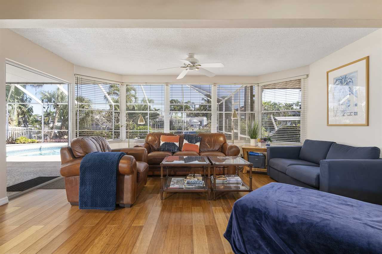 Leading out to the lanai the pool area has a large covered area and also available space to enjoy the sun in the loungers. The private pool can be heated for an additional fee during the colder months of the year. (This property DOES NOT have a spa). Leading out onto the deck is a large brick paver area as well as an extended dock perfect for your boat along with electricity and water.