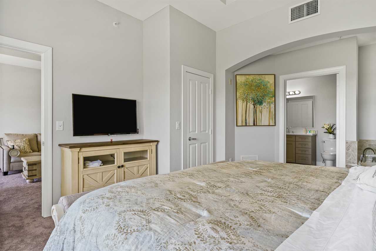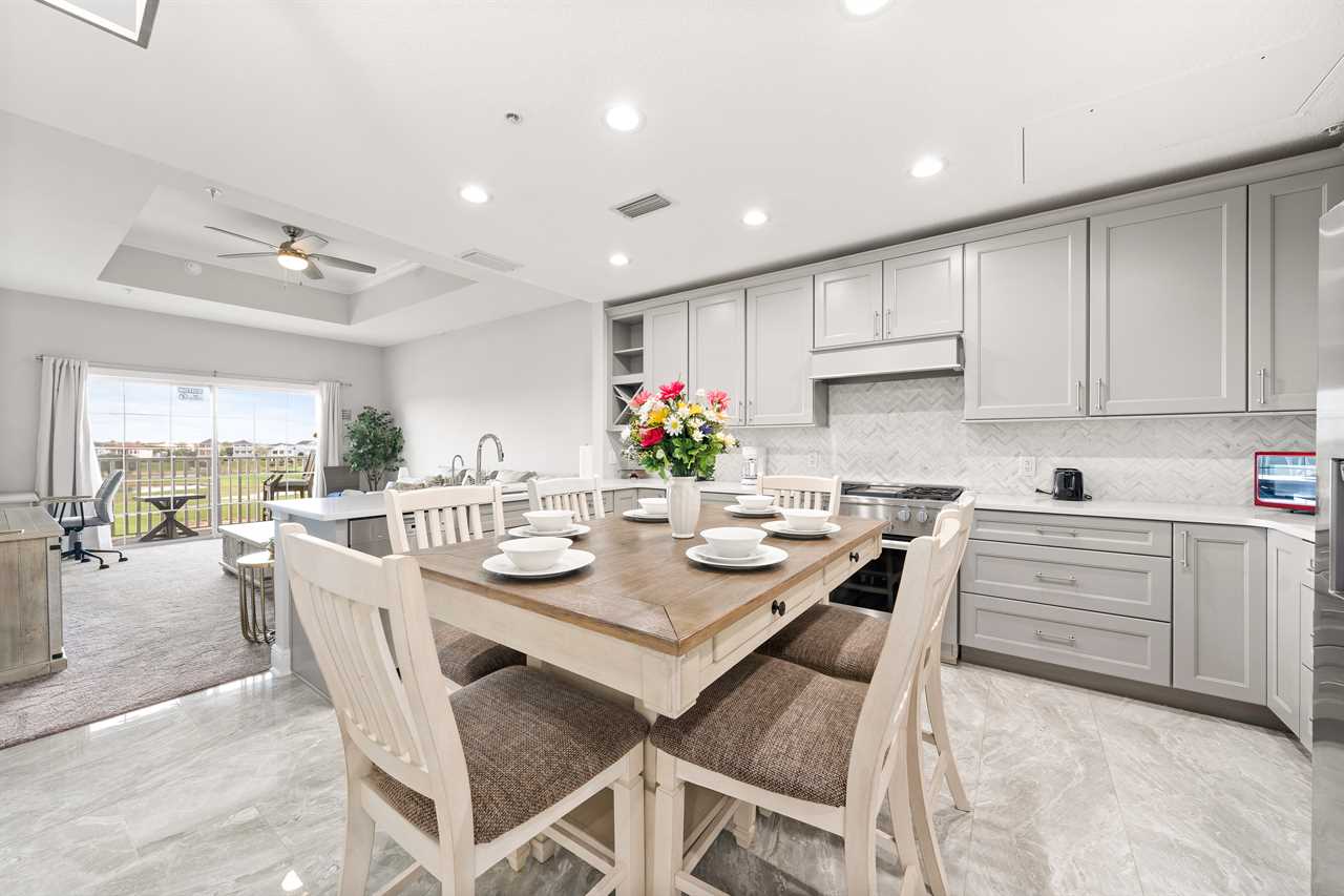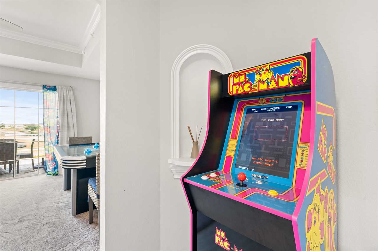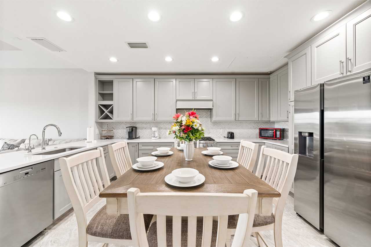 This is a two level townhome, the living room and kitchen are upstairs. This property offers an upgraded large kitchen with stainless steel appliances, granite countertops, and is fully equipped. The dining table has enough seating for 6 and there is four burner gas stove. There is an open floor plan from the kitchen to the updated living room space with a sectional sofa, 70" SMART TV to watch your favorite shows and movies, near the living room is an air hockey table and standing arcade game for more family fun!