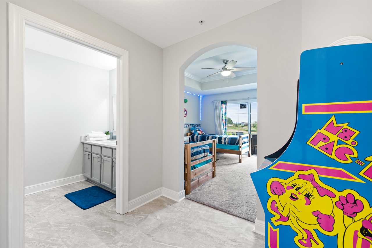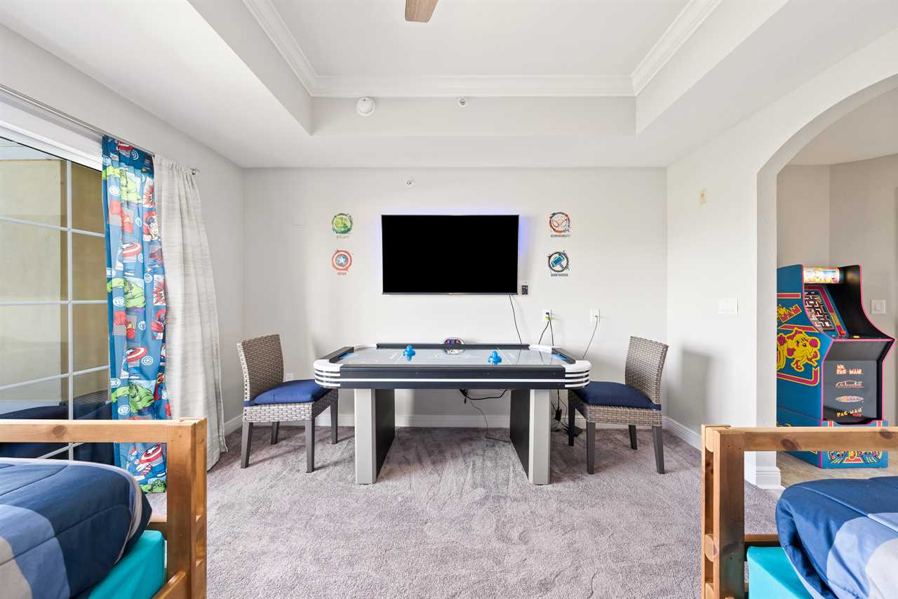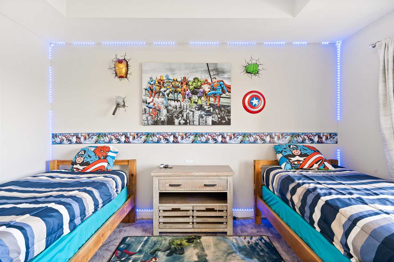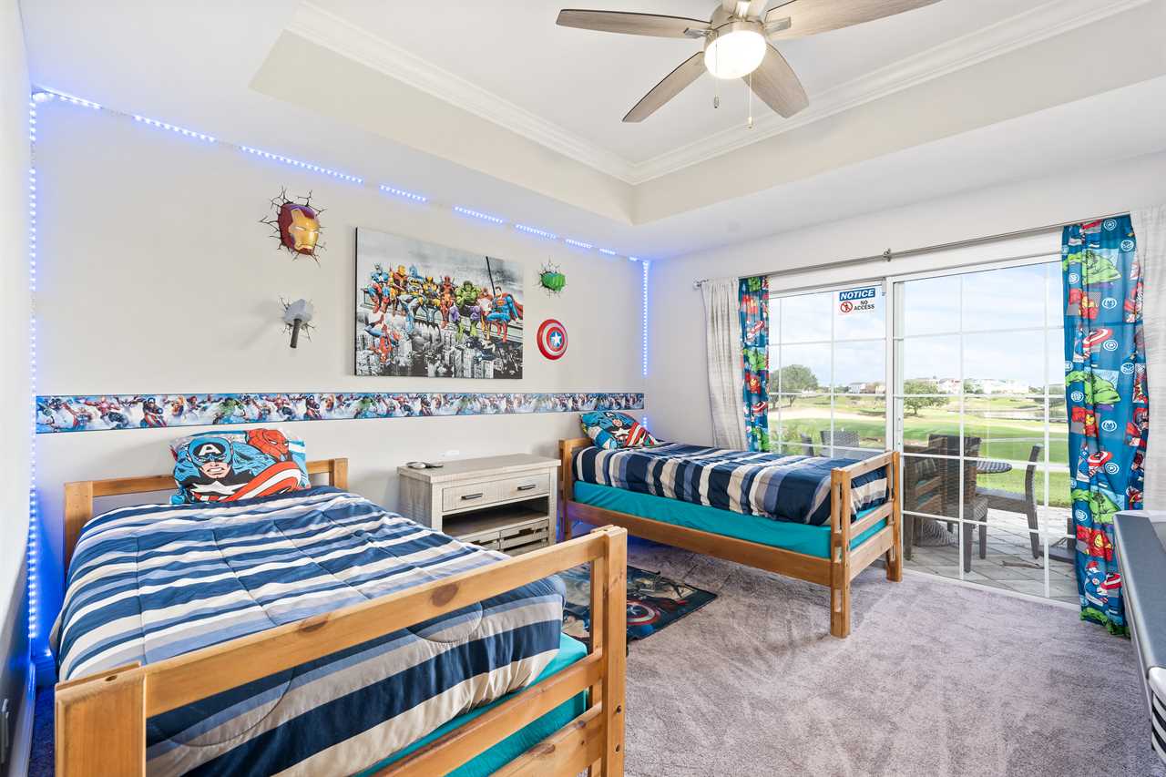 Downstairs there is an en-suite king master bedroom with its own private balcony to enjoy your morning cup of coffee and relax. A 43" Smart TV and the bathroom has a large garden tub in the bedroom and a separate stand-up shower. The second bedroom has a superhero-themed bedroom with two twin beds and a tub/shower combo bathroom. The upstairs en-suite king bedroom has a 43" SMART TV and a beautiful view of the resort golf course. The bathroom has a large bathtub and a separate stand-up shower. Enjoy the patio area with seating for two and soak in the Florida sun!