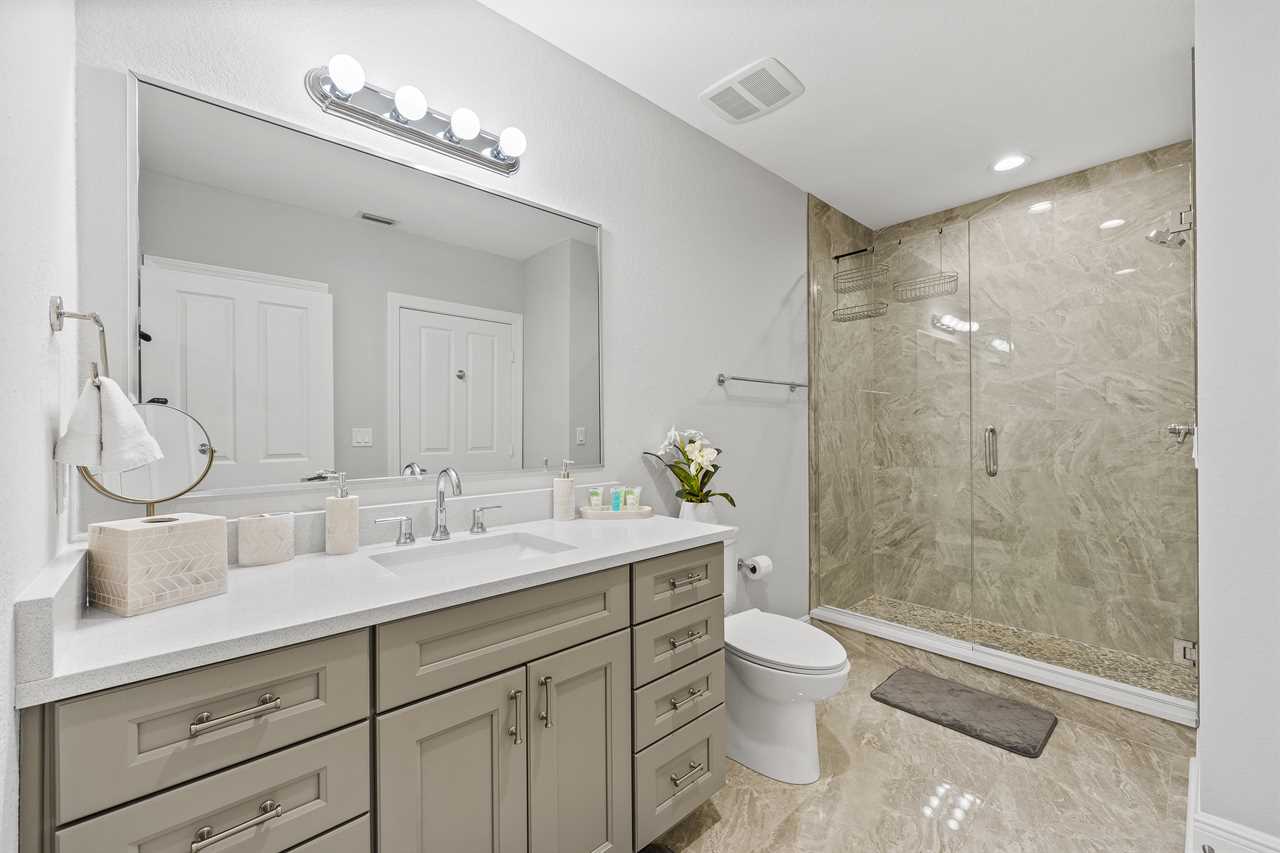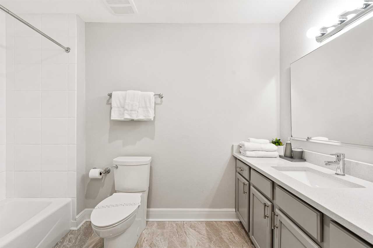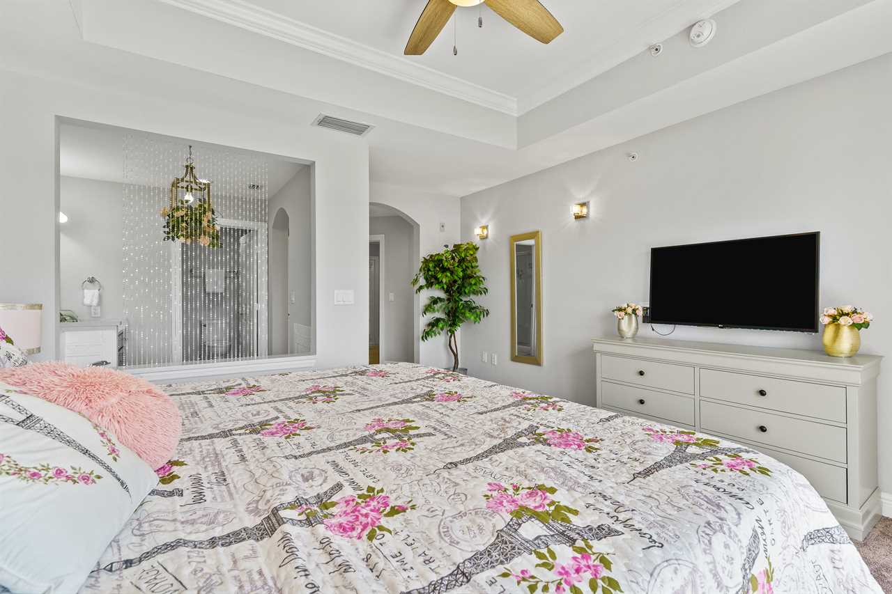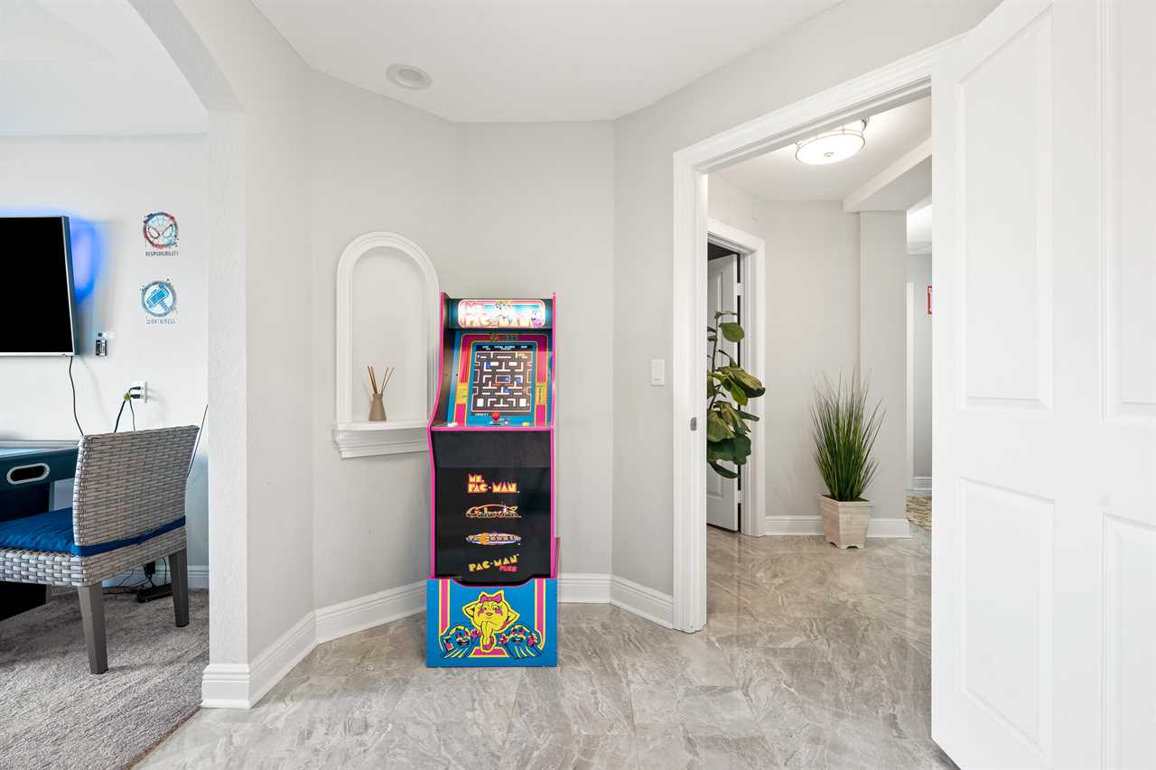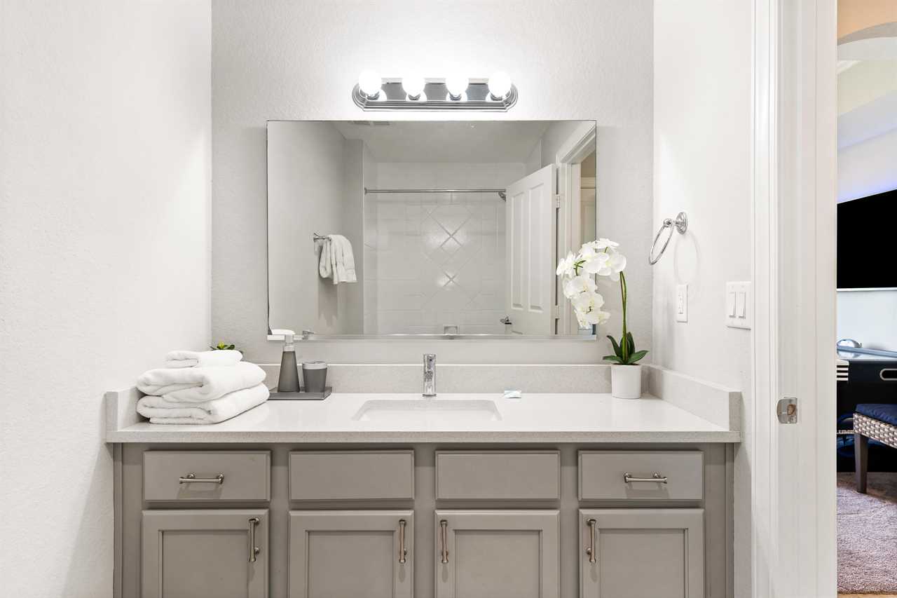 Downstairs there is an en-suite king master bedroom with its own private balcony to enjoy your morning cup of coffee and relax. A 43" Smart TV and the bathroom has a large garden tub in the bedroom and a separate stand-up shower. The second bedroom has a superhero-themed bedroom with two twin beds and a tub/shower combo bathroom. The upstairs en-suite king bedroom has a 43" SMART TV and a beautiful view of the resort golf course. The bathroom has a large bathtub and a separate stand-up shower. Enjoy the patio area with seating for two and soak in the Florida sun!