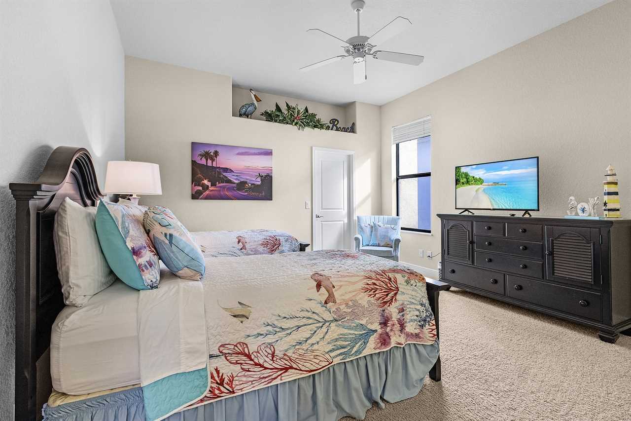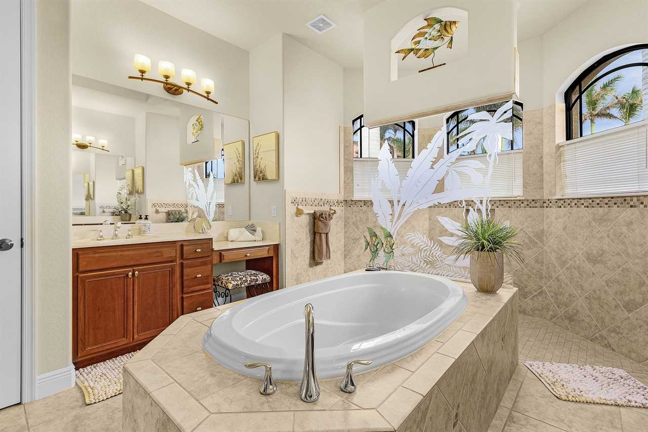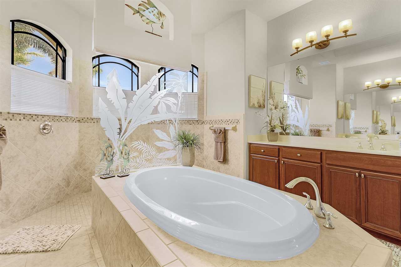 The large master suite has access to the pool deck, flat screen streaming capable TV, and two large walk-in closets. Adjoining the master suite is the luxury master bath with dual vanities, centered garden tub, and walk-around shower.