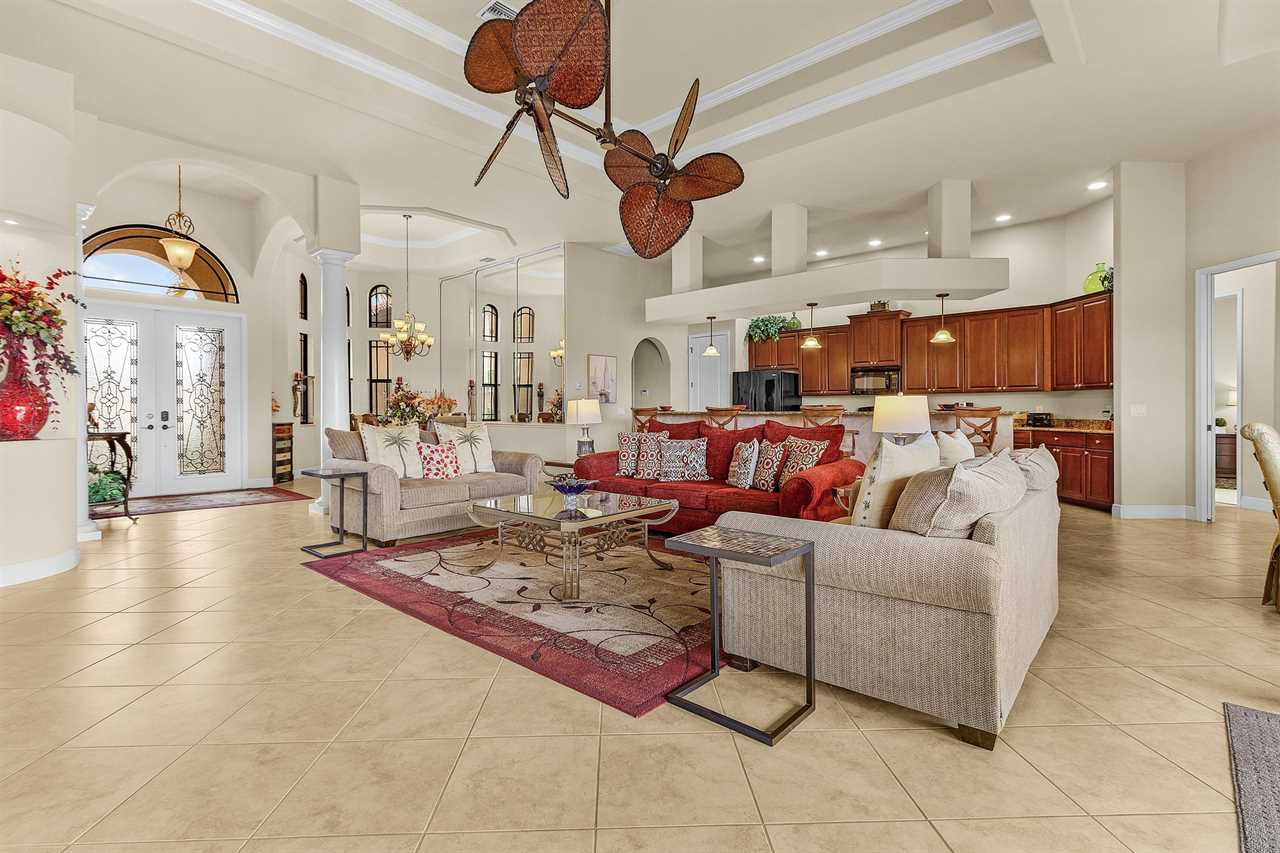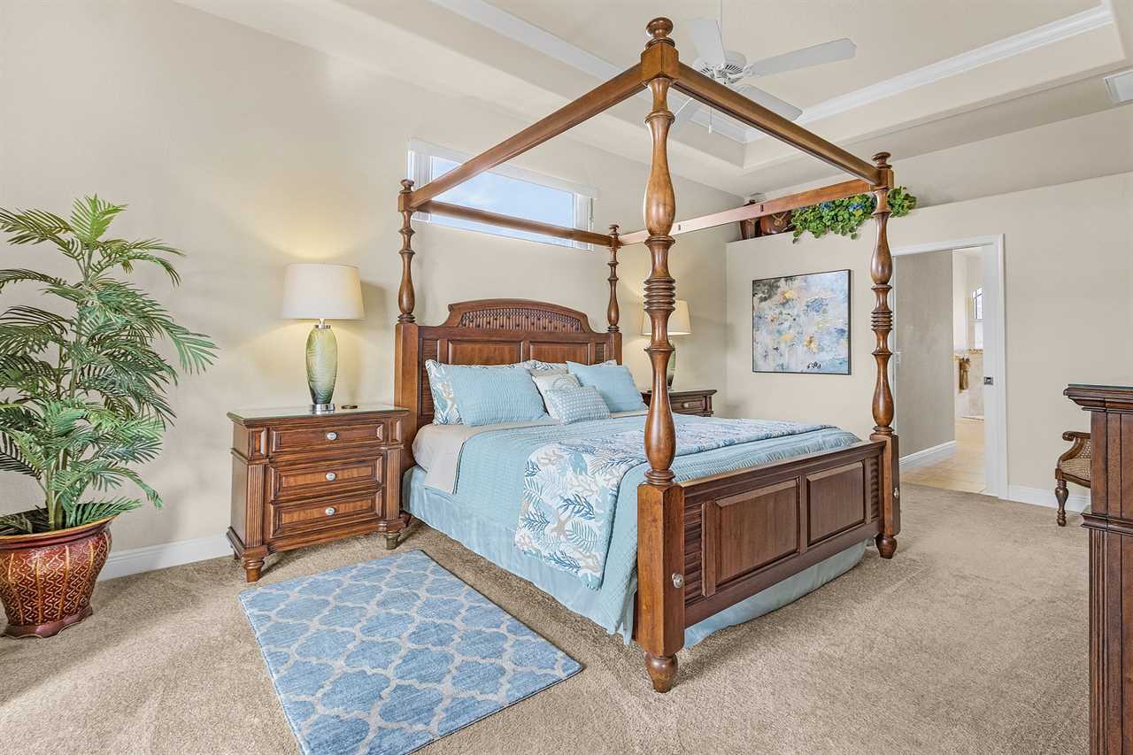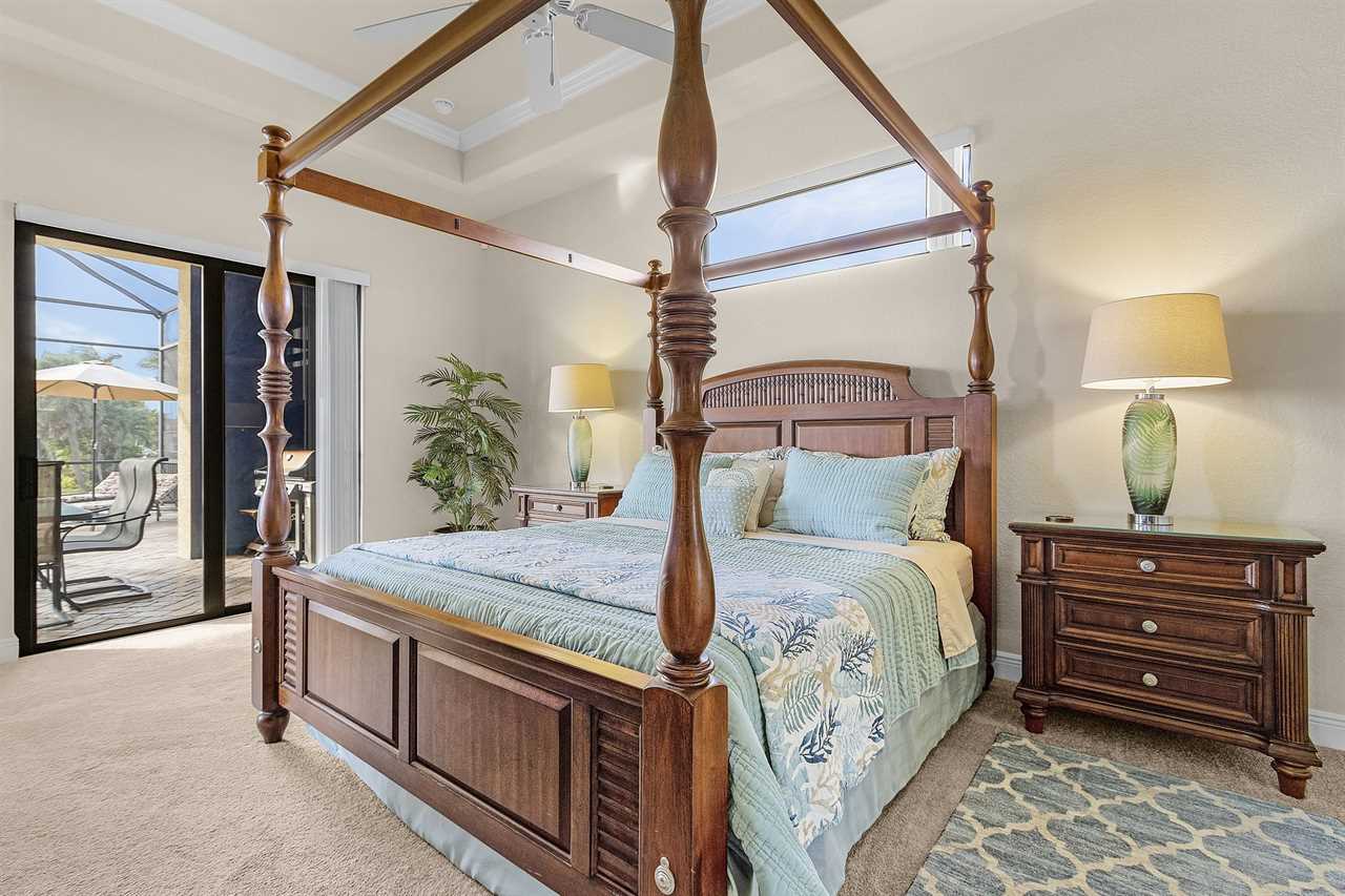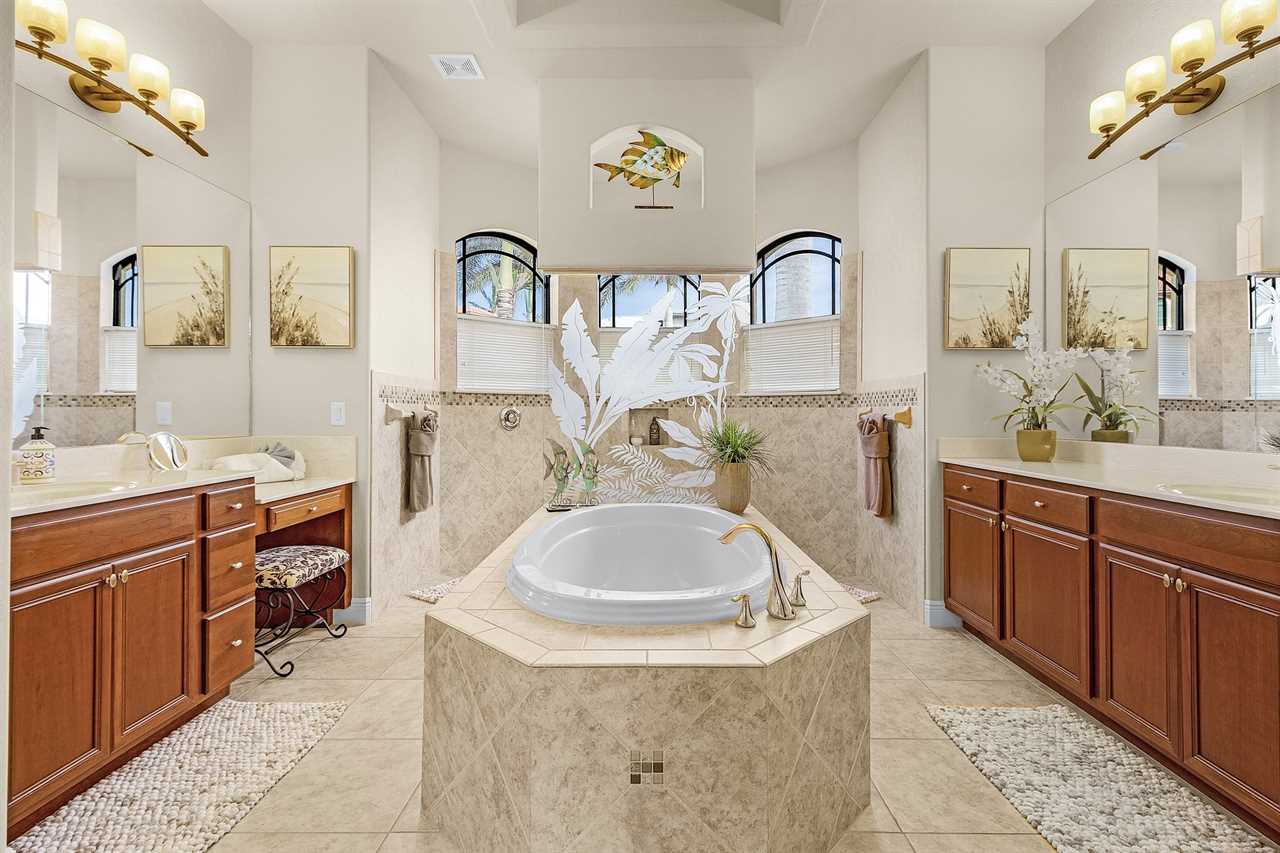 The large master suite has access to the pool deck, flat screen streaming capable TV, and two large walk-in closets. Adjoining the master suite is the luxury master bath with dual vanities, centered garden tub, and walk-around shower.