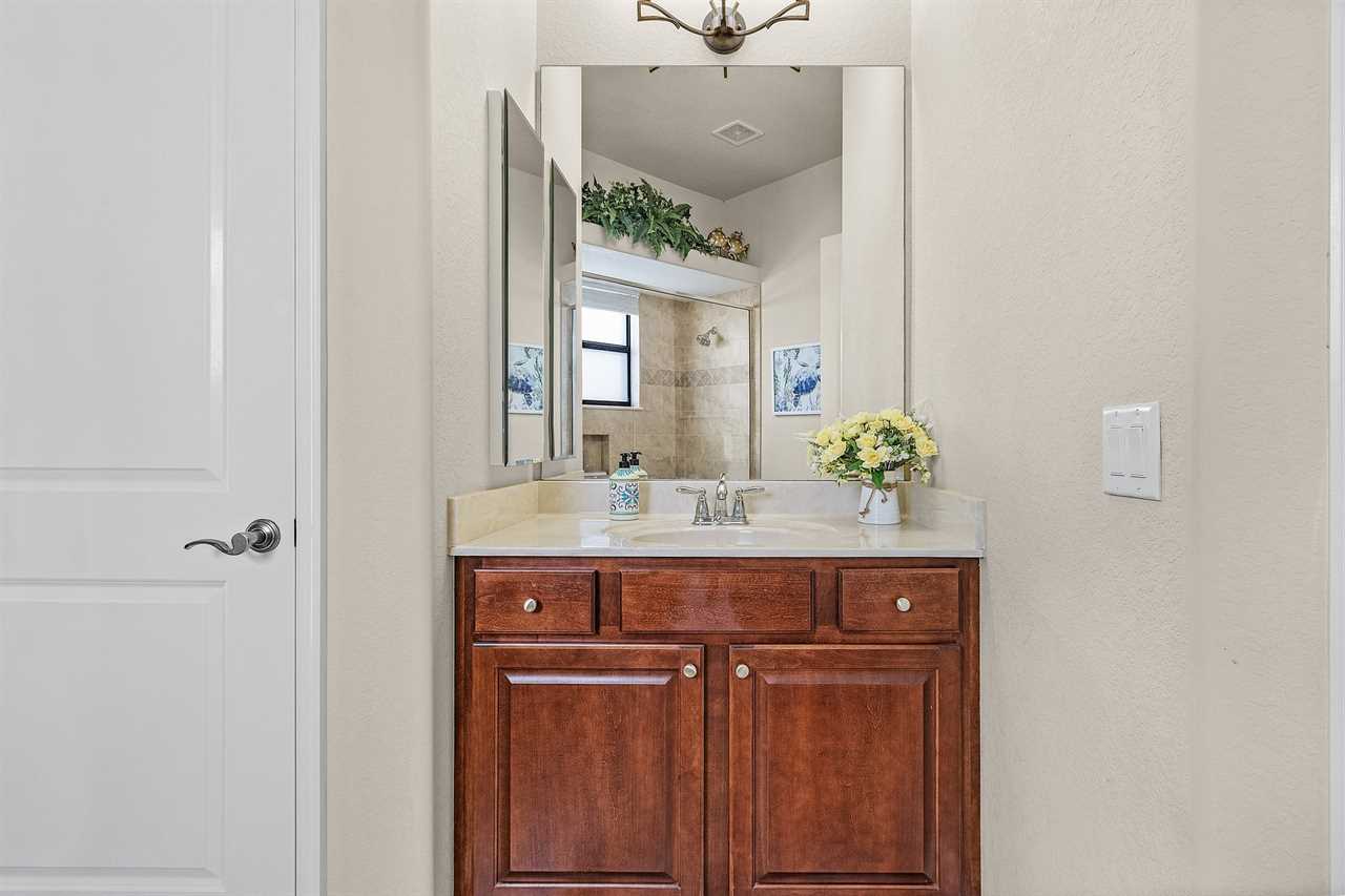 Split from the master suite on the other side of the home are two bedrooms, sharing a large bath with oversized walk-in shower and pool access. The two oversized bedrooms offer large walk-in closets. One of the bedrooms also has access to the pool deck.