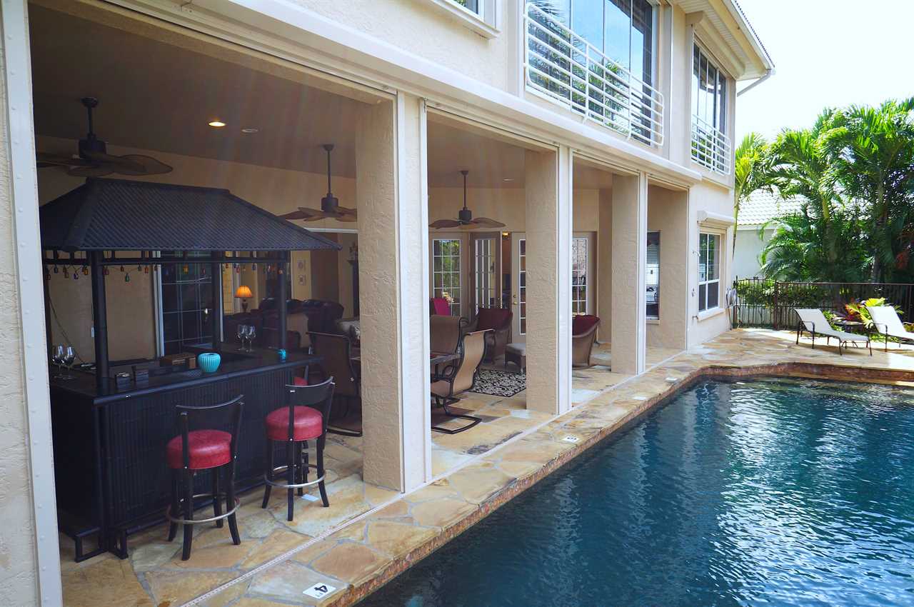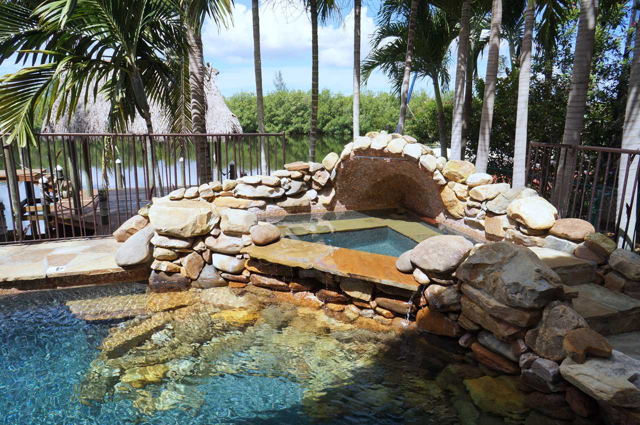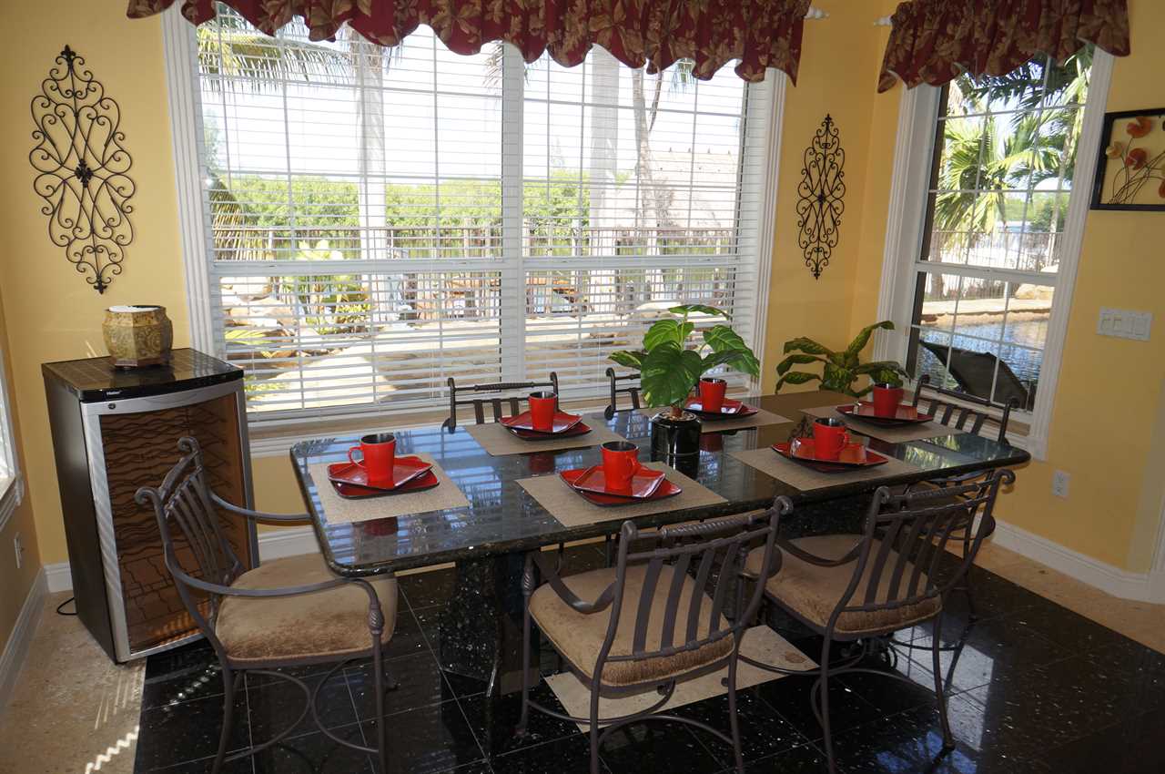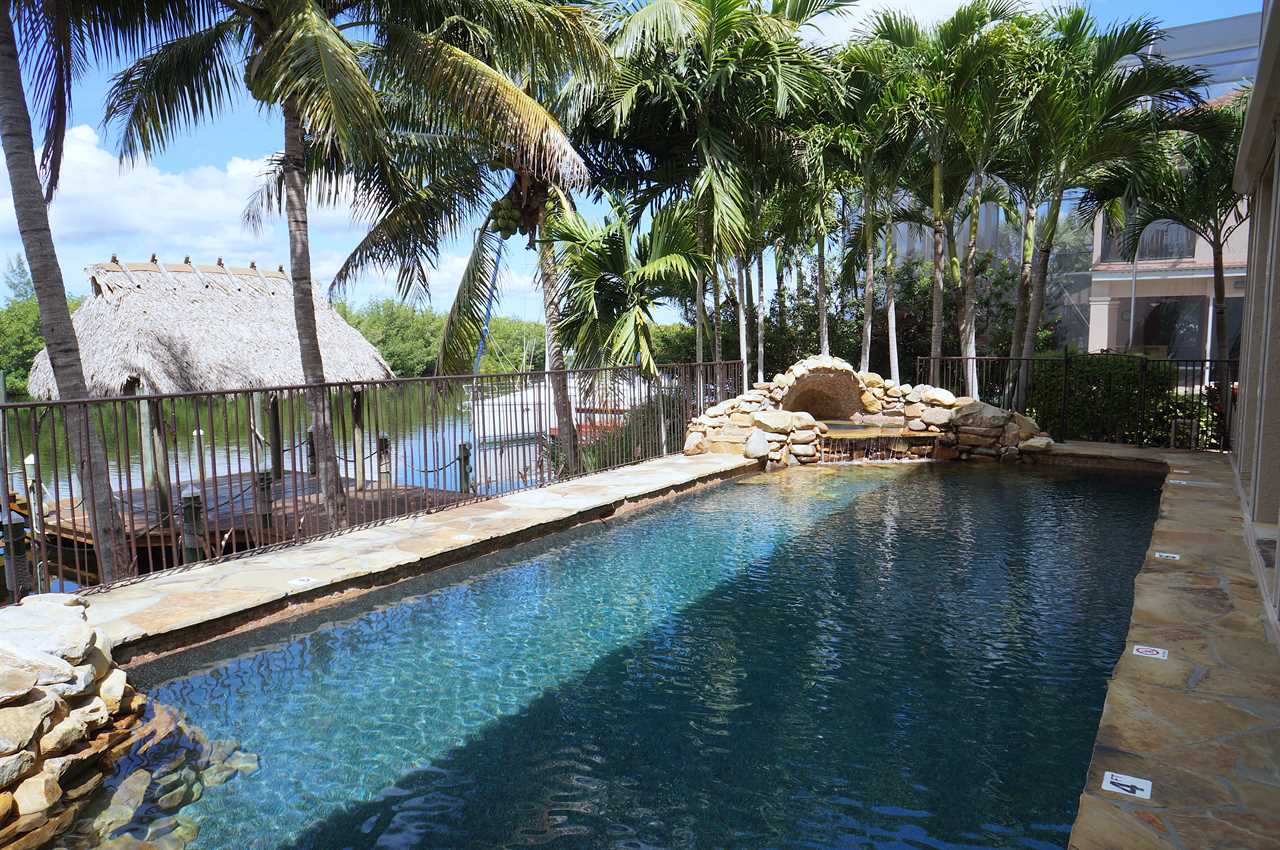 This gorgeous estate home is embedded in mature palm trees and tropical foliage. Located in one of the most sought-after areas in Cape Coral called Peninsula Pointe, Palm Villa is very close to the shopping, dining and entertainment opportunities Cape Harbor has to offer as well as that of Cape Coral and Fort Myers. Tasteful, stylish and comfortable décor includes 3 full bedrooms and bathrooms plus a fourth game room with sofa bed; wall-mounted flat screen TVs in all bedrooms; full gourmet kitchen with gas range, double-oven and sub zero refrigerator and freezer; formal dining room; in- kitchen informal dining for 6; and topped off by the out-of-this-world patio, pool and spa area! Additional amenities include a home gym and dry sauna that is not only equipped nicely but also offers the best views one could have while working out over the protected Florida Mangroves. Wildlife viewing is fantastic from the master bedroom, kitchen and dock area. Home is close to Sanibel Island (30-minute drive, or less by boat); Naples (less than an hour by car). NO PETS please.