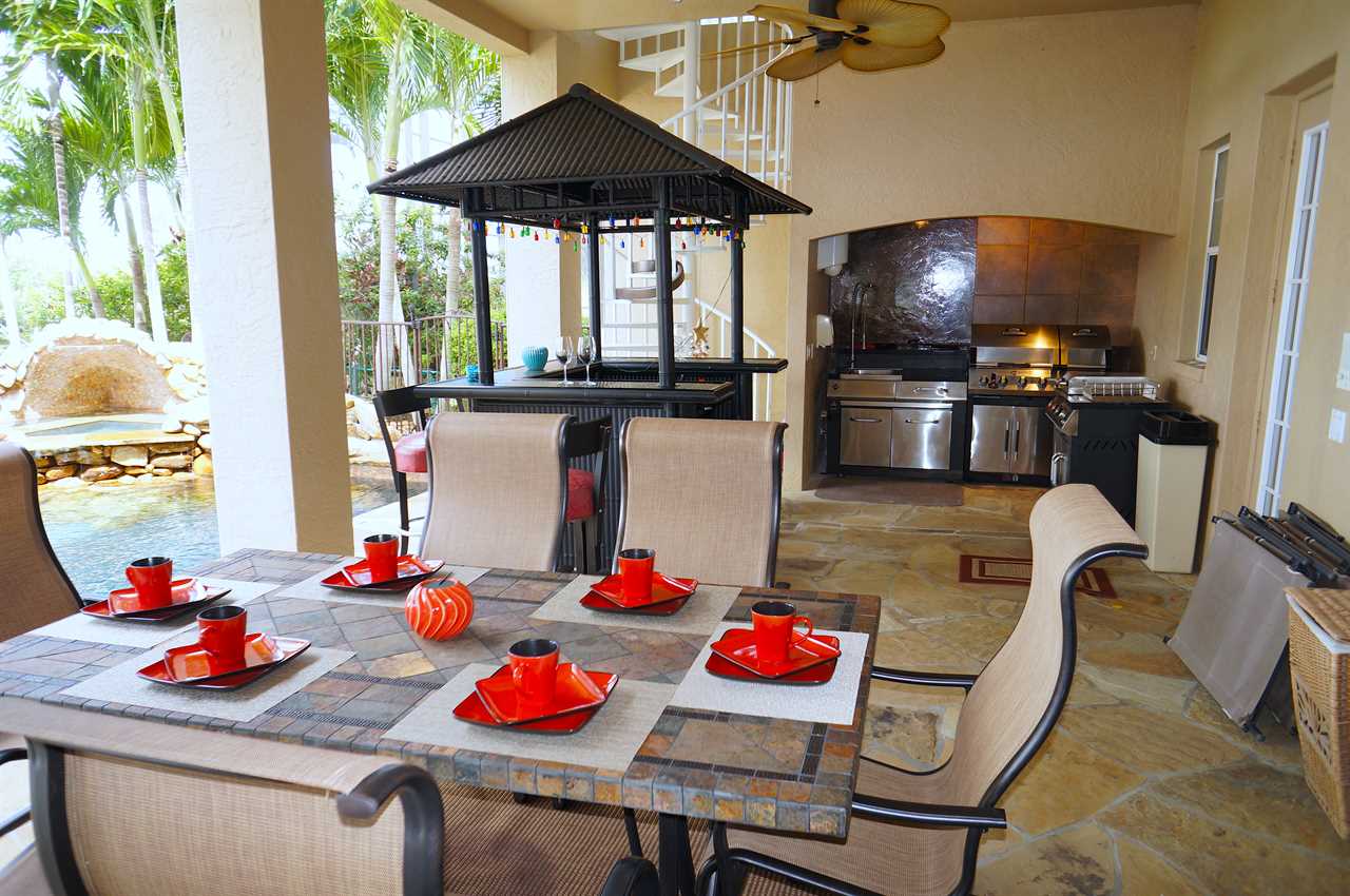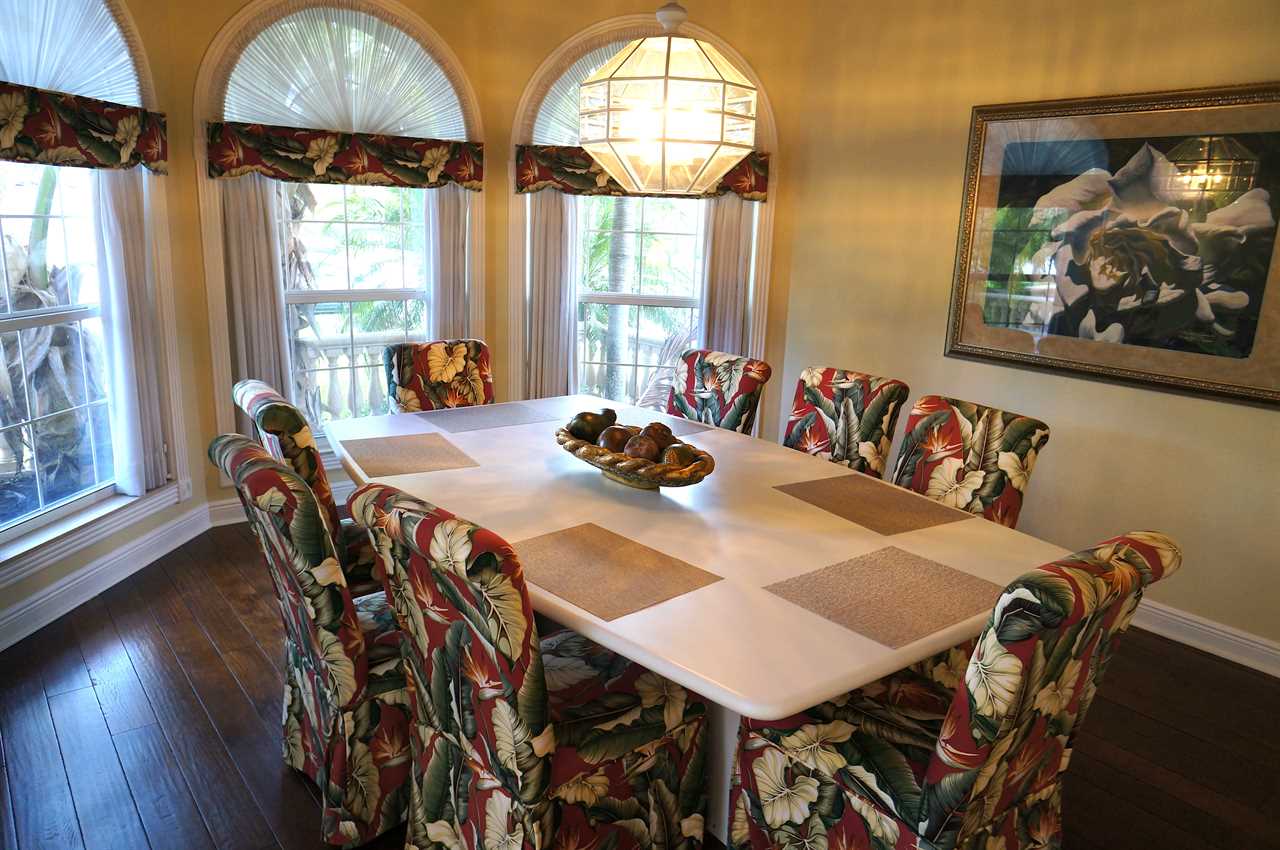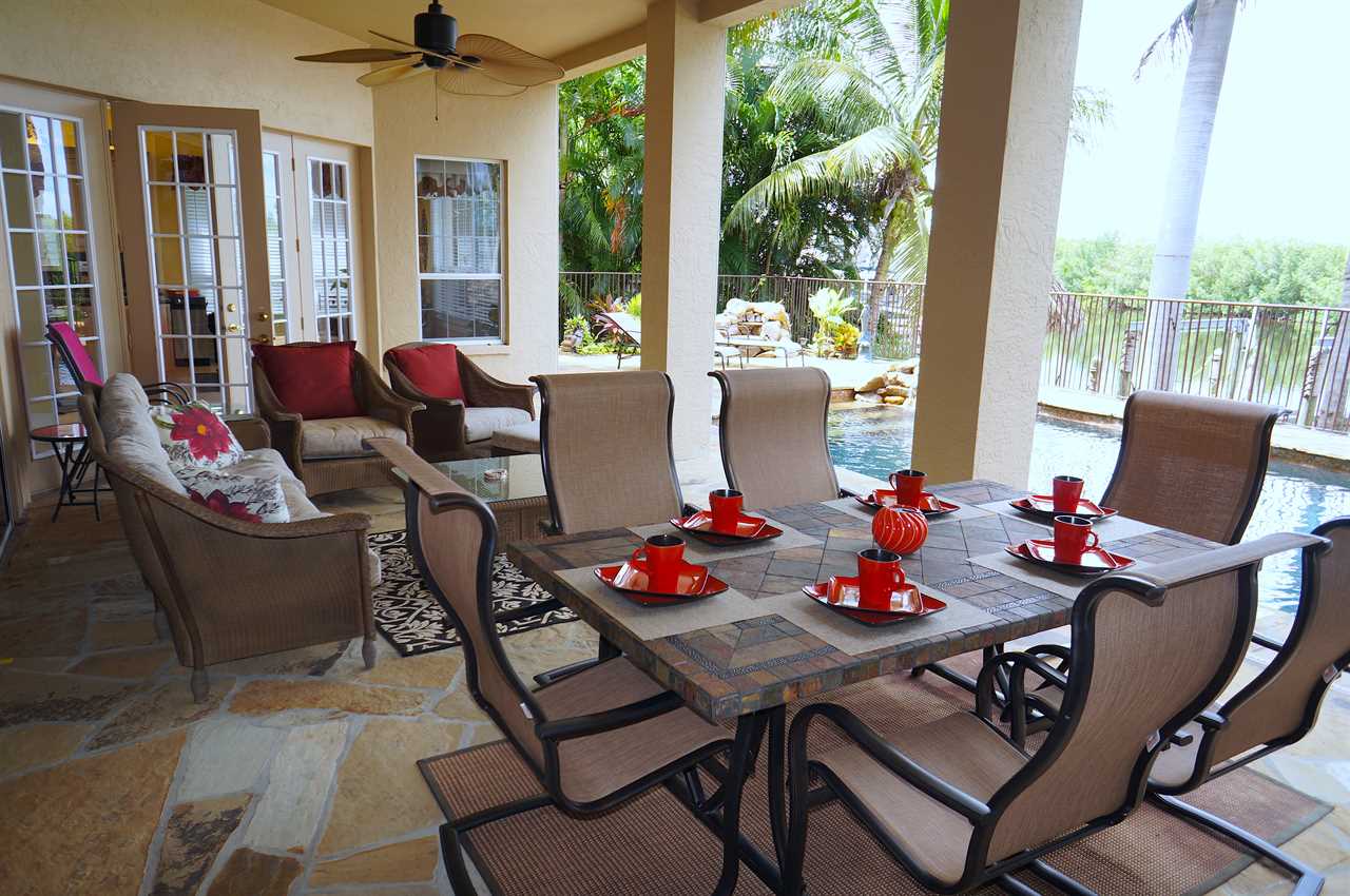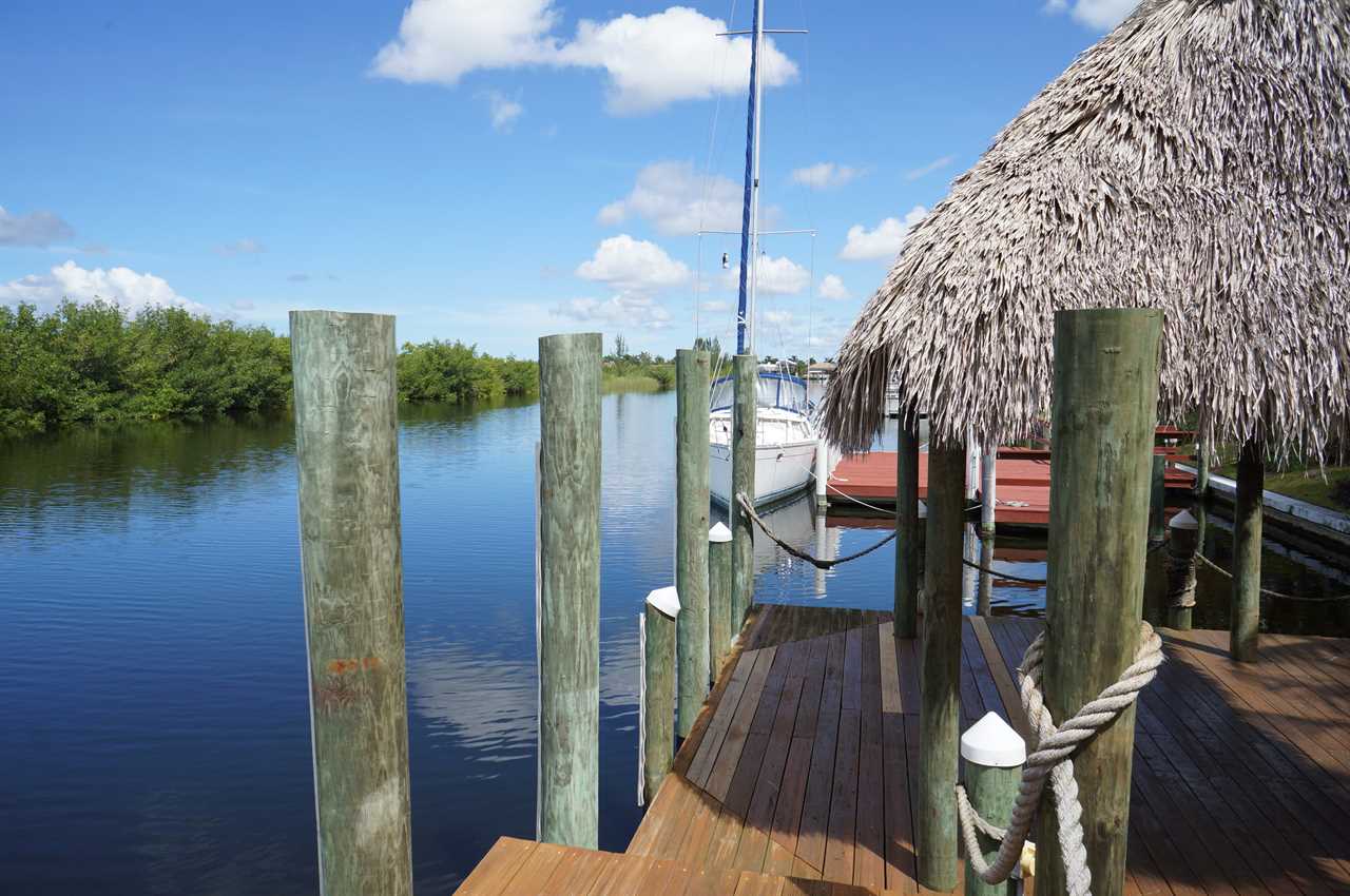 This gorgeous estate home is embedded in mature palm trees and tropical foliage. Located in one of the most sought-after areas in Cape Coral called Peninsula Pointe, Palm Villa is very close to the shopping, dining and entertainment opportunities Cape Harbor has to offer as well as that of Cape Coral and Fort Myers. Tasteful, stylish and comfortable décor includes 3 full bedrooms and bathrooms plus a fourth game room with sofa bed; wall-mounted flat screen TVs in all bedrooms; full gourmet kitchen with gas range, double-oven and sub zero refrigerator and freezer; formal dining room; in- kitchen informal dining for 6; and topped off by the out-of-this-world patio, pool and spa area! Additional amenities include a home gym and dry sauna that is not only equipped nicely but also offers the best views one could have while working out over the protected Florida Mangroves. Wildlife viewing is fantastic from the master bedroom, kitchen and dock area. Home is close to Sanibel Island (30-minute drive, or less by boat); Naples (less than an hour by car). NO PETS please.