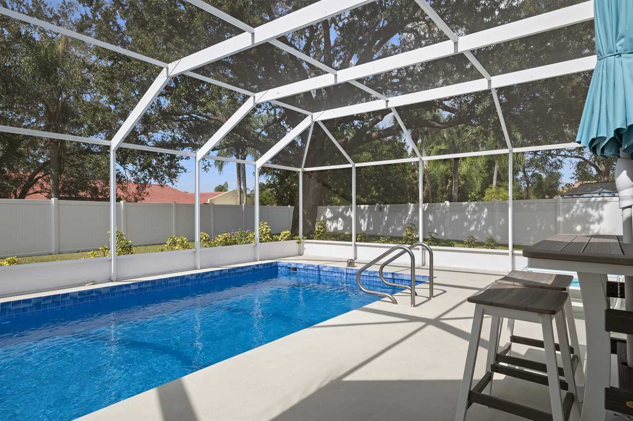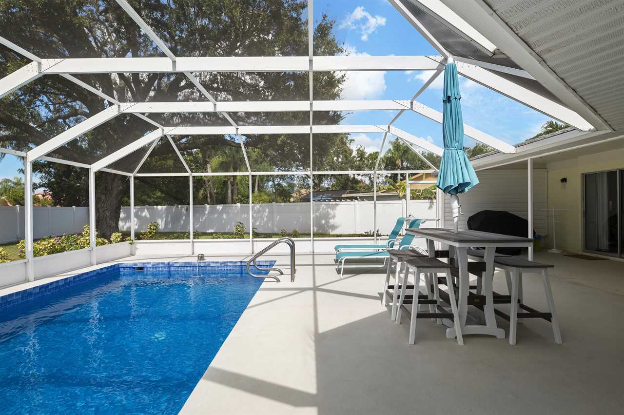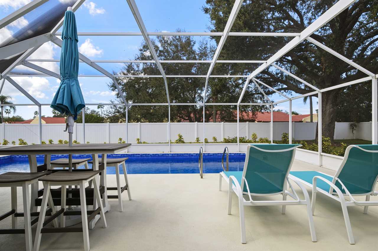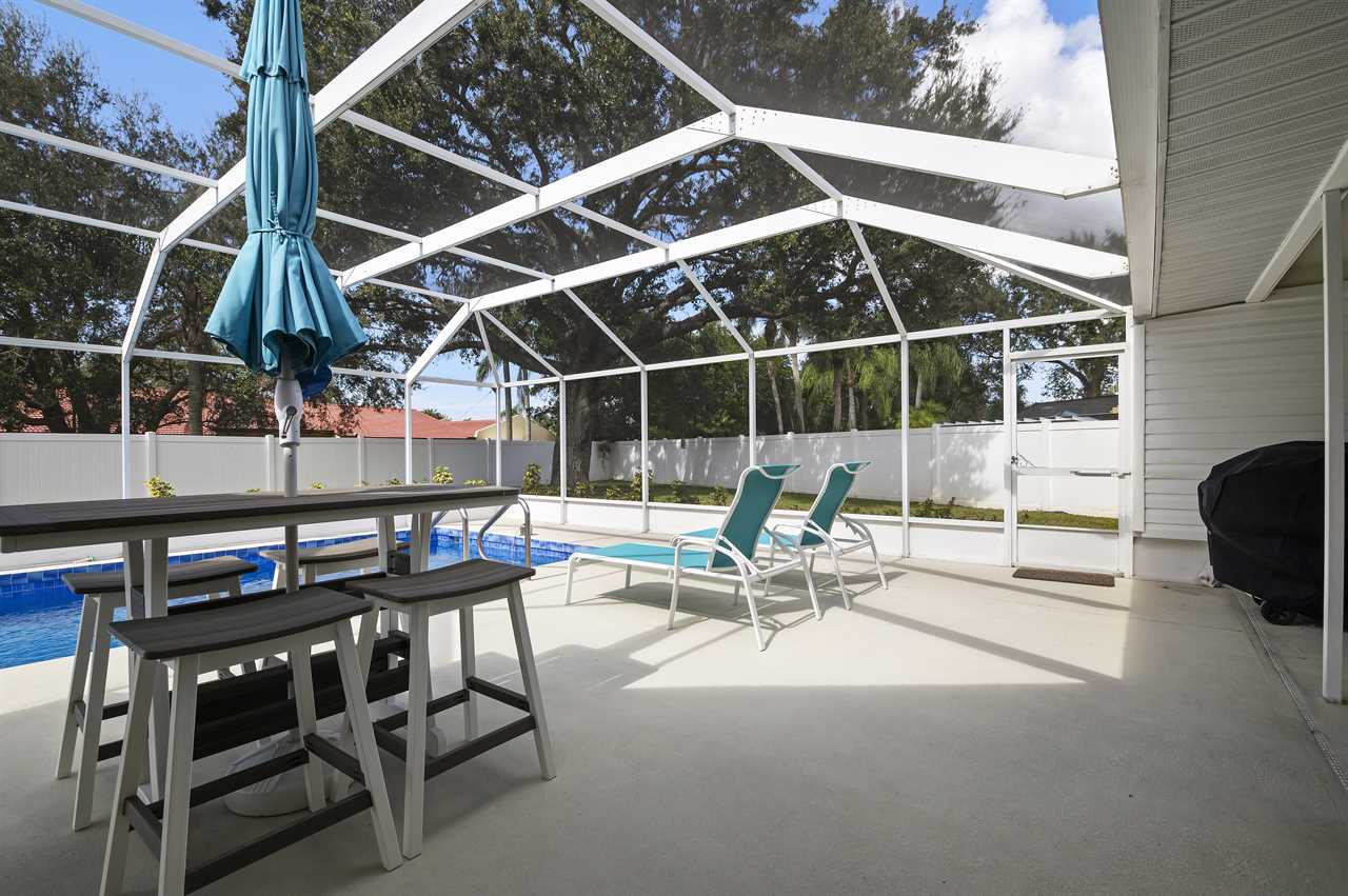 The back has a screened-in pool area as well as a large covered area when enjoying your days poolside! The back deck offers a few sun chairs and a table with an umbrella and stools for enjoying the Florida Sun! An additional TV is mounted outdoors for you to enjoy while sitting poolside! You can sit back and relax here since it is encompassed by the very private and tranquil backyard. As an added bonus you even have a poolside full bathroom that can only be accessed from the pool deck.
