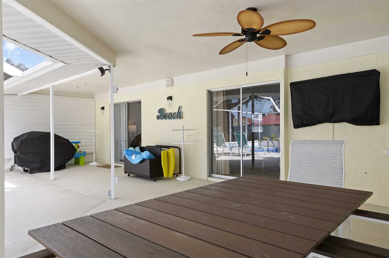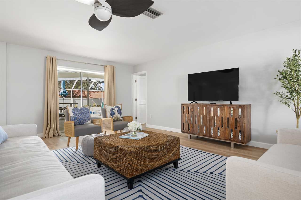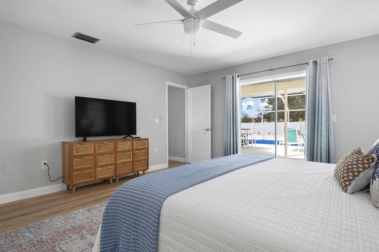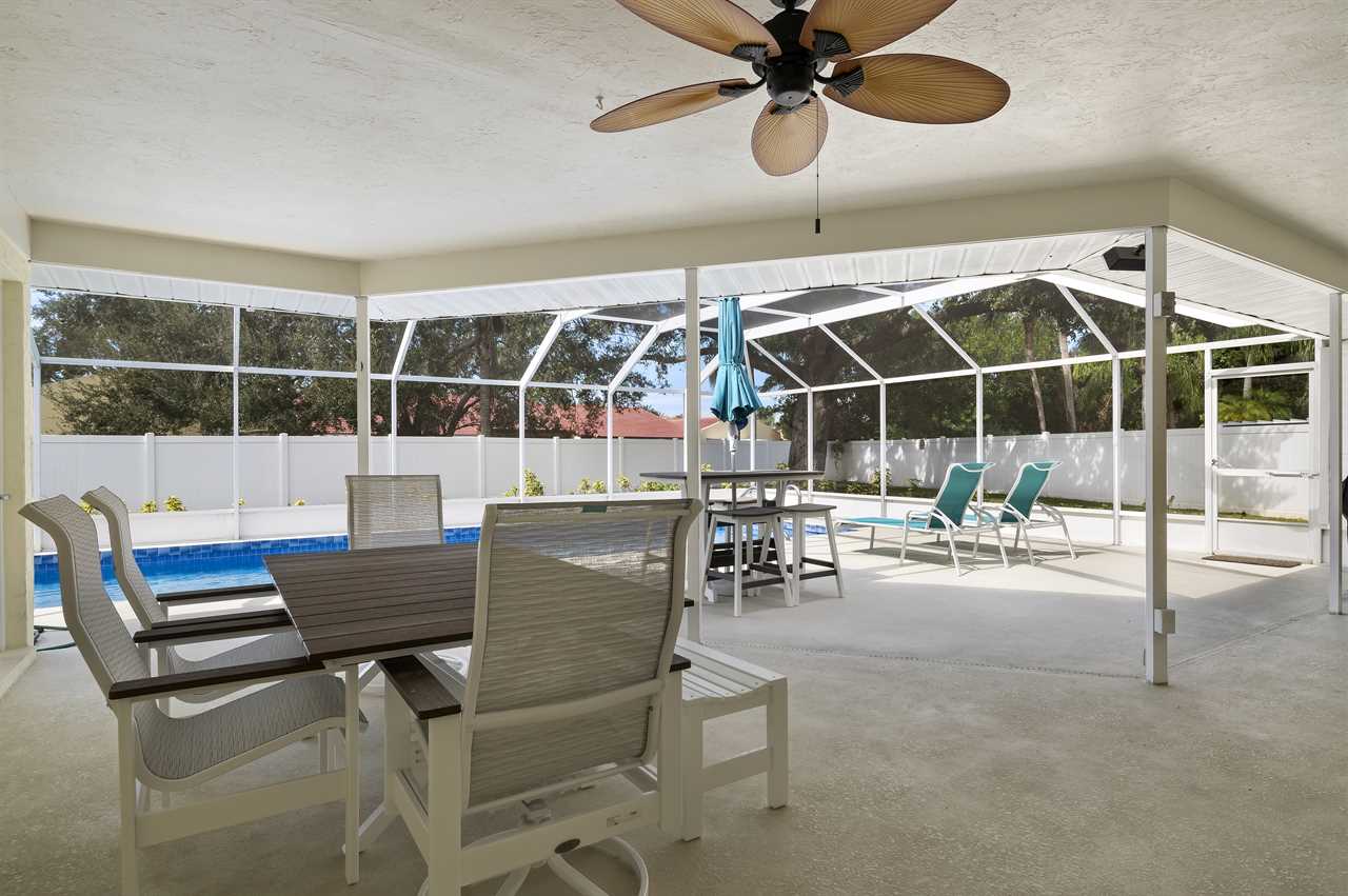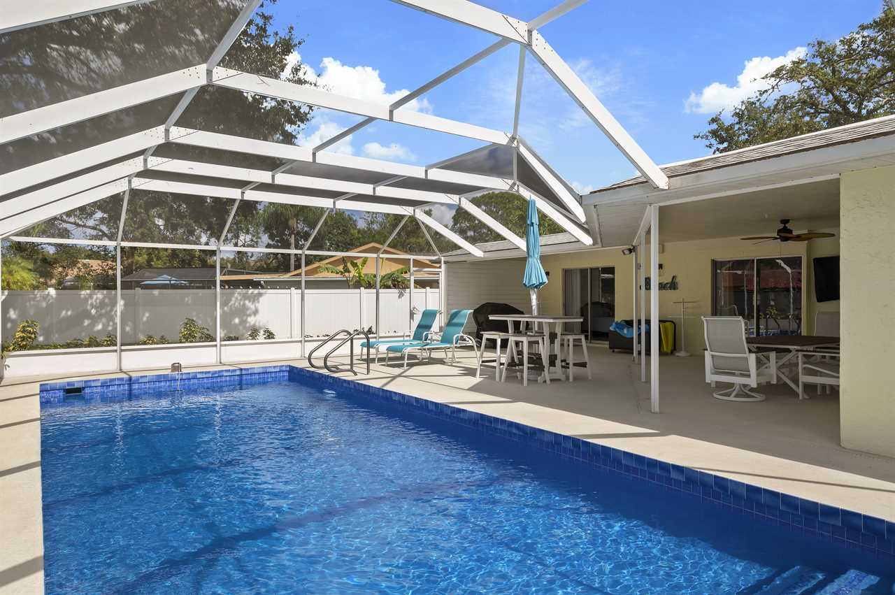 The back has a screened-in pool area as well as a large covered area when enjoying your days poolside! The back deck offers a few sun chairs and a table with an umbrella and stools for enjoying the Florida Sun! An additional TV is mounted outdoors for you to enjoy while sitting poolside! You can sit back and relax here since it is encompassed by the very private and tranquil backyard. As an added bonus you even have a poolside full bathroom that can only be accessed from the pool deck.