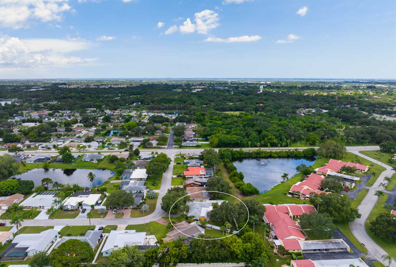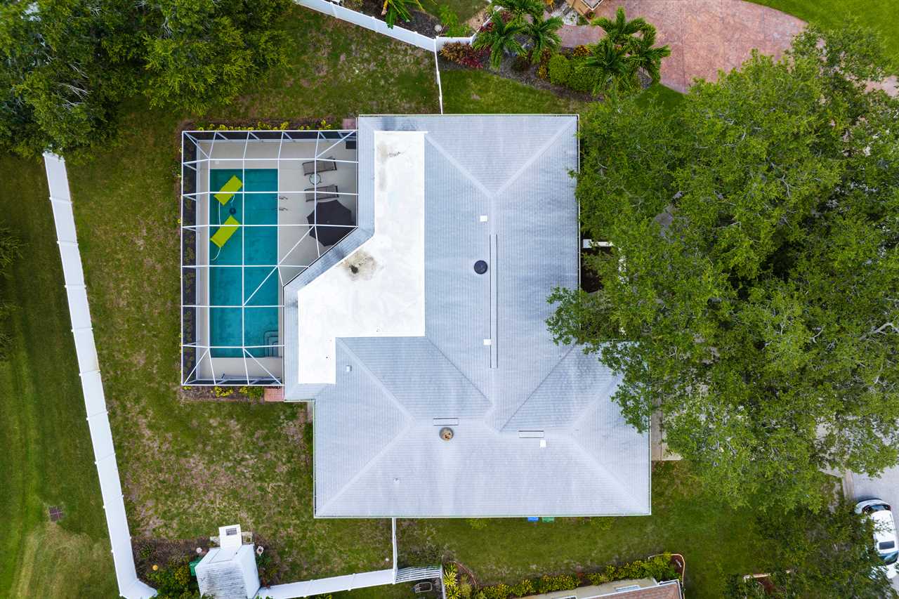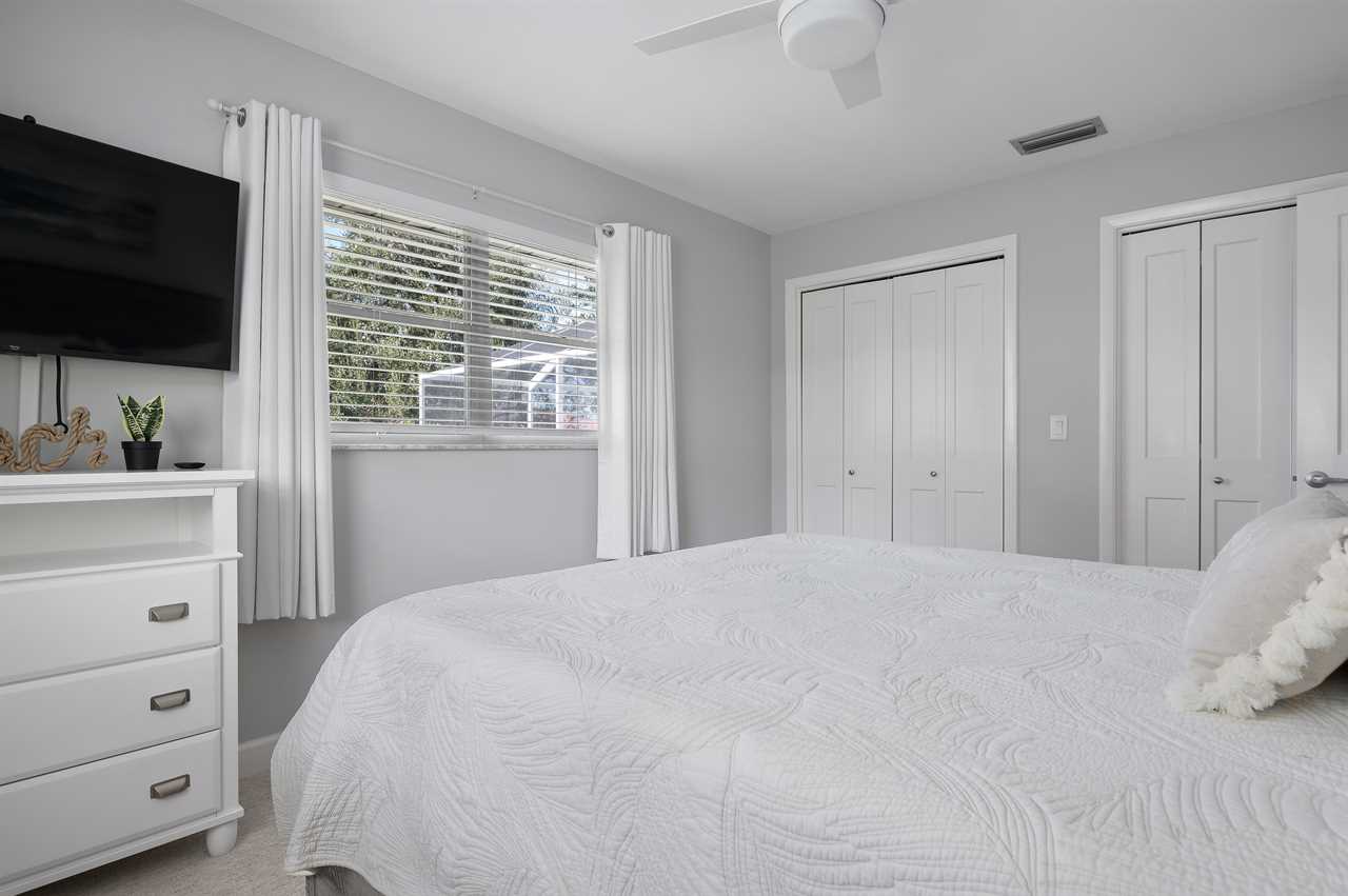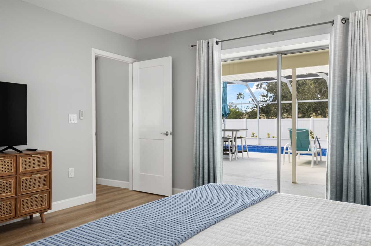 The back has a screened-in pool area as well as a large covered area when enjoying your days poolside! The back deck offers a few sun chairs and a table with an umbrella and stools for enjoying the Florida Sun! An additional TV is mounted outdoors for you to enjoy while sitting poolside! You can sit back and relax here since it is encompassed by the very private and tranquil backyard. As an added bonus you even have a poolside full bathroom that can only be accessed from the pool deck.
