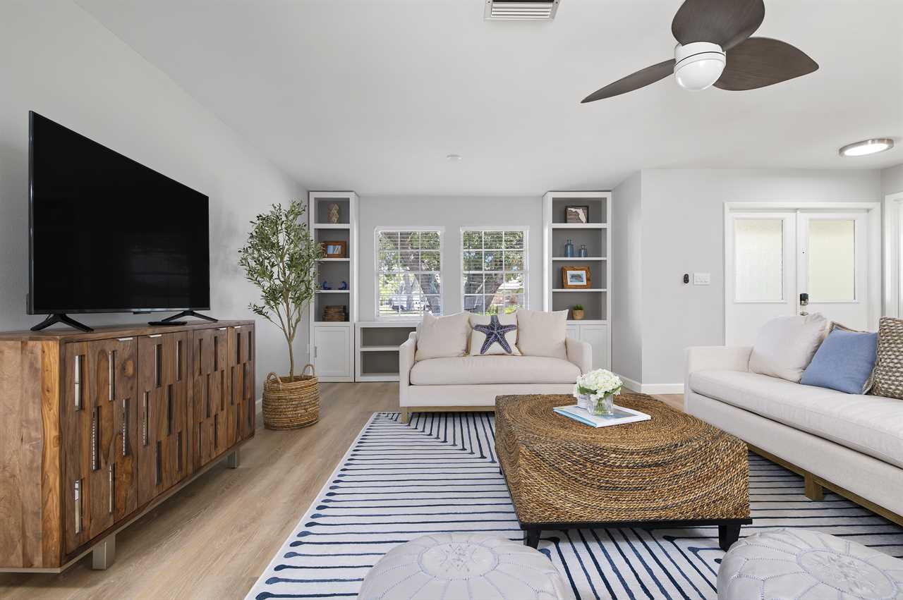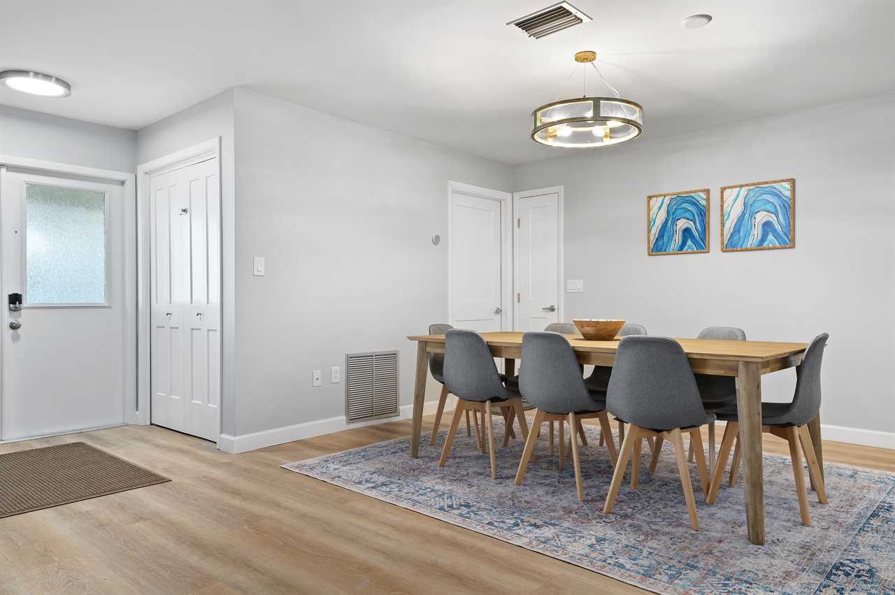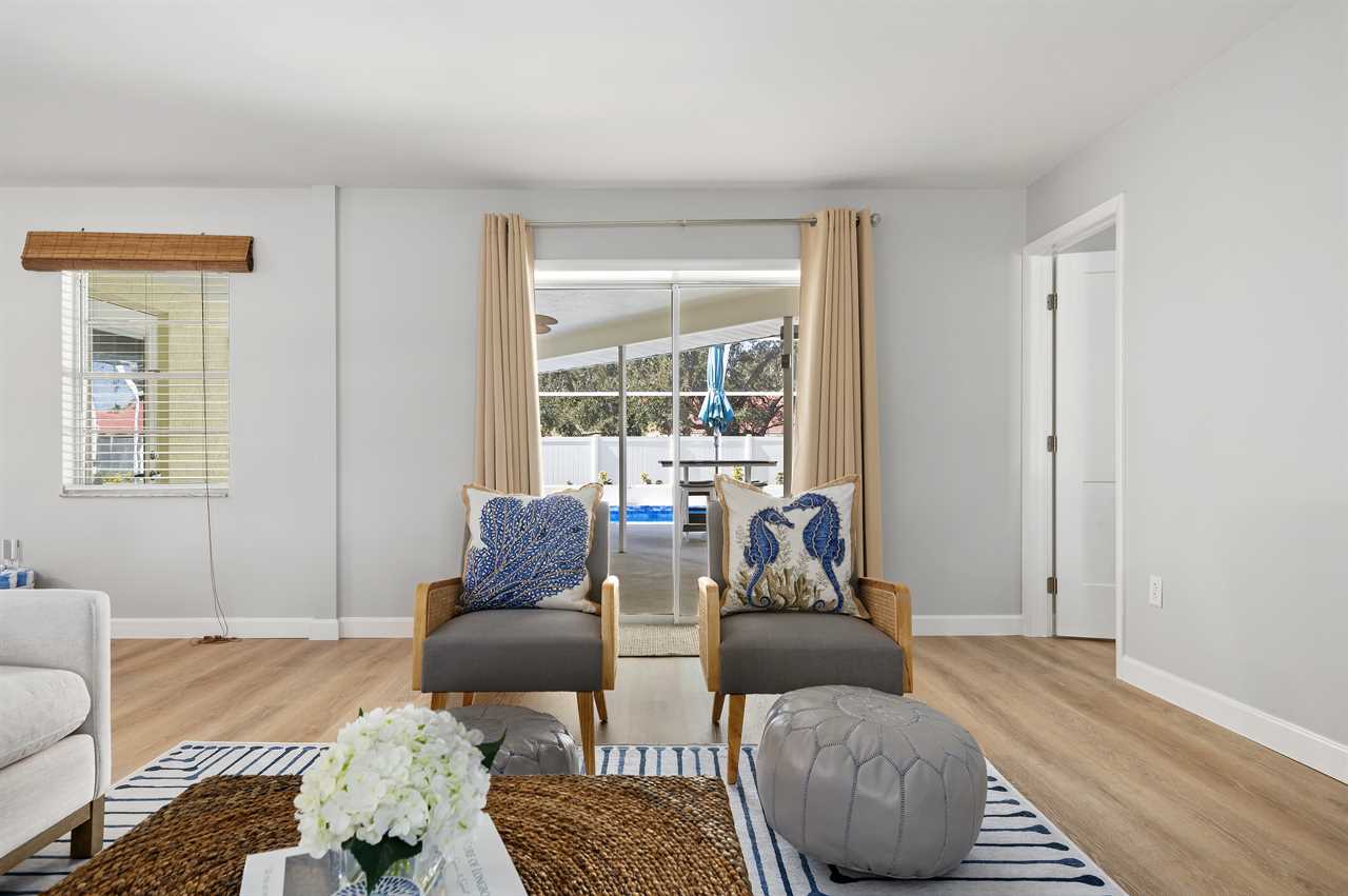 Blue Chill is located in Northwest Bradenton just off the main road of 75th St W. The property offers a large horseshoe driveway with plenty of space for parking. The inside of the home is decorated with a modern coastal feel to make your vacation feel as relaxing as it should. When walking in the front door you are greeted by a wonderful living room with sliding glass doors that open right up to an amazing view of the saltwater pool. The living room offers a Roku smart TV and comfortable seating for all of your entertainment needs. A foldable work station is available as well if you have to complete some work while away.