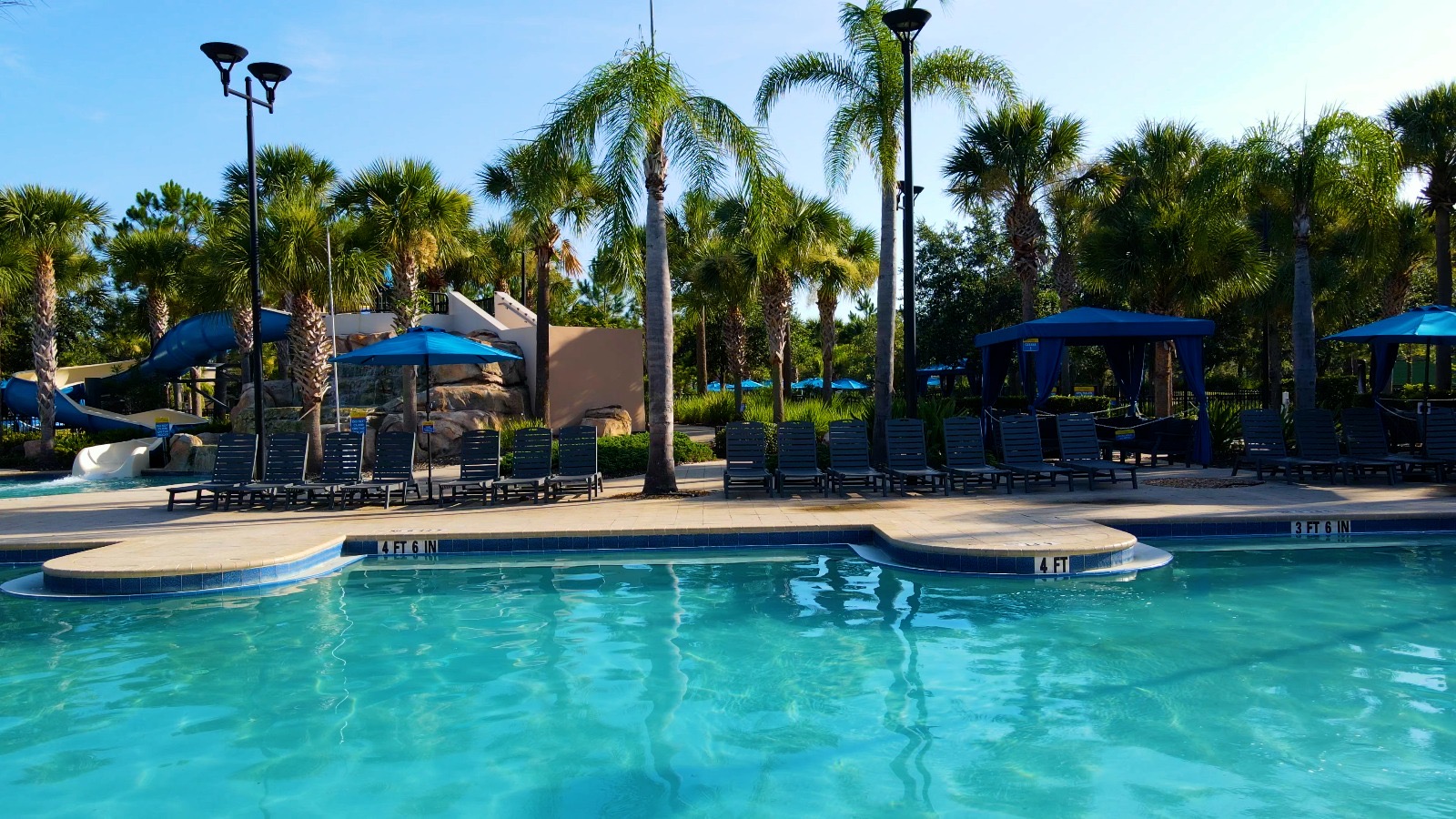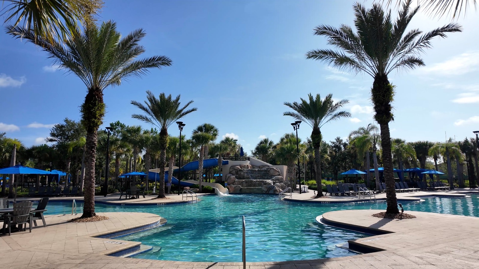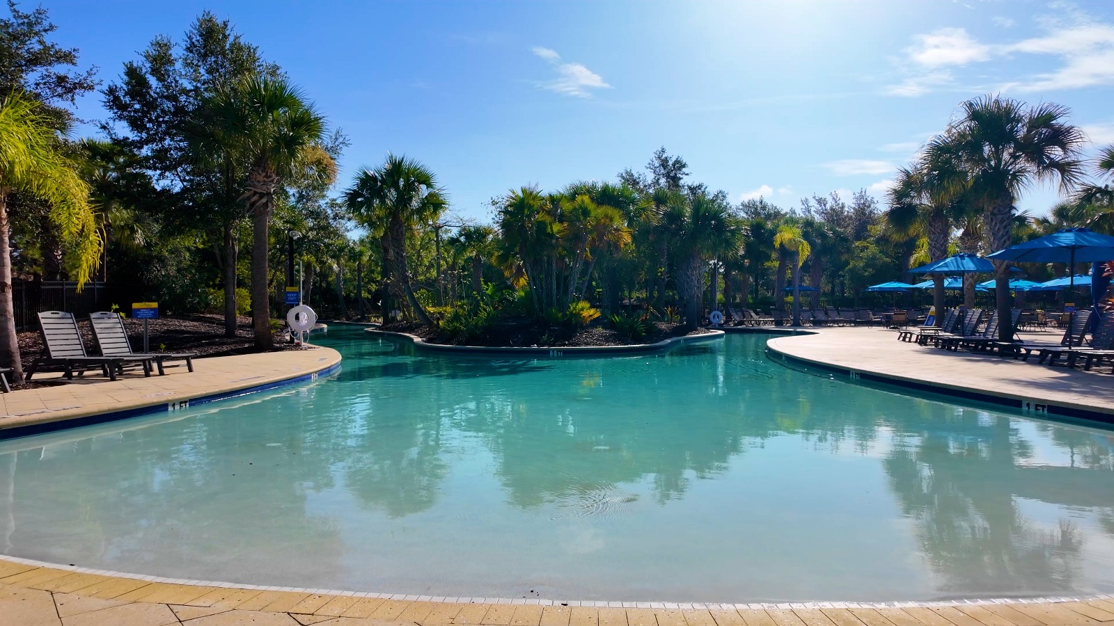 Solterra Resort is a gated community which boasts an enormous zero entry pool, jacuzzi, a corkscrew water slide, and lazy river. There is a stunning clubhouse for you to relax in with computers and printers should you need to conduct any business on your trip. There is a snack bar/grill that serves lunch, snacks, and beverages. Everything you need to enjoy a day at the pool after golfing or taking a break from the parks.