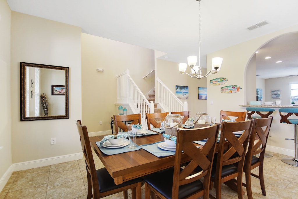As you enter the home, you will be greeted with a formal dining area that seats 8 and mini bar area with two barstools looking into the kitchen area.