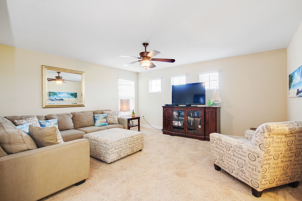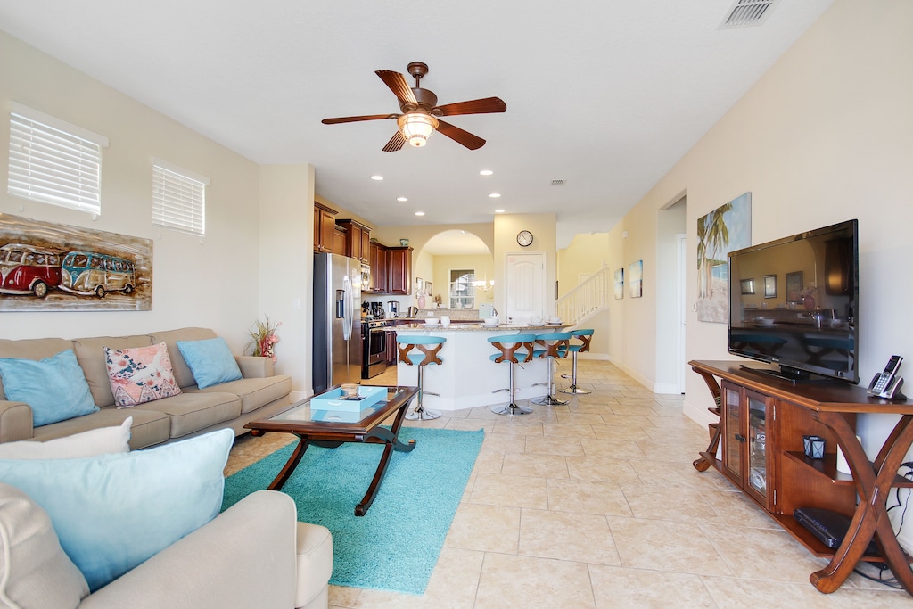 Spacious open plan living room with two sofas, 50" TV, remote controlled ceiling fan, and sliding doors to the pool area.