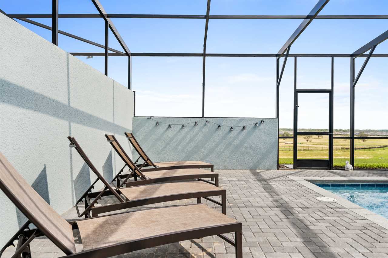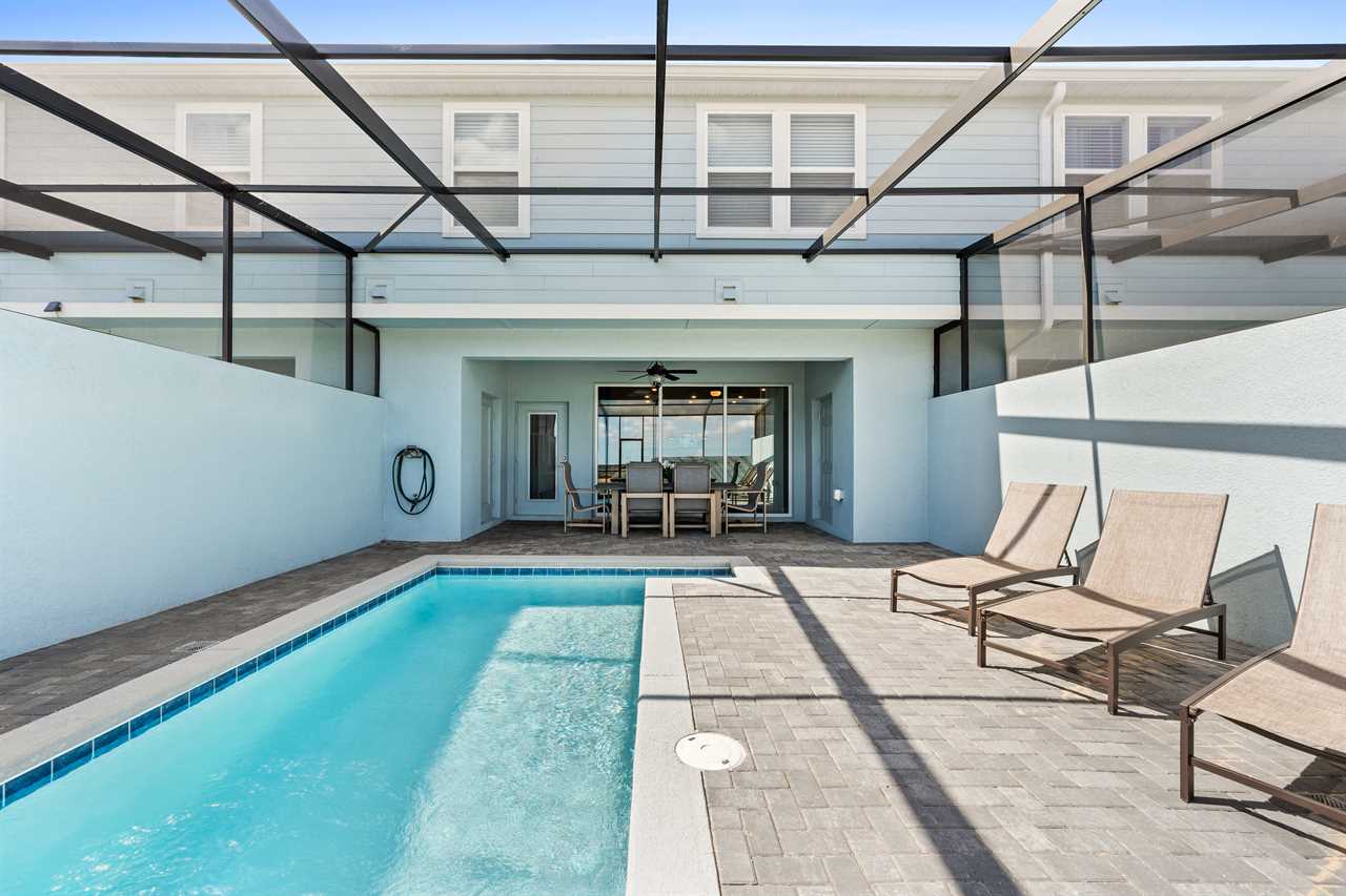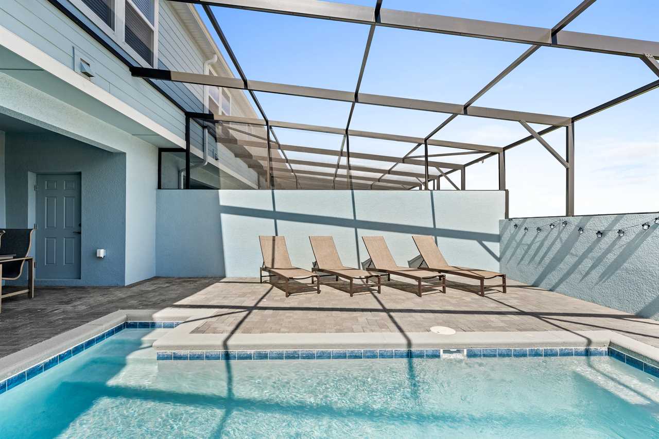 Step outside to your own private sanctuary, where a screened-in pool awaits for hours of relaxation and fun. Lounge in style on the provided outdoor furniture, soaking up the Florida sunshine or enjoying al fresco meals under the blue skies. Sun loungers offer the perfect spot for basking in the warmth, while the screened enclosure ensures privacy and protection from insects.