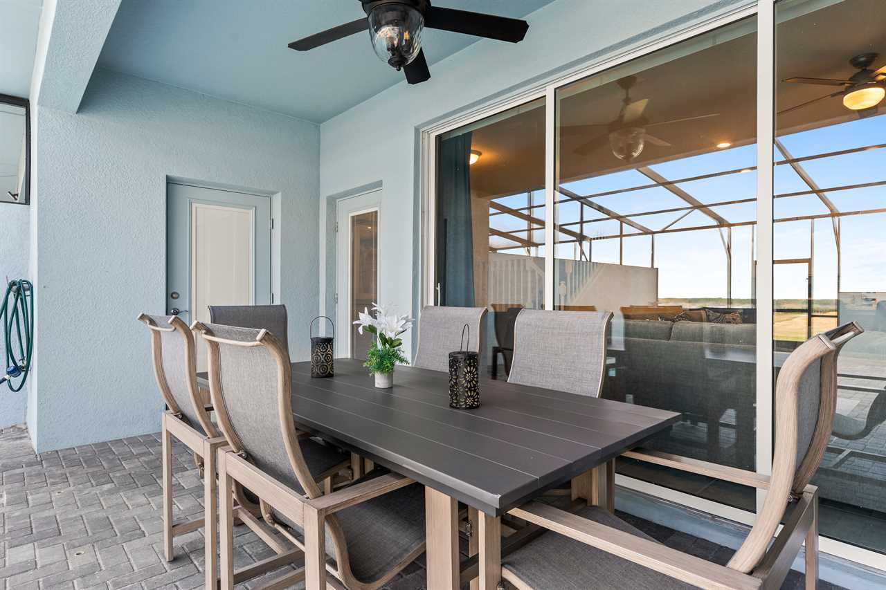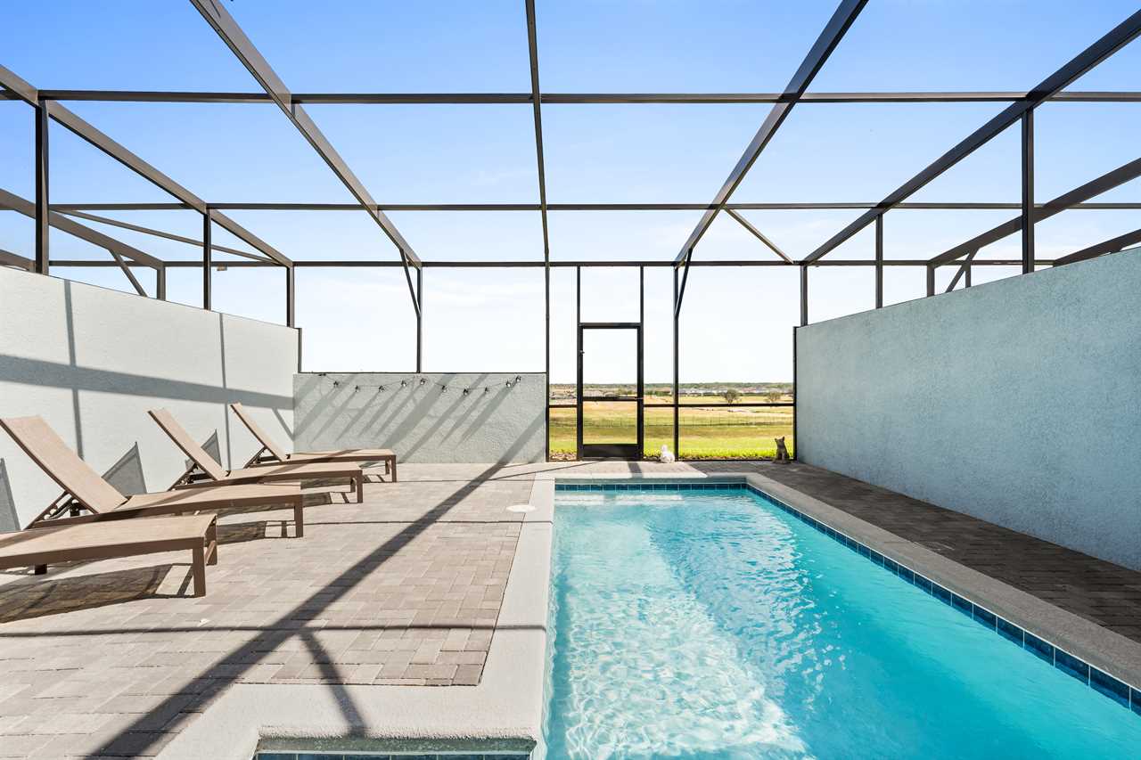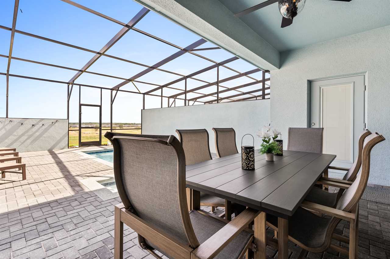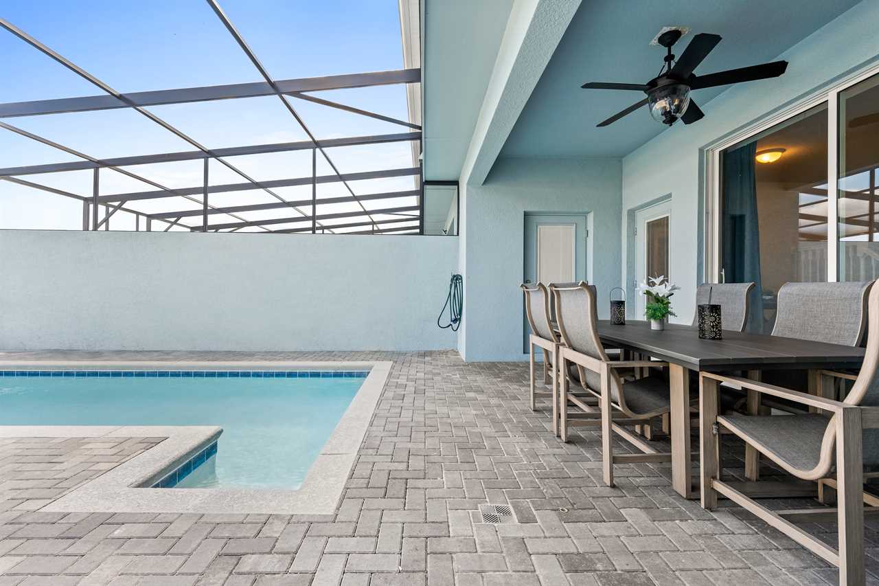 Step outside to your own private sanctuary, where a screened-in pool awaits for hours of relaxation and fun. Lounge in style on the provided outdoor furniture, soaking up the Florida sunshine or enjoying al fresco meals under the blue skies. Sun loungers offer the perfect spot for basking in the warmth, while the screened enclosure ensures privacy and protection from insects.