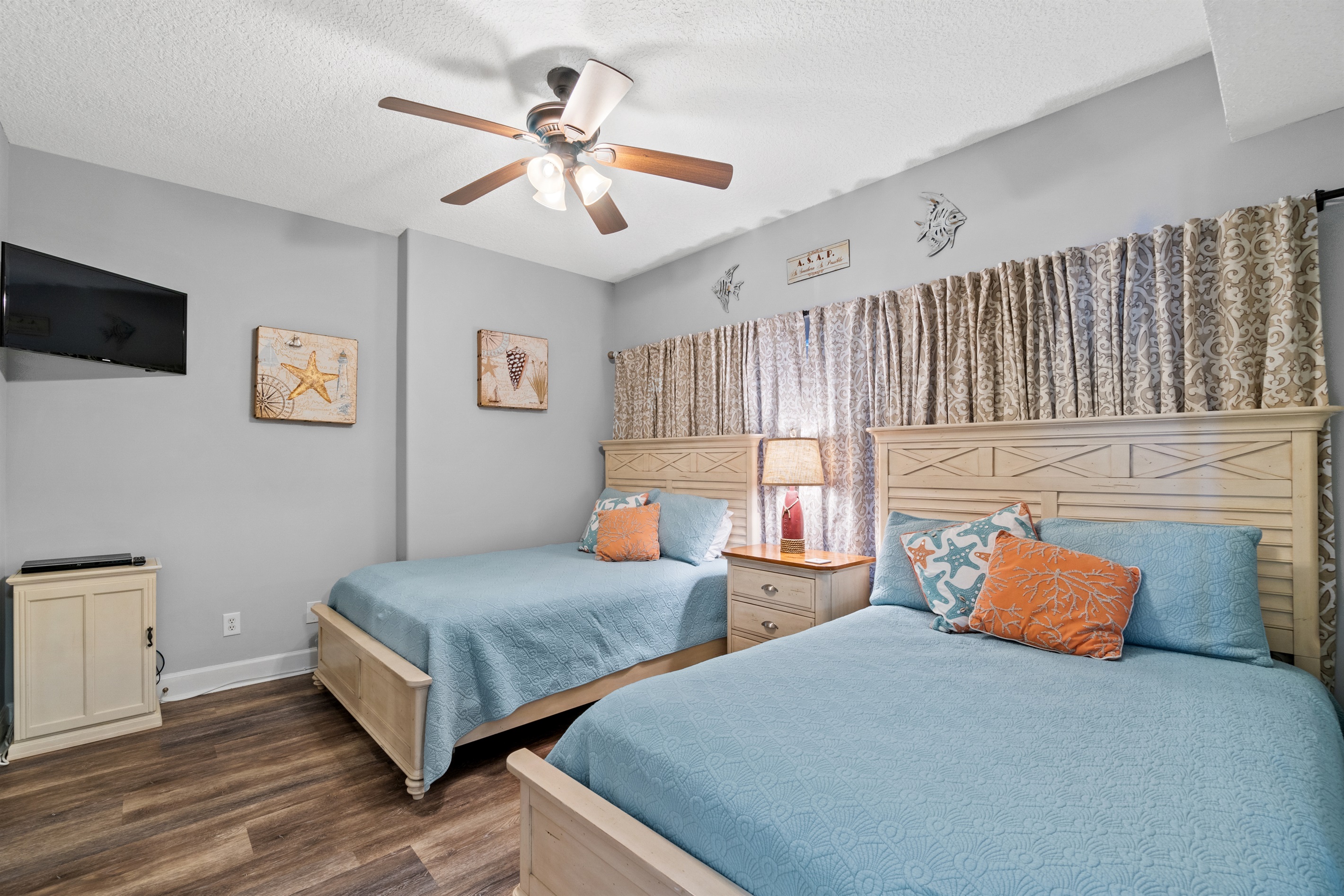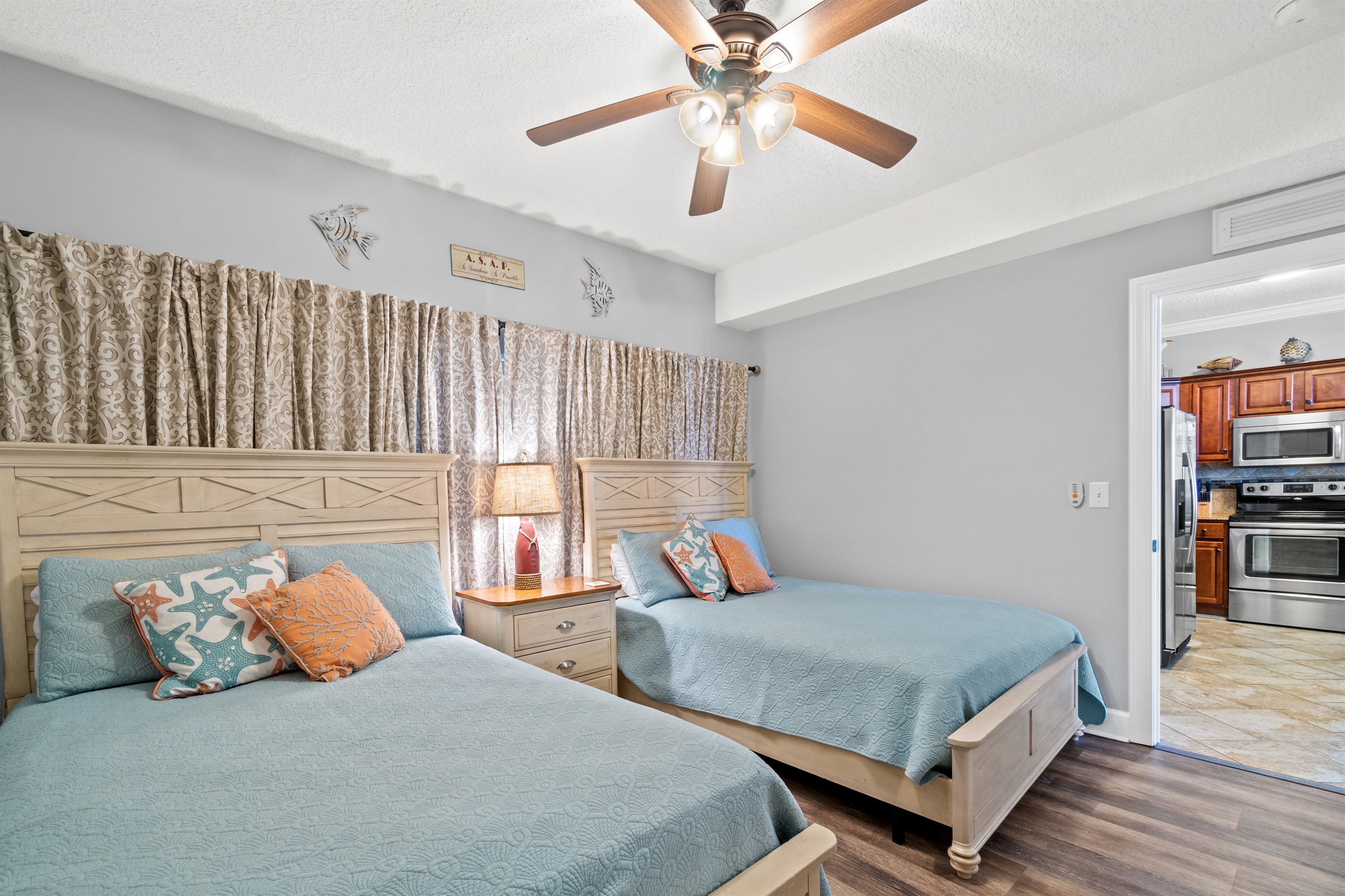 Spend quality family time in the spacious Gulf Front living area with balcony access. Designed with luxury in mind, you will have plenty of room to relax and watch the large HD flat screen TV or surf the NET with our complimentary Wi-Fi Access. This living area is furnished with comfortable dark brown leather sofa and chairs and ottoman. Your 2 bedroom condo sleeps 6 comfortably and offers a scenic Gulf front master bedroom with balcony access. The master bedroom offers a King bed with a beautiful ocean inspired colors. The guest bedroom offers a 2 full beds. You will find your own private tile bath with new shower curtains and other decor off of each bedroom. All bedrooms are equipped with HD flat screen TVS.