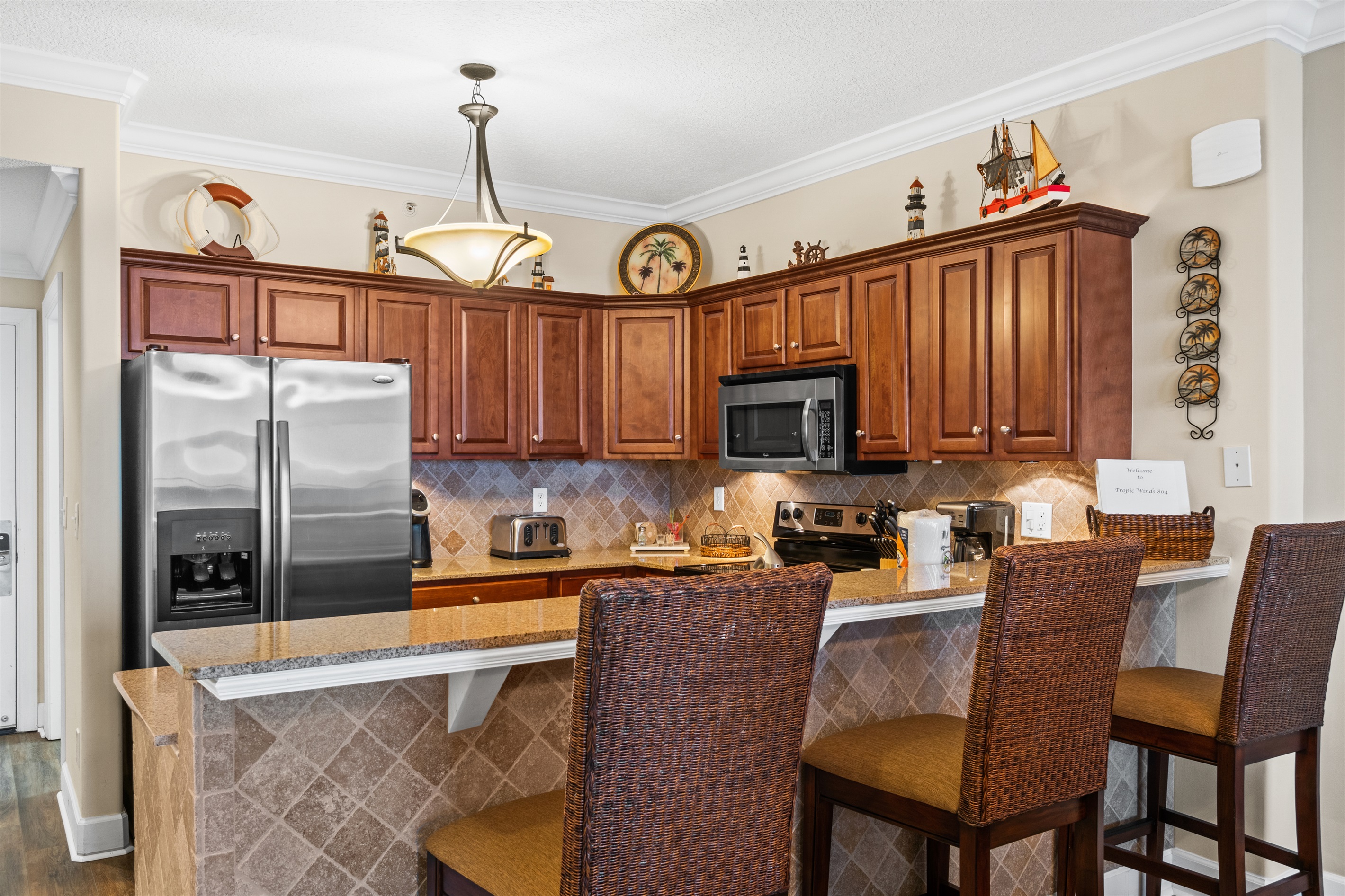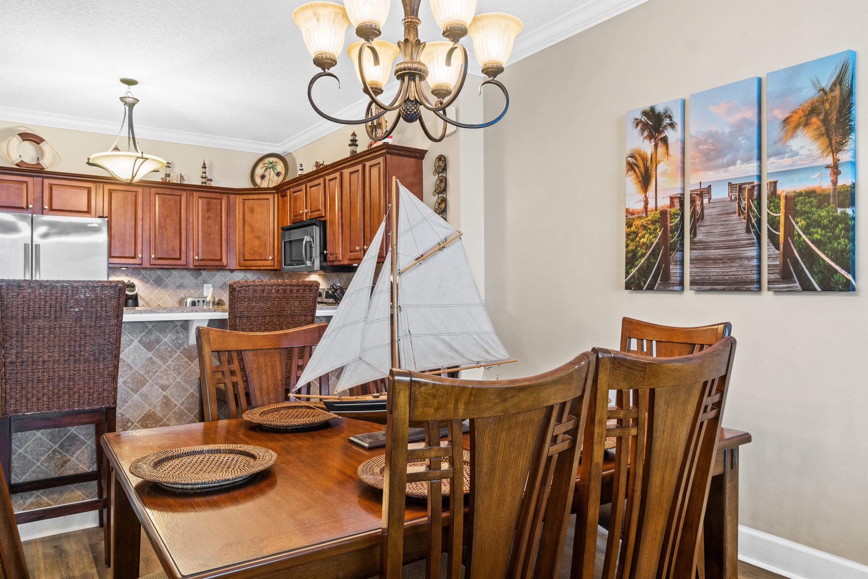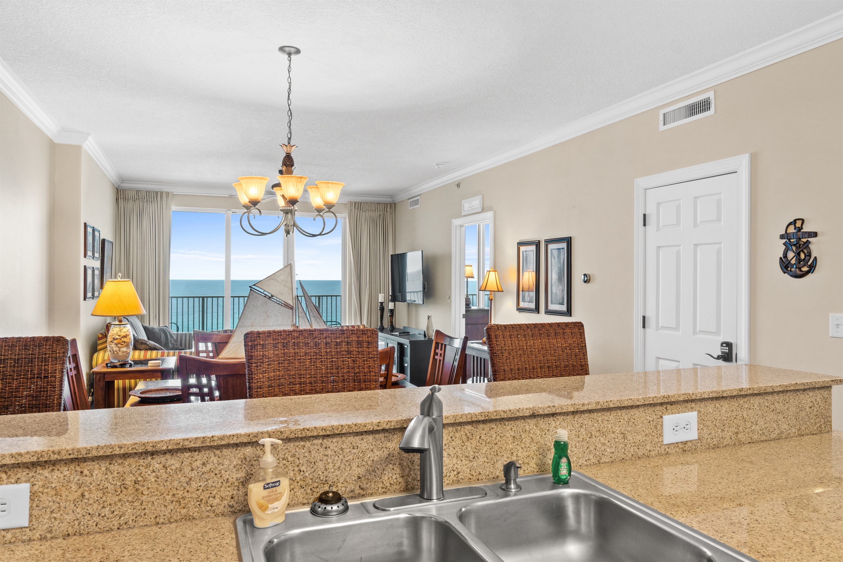 Located on the 8th floor, this contemporary professionally designed 2 bedroom, 2 full bath condo will provide you with the luxury and comfort needed to rejuvenate your mind, body and spirit. Purchased in September 2022 this unit operates on a keyless entry system. The new owners have spared no expense with new décor and furnishings. Your condo features a well appointed kitchen with mahogany cabinets, granite countertops, custom backsplash and upgraded stainless steel appliances. The dining area is very spacious and will seat a total of 6 comfortably for your entertaining needs. The separate laundry room includes a stackable washer/dryer and has ample space for drying out beach towels.