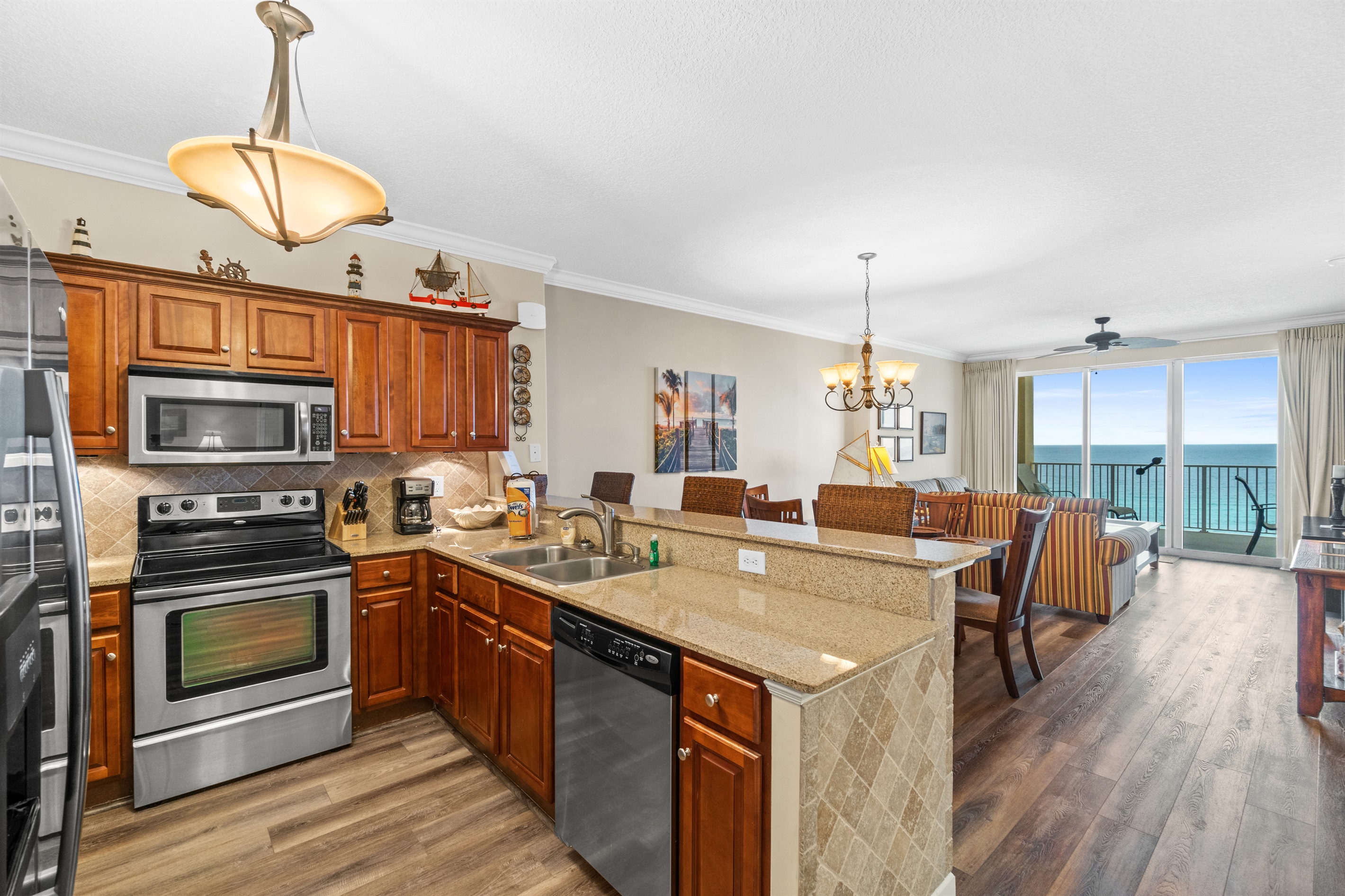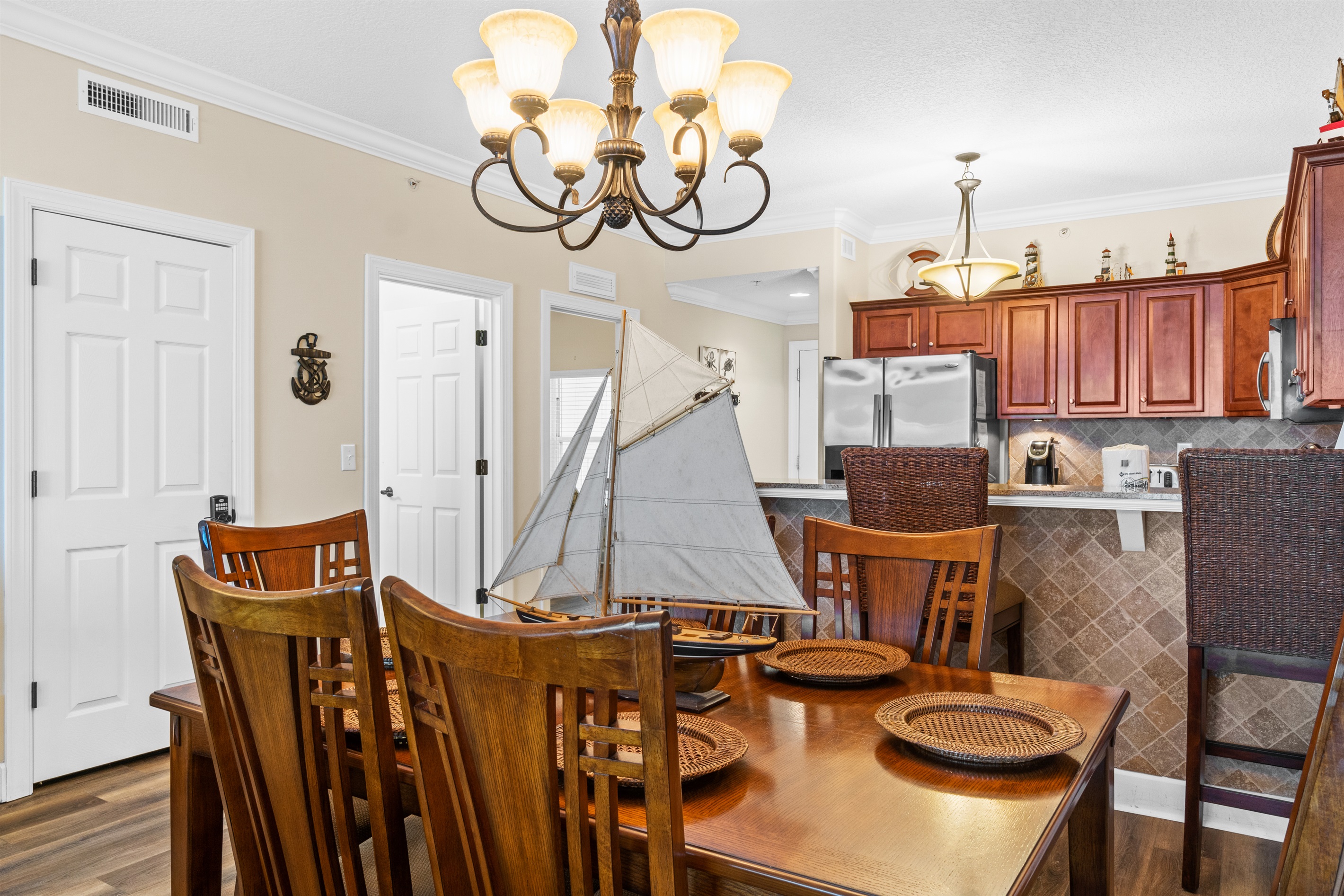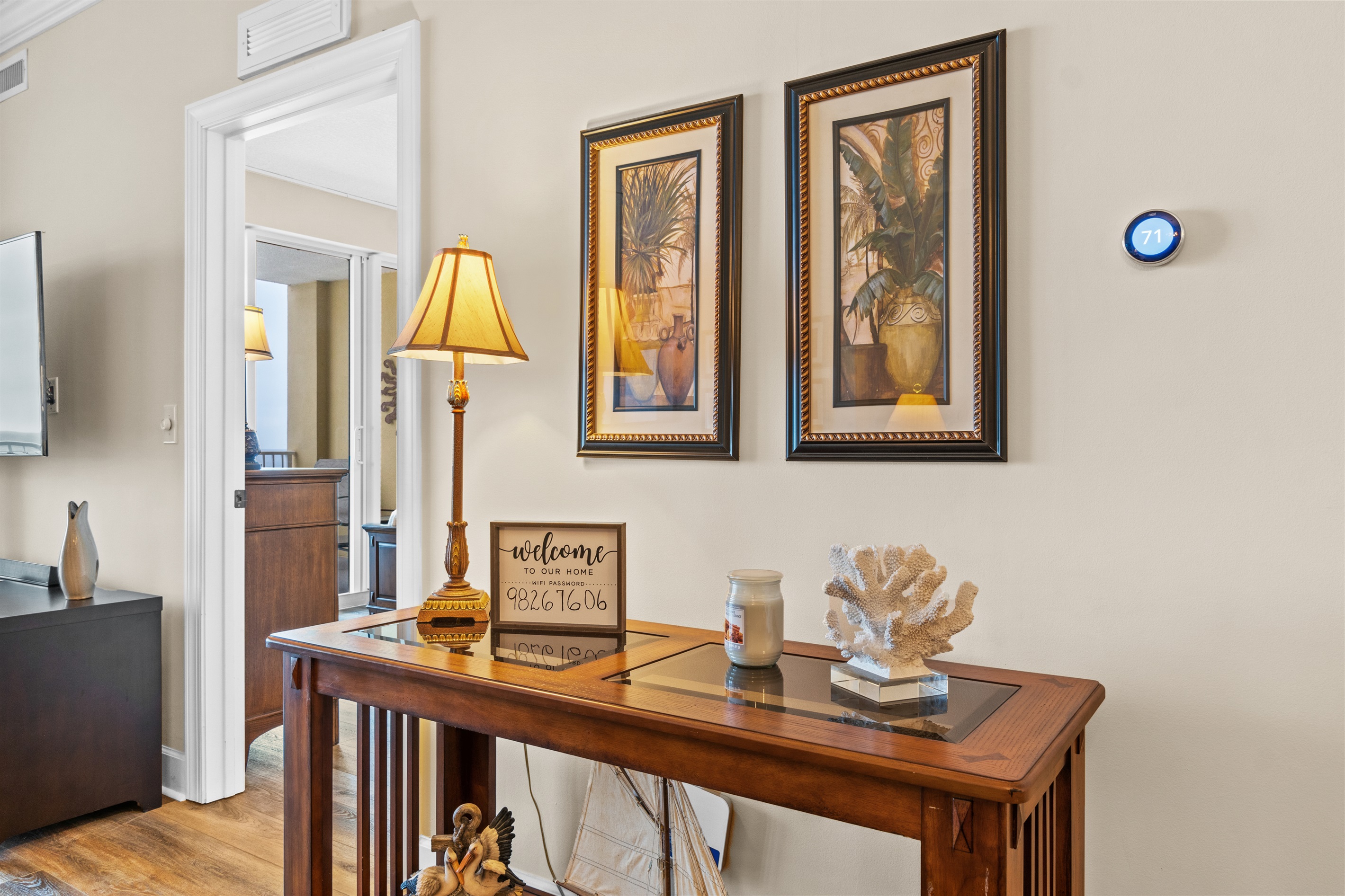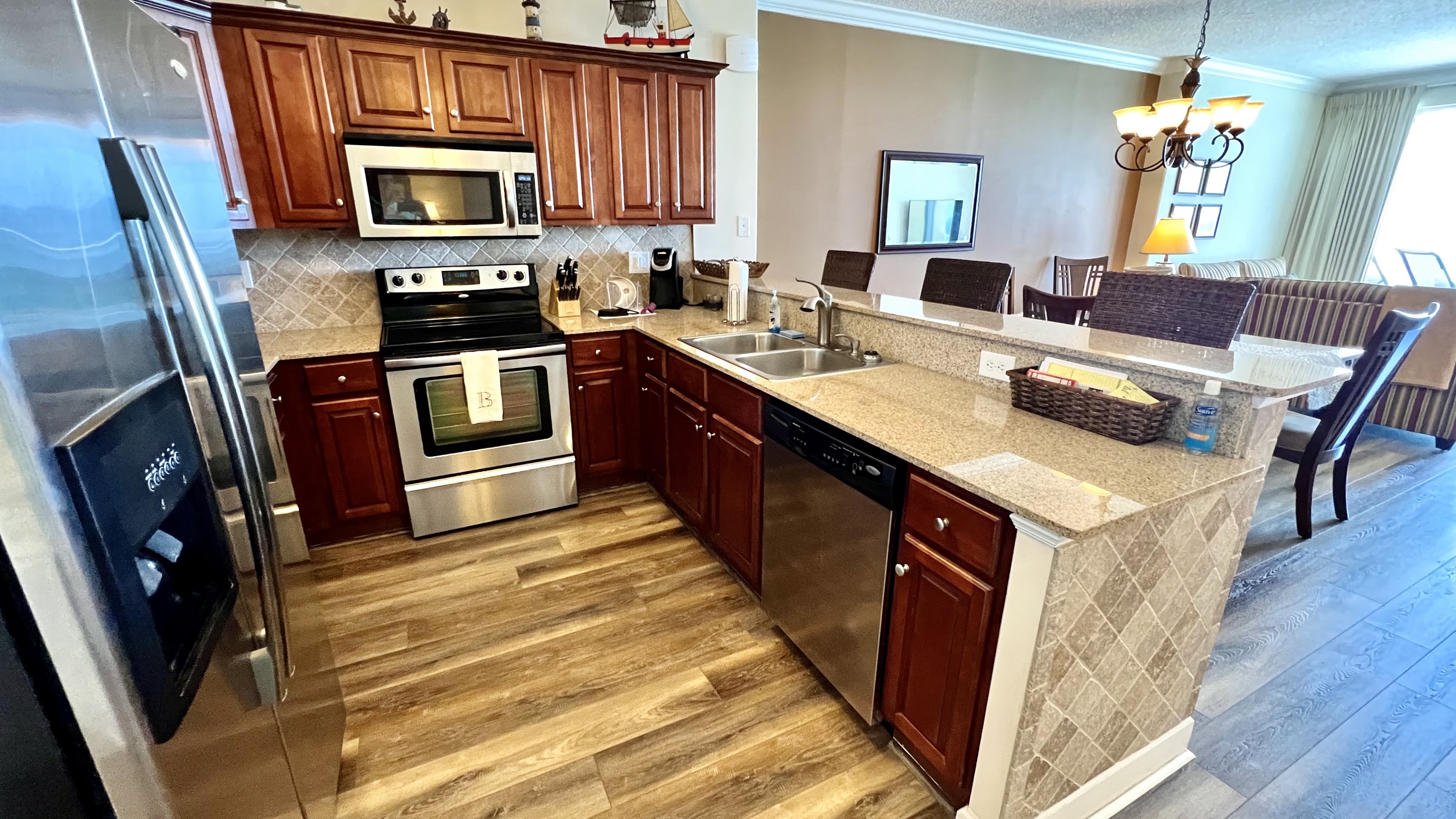 Located on the 8th floor, this contemporary professionally designed 2 bedroom, 2 full bath condo will provide you with the luxury and comfort needed to rejuvenate your mind, body and spirit. Purchased in September 2022 this unit operates on a keyless entry system. The new owners have spared no expense with new décor and furnishings. Your condo features a well appointed kitchen with mahogany cabinets, granite countertops, custom backsplash and upgraded stainless steel appliances. The dining area is very spacious and will seat a total of 6 comfortably for your entertaining needs. The separate laundry room includes a stackable washer/dryer and has ample space for drying out beach towels.