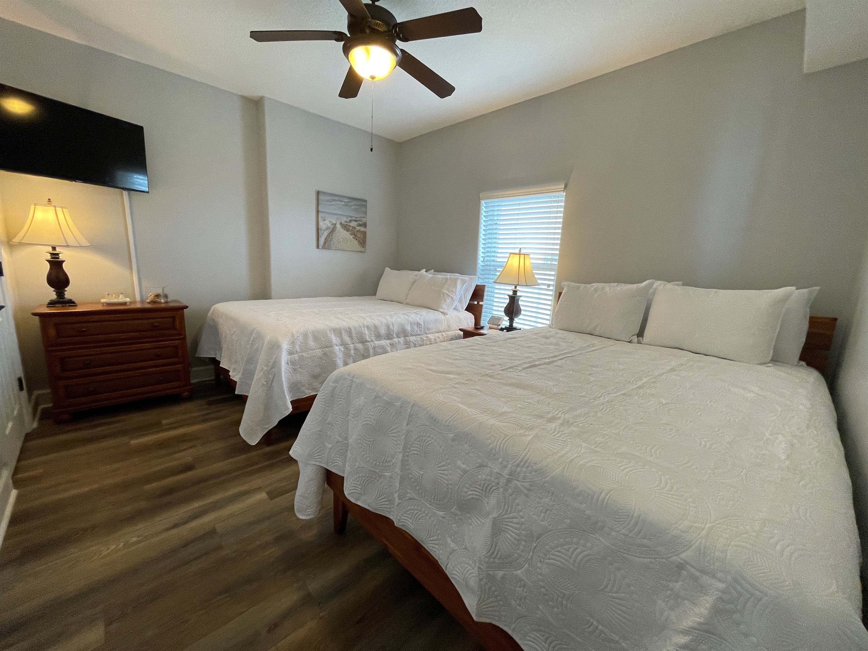 Spend quality family time in the spacious Gulf Front living area with balcony access. Designed with luxury in mind, you will have plenty of room to relax and watch the large HD flat screen TV or surf the NET with our complimentary Wi-Fi Access. This living area is furnished with comfortable pull out sleeper sofa and loveseat. Your 2 bedroom condo sleeps 6 comfortably and offers a scenic Gulf front master bedroom with balcony access. The master bedroom offers a King bed with a beautiful ocean inspired colors. The guest bedroom offers a King Bed. You will find your own private tile bath with new shower curtains and other decor off of each bedroom. All bedrooms are equipped with HD flat screen TVS.
