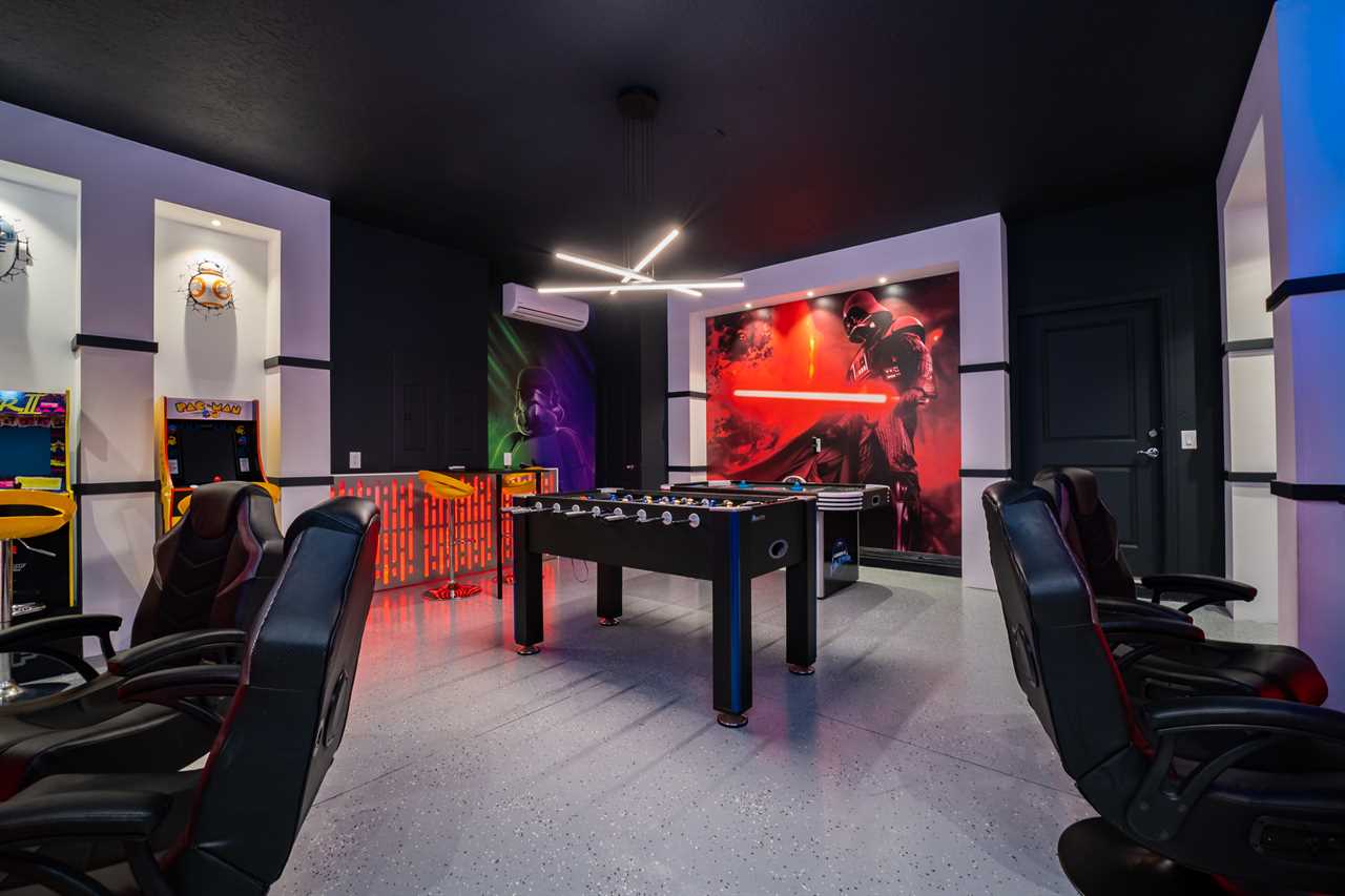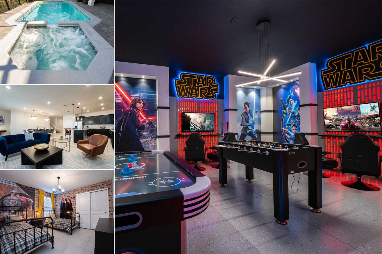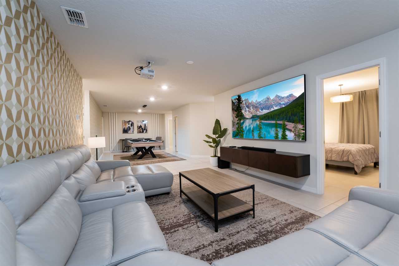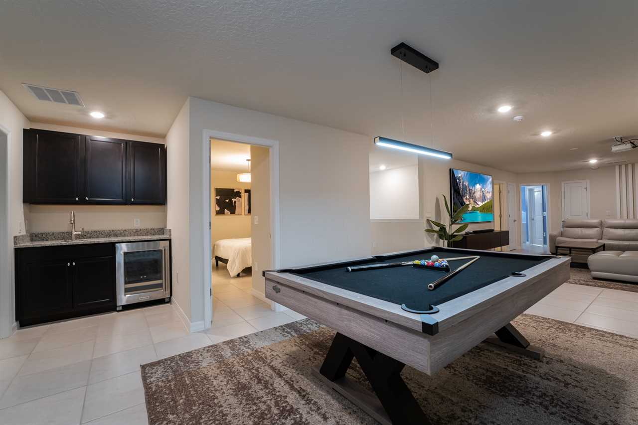 Enjoy the private backyard pool and bubbling spa, perfect for unwinding after a day of adventure. The air-conditioned, themed games room is another highlight, offering endless fun for all ages. The open floor plan on the main level is bathed in natural light, creating a bright and spacious living area.