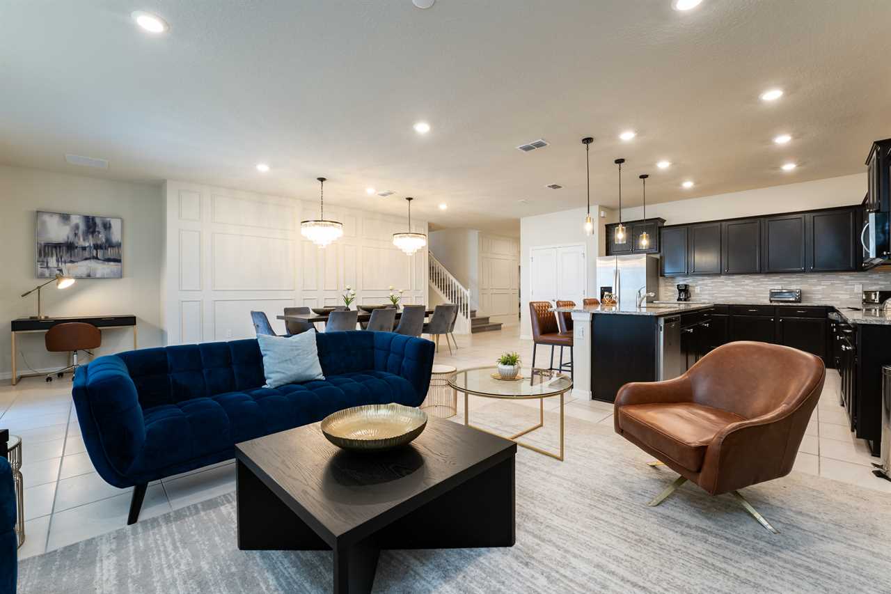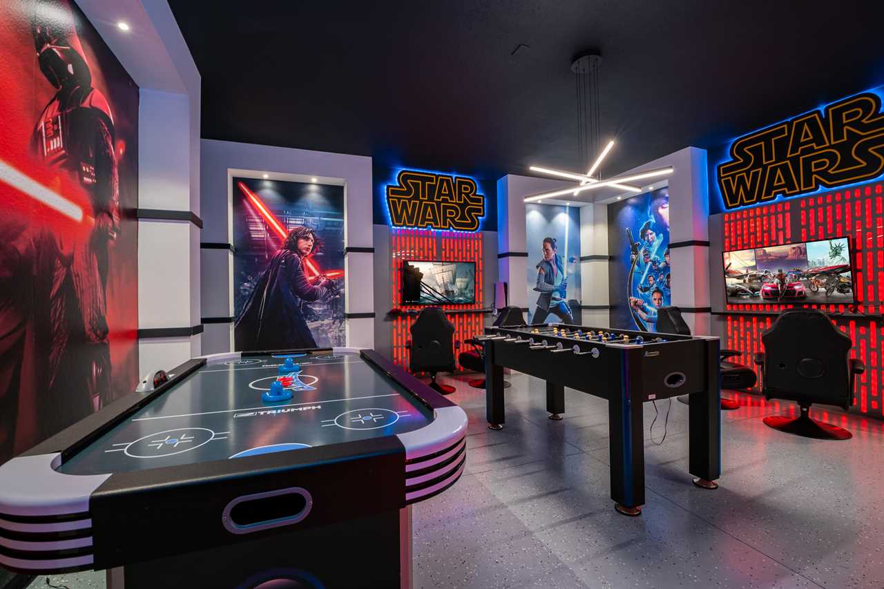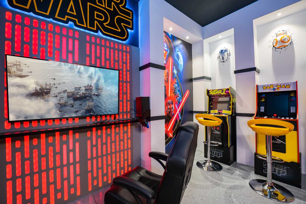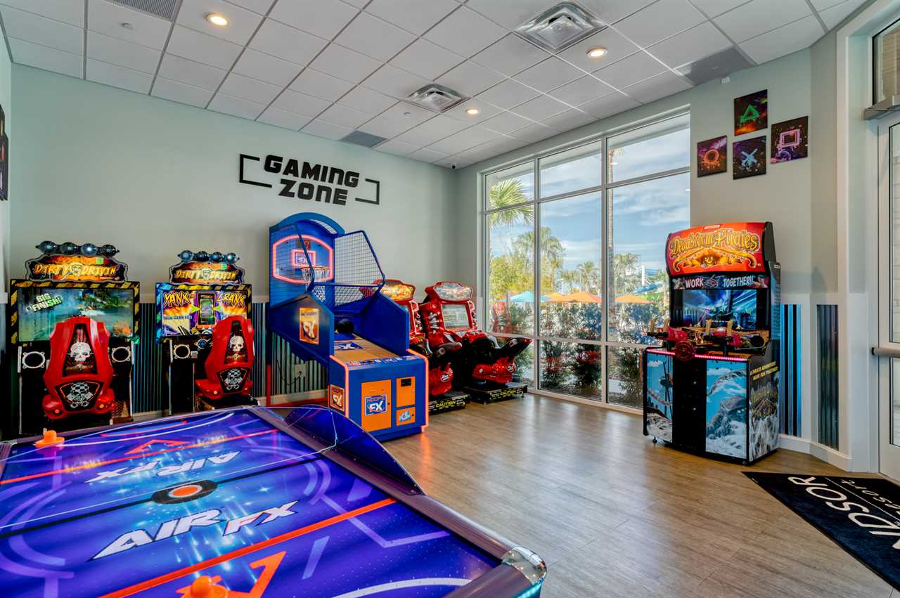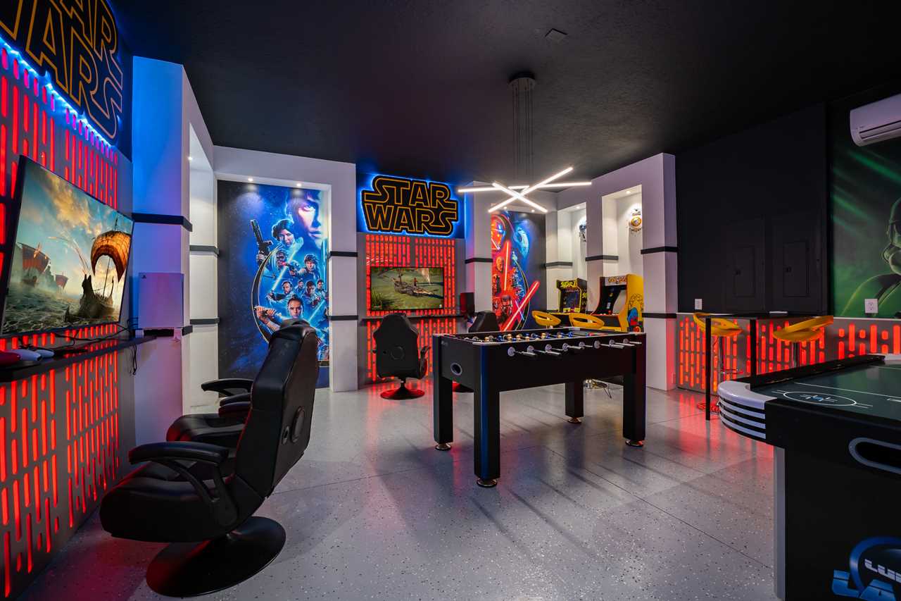 Enjoy the private backyard pool and bubbling spa, perfect for unwinding after a day of adventure. The air-conditioned, themed games room is another highlight, offering endless fun for all ages. The open floor plan on the main level is bathed in natural light, creating a bright and spacious living area.