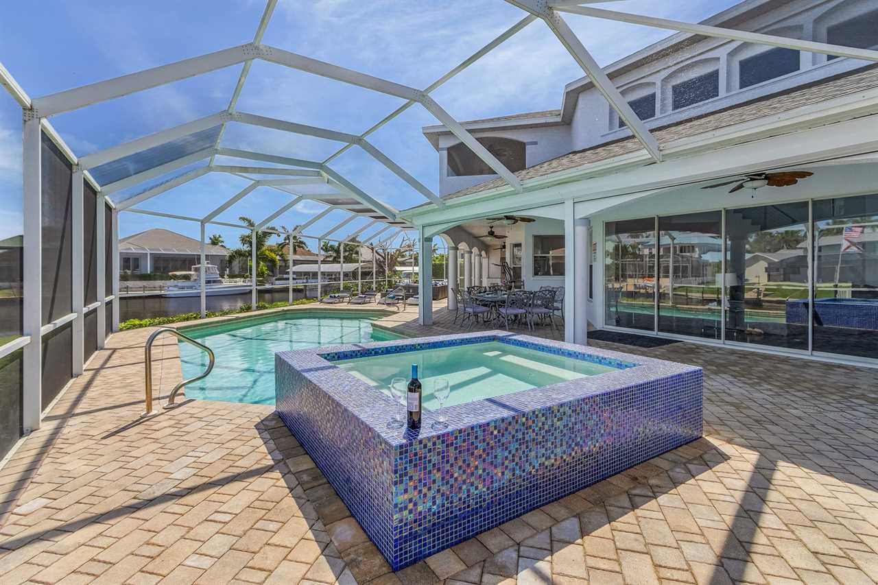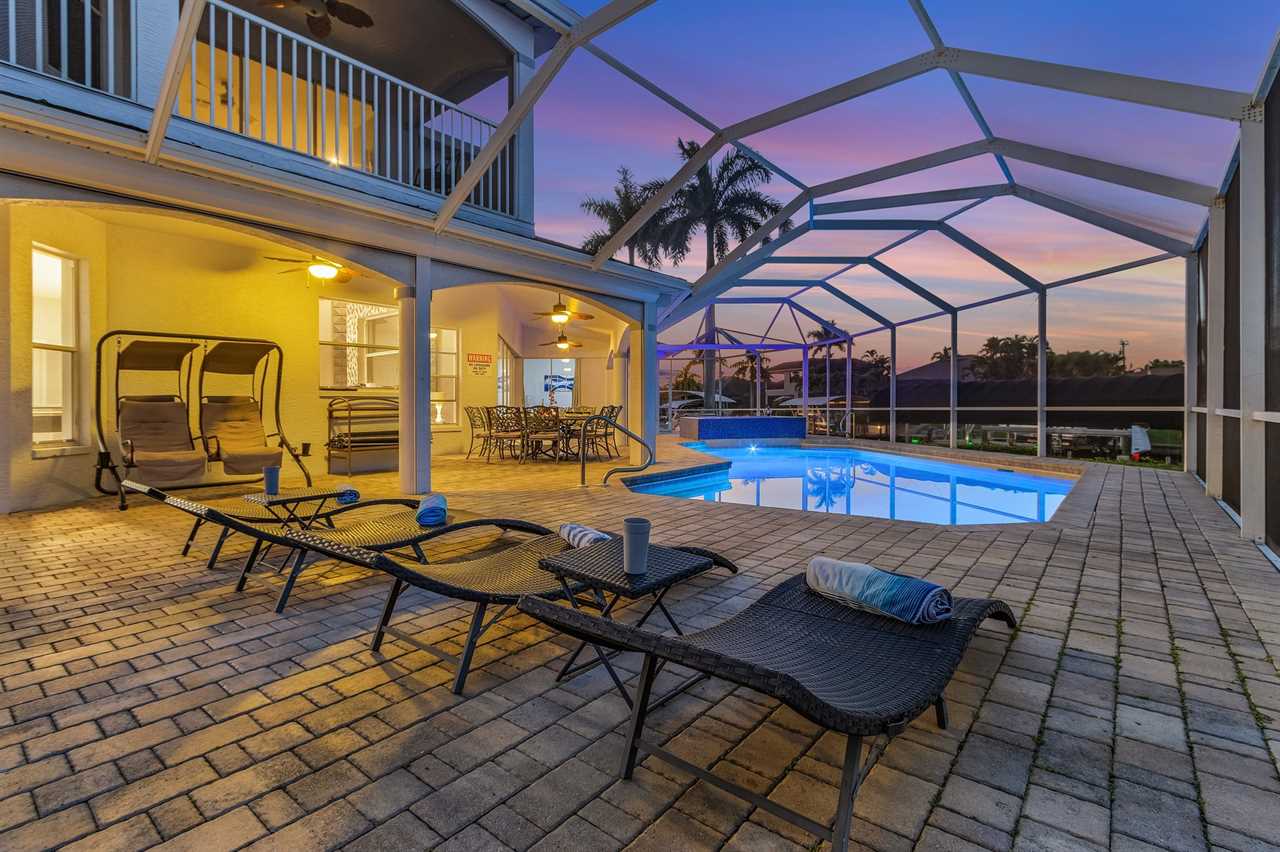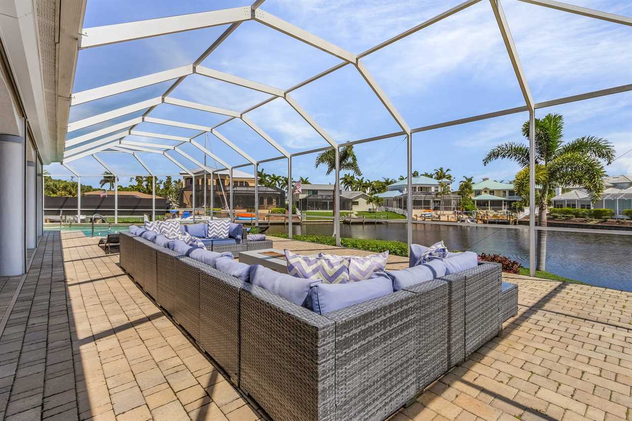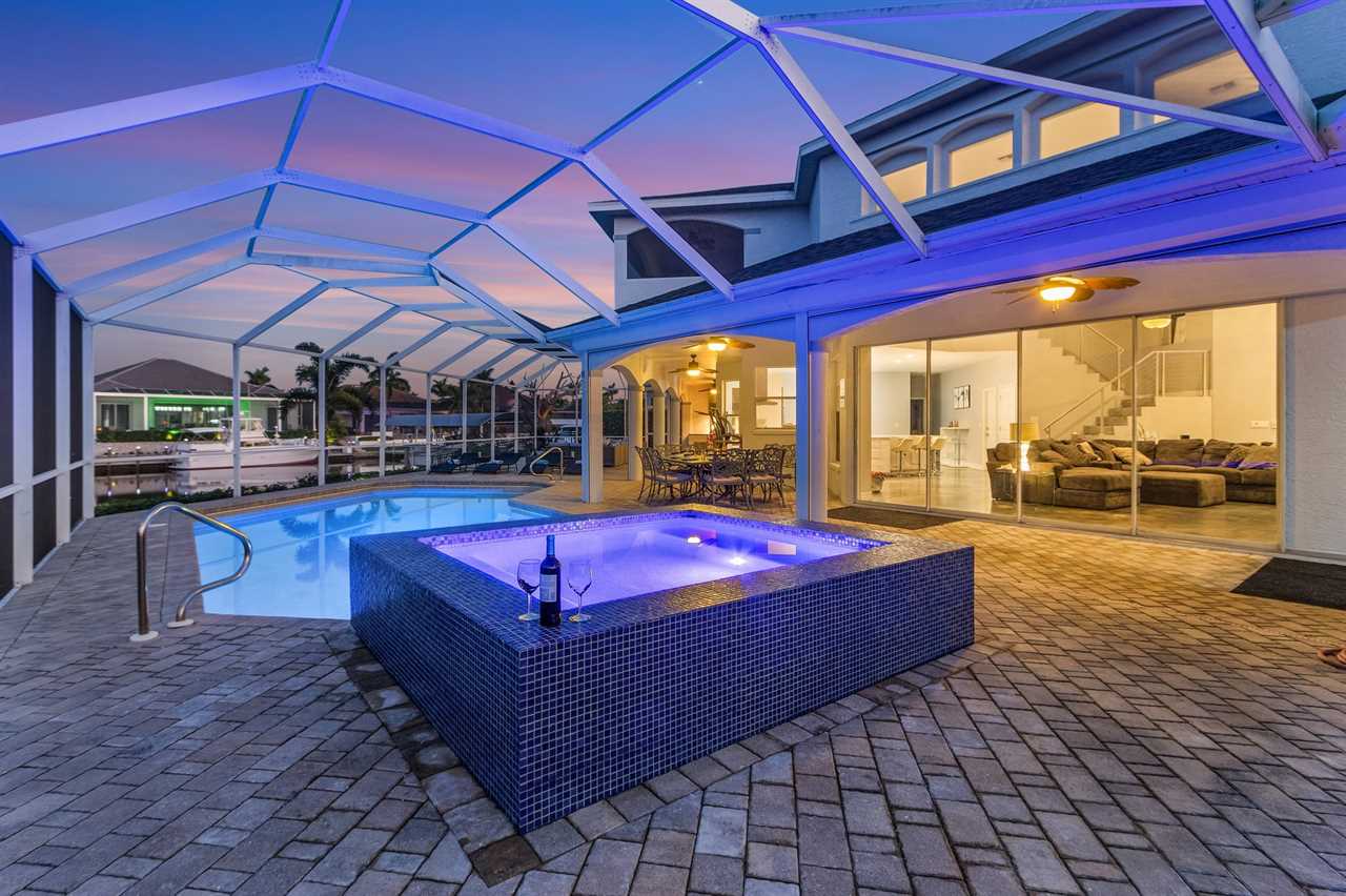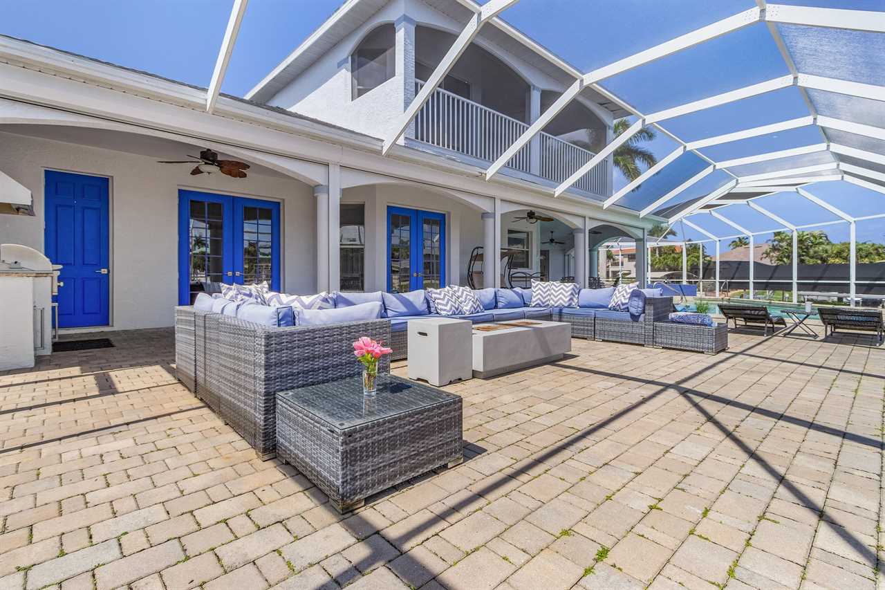 While the inside of this home is beyond luxurious, you will find the true highlight of Villa Whispering Palms when you walk outside. Outside you will find your own private paradise with a large screened in lanai, outdoor kitchen and custom pool, with a brand NEW hot tub. This pool is perfect for soaking up the Florida sun, splashing around or playing pool games. Plenty of outdoor furniture gives you and your guests plenty of options for where to relax and take in the Florida fresh air. Spend your evenings relaxing on the large outdoor couch and electric fireplace. Make yourself a drink and enjoy the views of the canal. Villa Whispering Palms sits on a large lot and has a spacious backyard. Here you have room to play a game of cornhole or walk down to the dock where you can fish or search for Southwest Florida Wildlife.