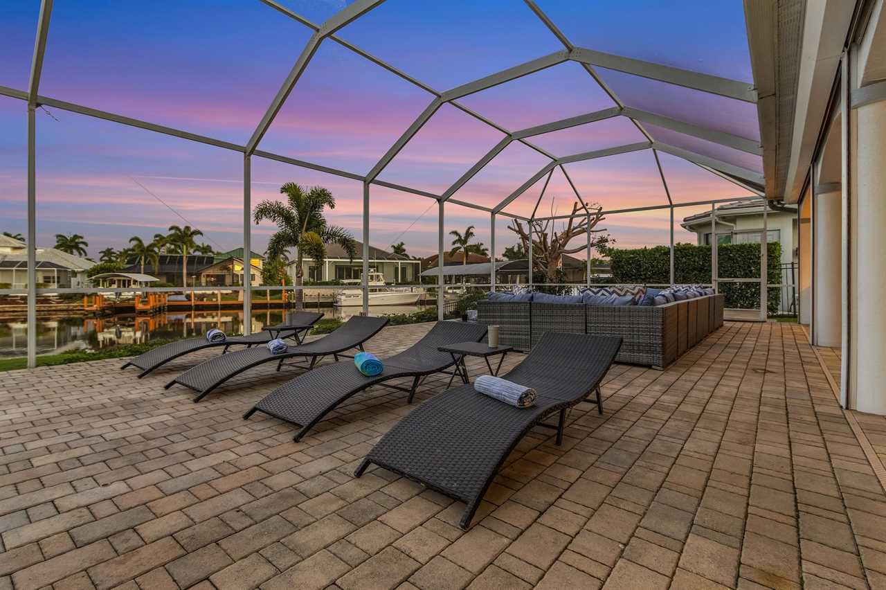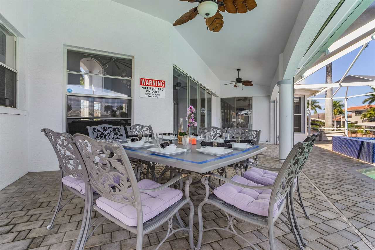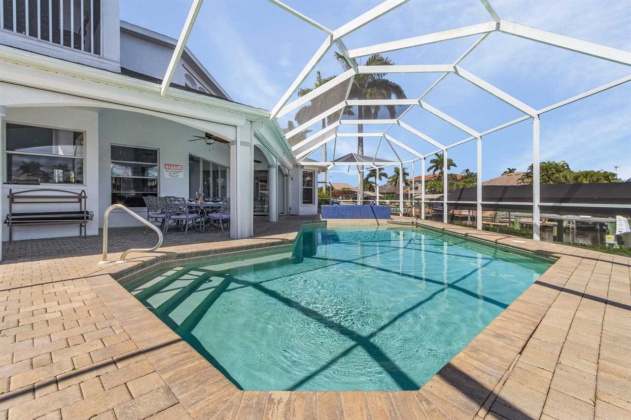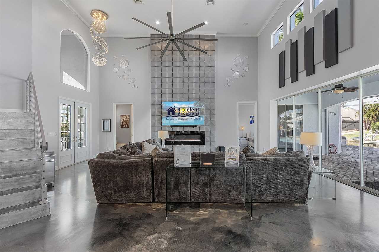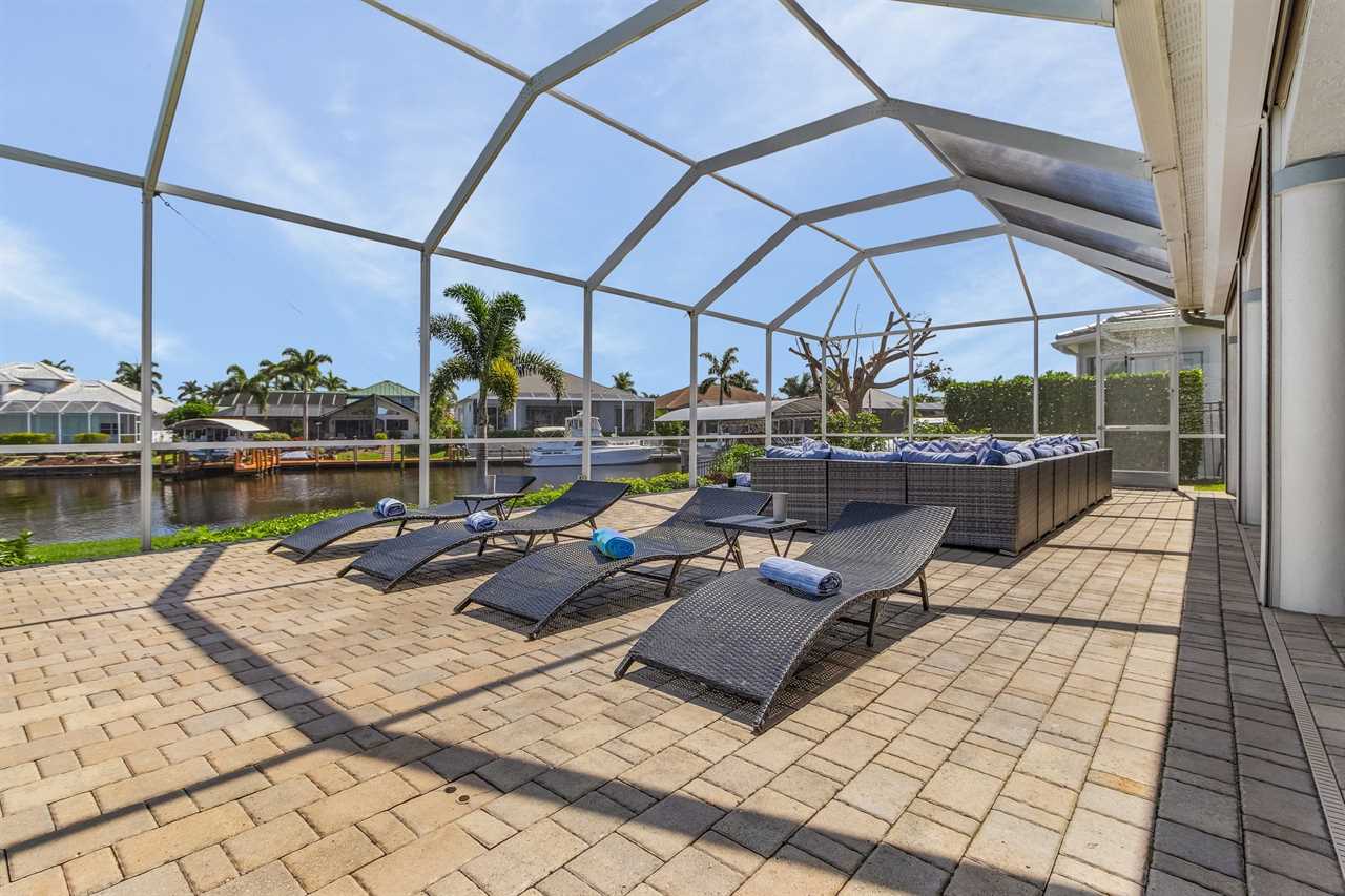 While the inside of this home is beyond luxurious, you will find the true highlight of Villa Whispering Palms when you walk outside. Outside you will find your own private paradise with a large screened in lanai, outdoor kitchen and custom pool, with a brand NEW hot tub. This pool is perfect for soaking up the Florida sun, splashing around or playing pool games. Plenty of outdoor furniture gives you and your guests plenty of options for where to relax and take in the Florida fresh air. Spend your evenings relaxing on the large outdoor couch and electric fireplace. Make yourself a drink and enjoy the views of the canal. Villa Whispering Palms sits on a large lot and has a spacious backyard. Here you have room to play a game of cornhole or walk down to the dock where you can fish or search for Southwest Florida Wildlife.
