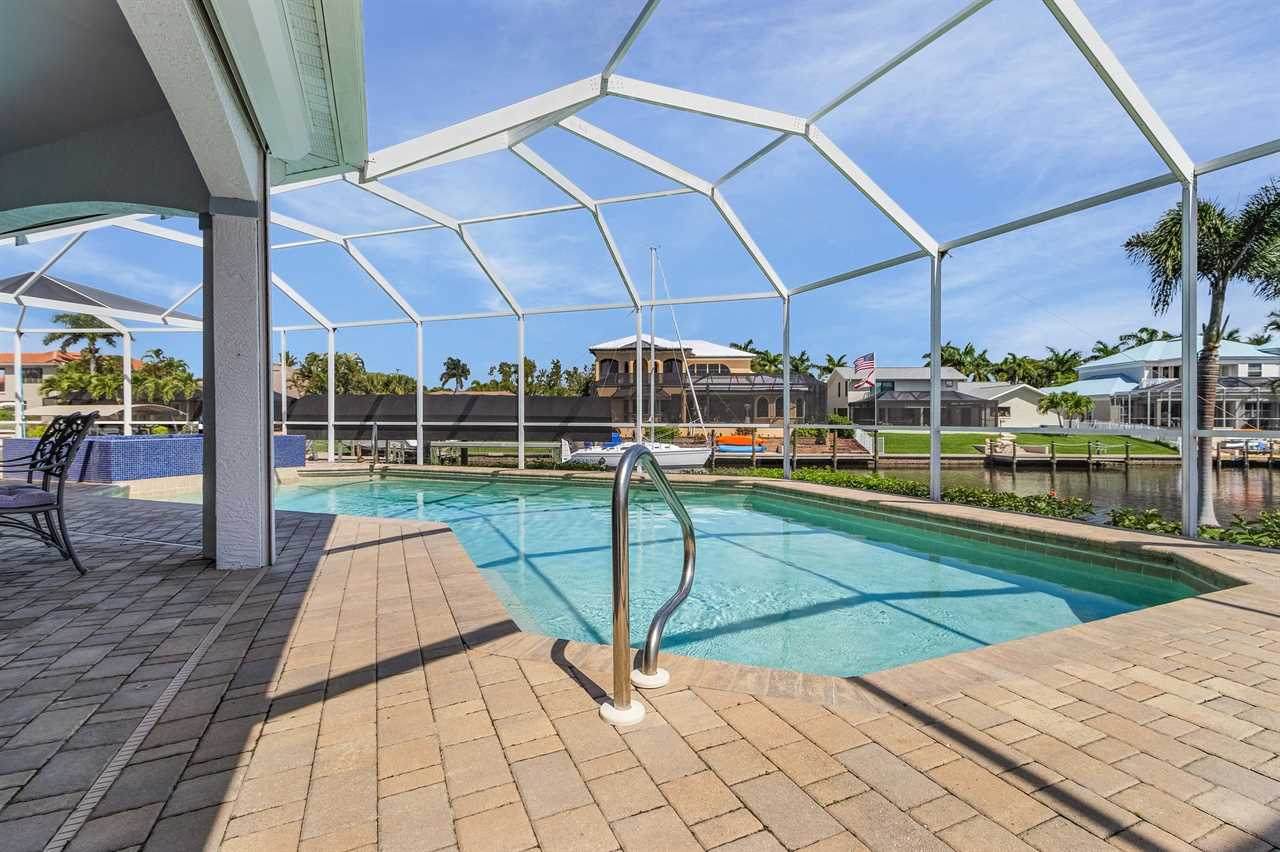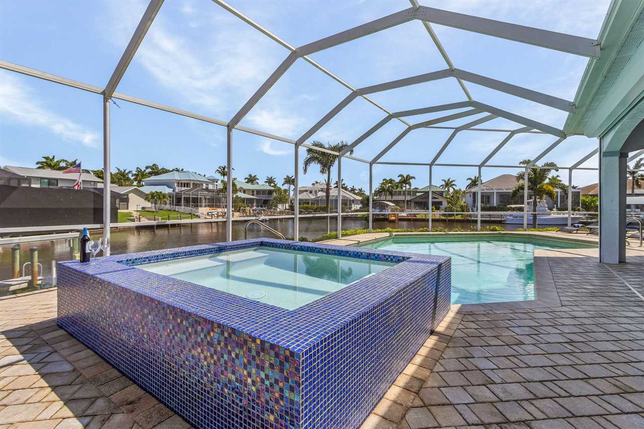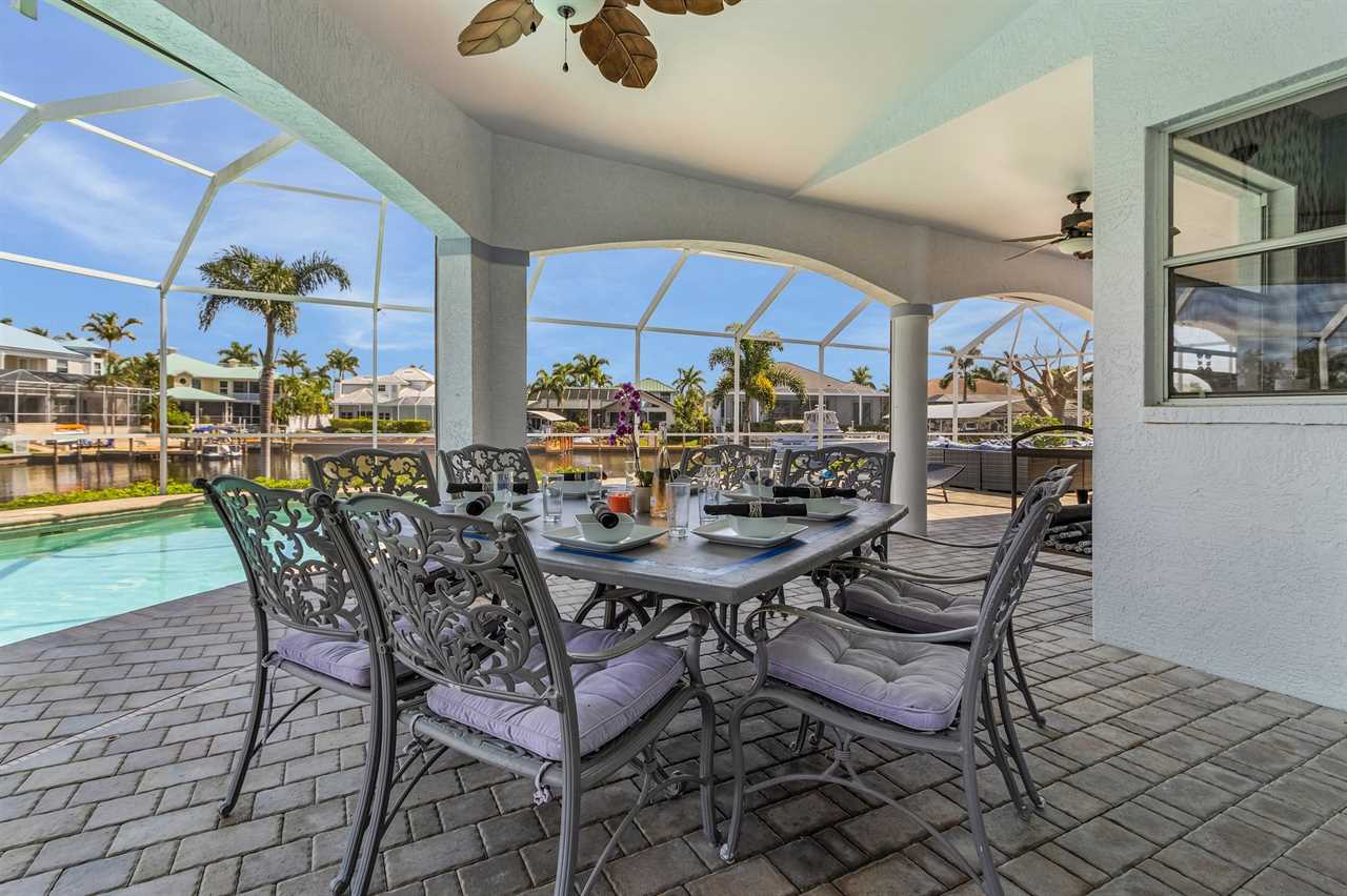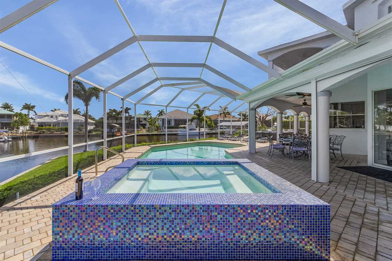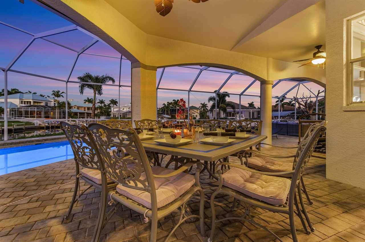 While the inside of this home is beyond luxurious, you will find the true highlight of Villa Whispering Palms when you walk outside. Outside you will find your own private paradise with a large screened in lanai, outdoor kitchen and custom pool, with a brand NEW hot tub. This pool is perfect for soaking up the Florida sun, splashing around or playing pool games. Plenty of outdoor furniture gives you and your guests plenty of options for where to relax and take in the Florida fresh air. Spend your evenings relaxing on the large outdoor couch and electric fireplace. Make yourself a drink and enjoy the views of the canal. Villa Whispering Palms sits on a large lot and has a spacious backyard. Here you have room to play a game of cornhole or walk down to the dock where you can fish or search for Southwest Florida Wildlife.
