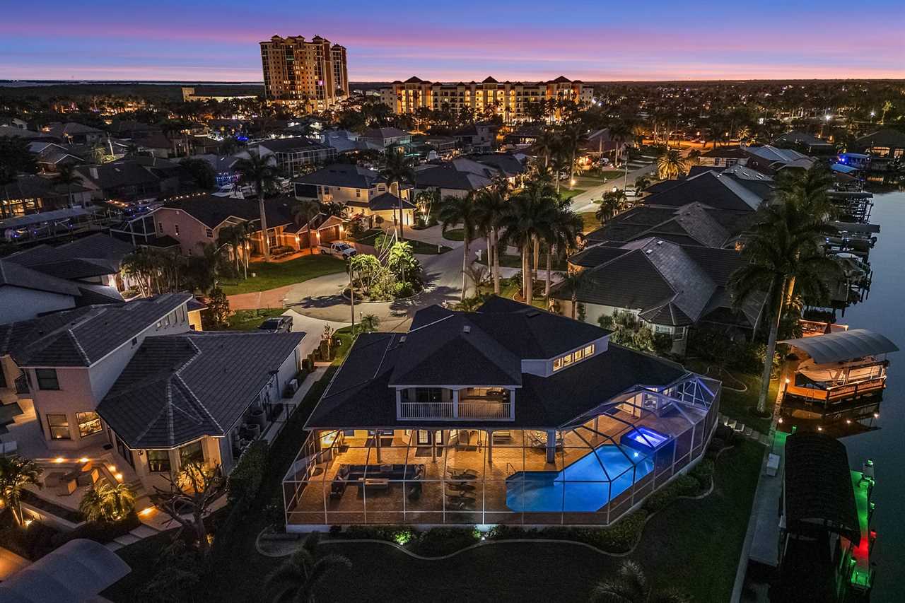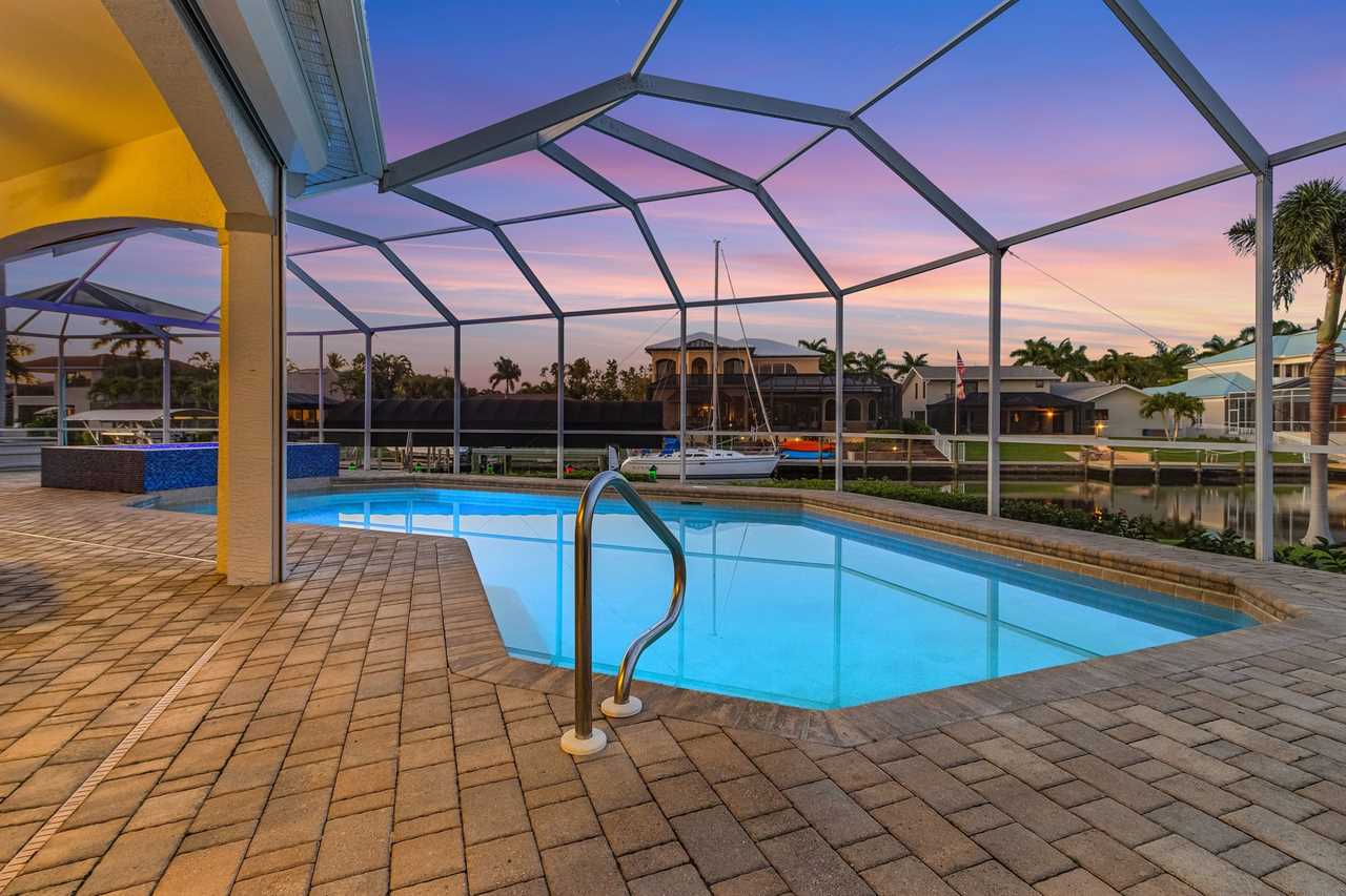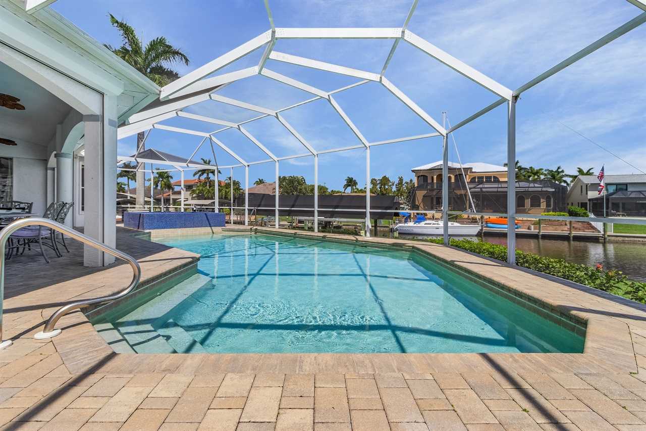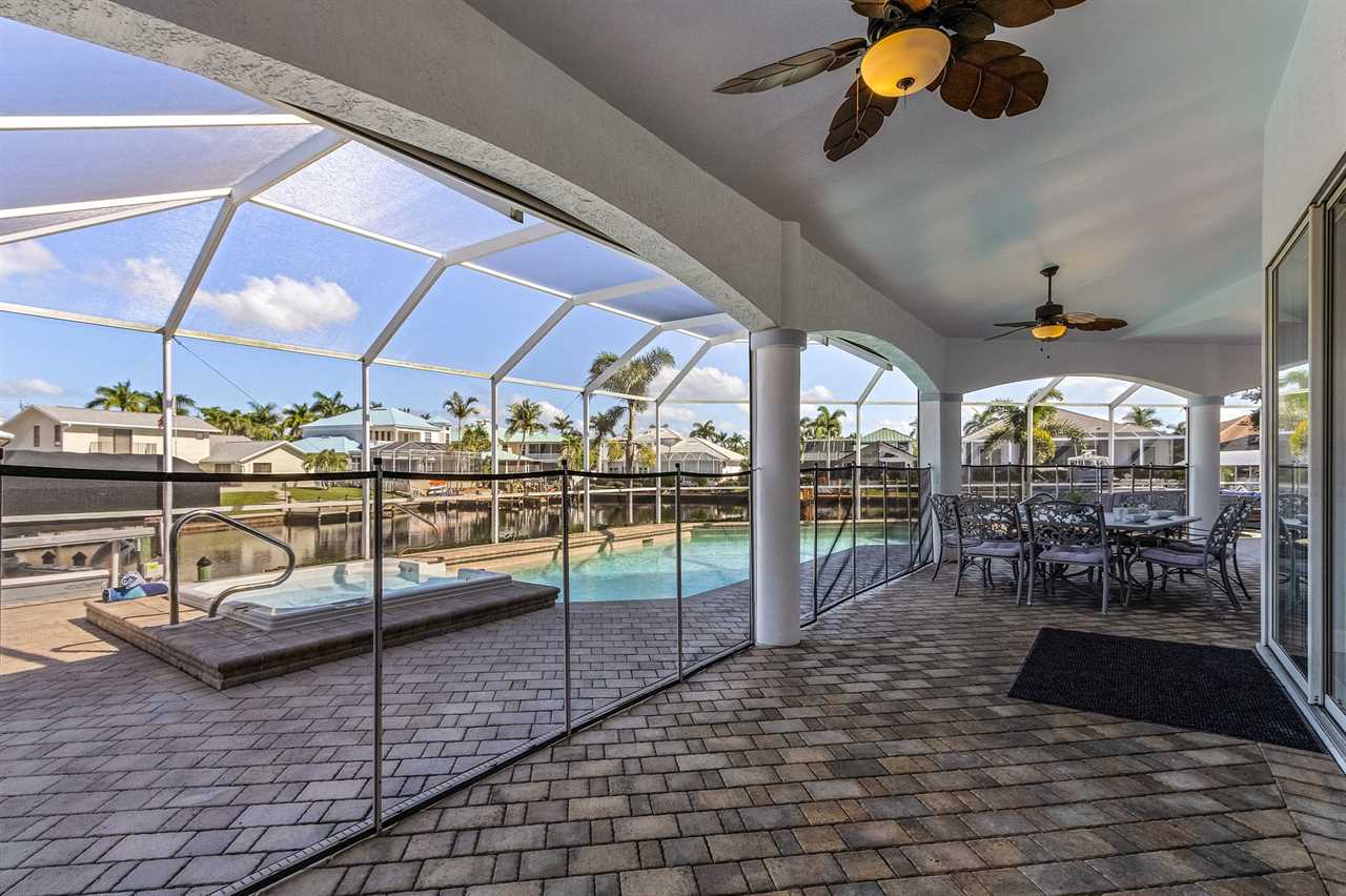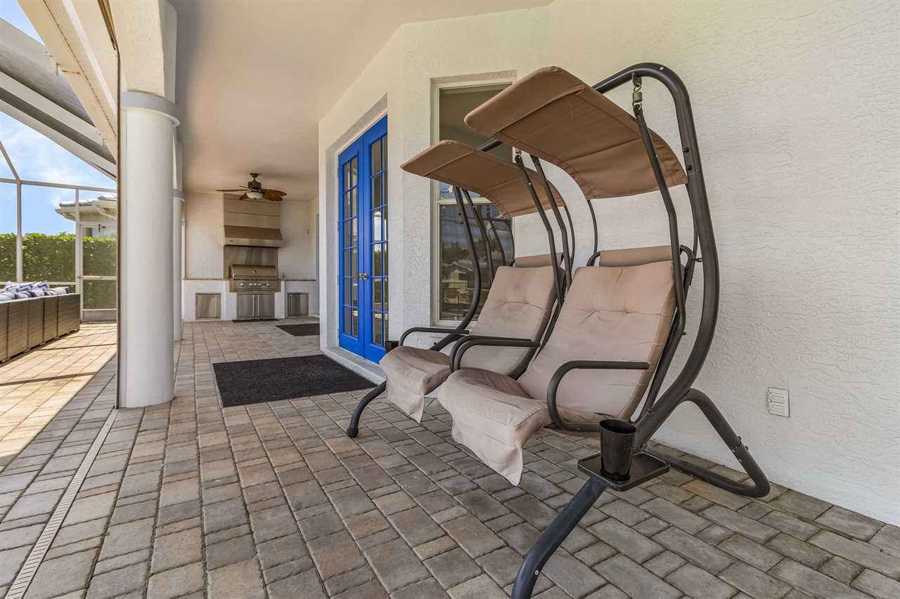 While the inside of this home is beyond luxurious, you will find the true highlight of Villa Whispering Palms when you walk outside. Outside you will find your own private paradise with a large screened in lanai, outdoor kitchen and custom pool, with a brand NEW hot tub. This pool is perfect for soaking up the Florida sun, splashing around or playing pool games. Plenty of outdoor furniture gives you and your guests plenty of options for where to relax and take in the Florida fresh air. Spend your evenings relaxing on the large outdoor couch and electric fireplace. Make yourself a drink and enjoy the views of the canal. Villa Whispering Palms sits on a large lot and has a spacious backyard. Here you have room to play a game of cornhole or walk down to the dock where you can fish or search for Southwest Florida Wildlife.