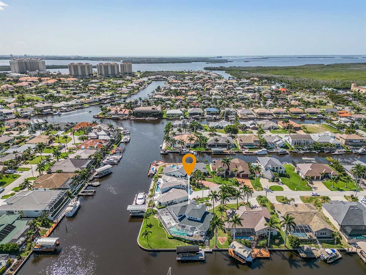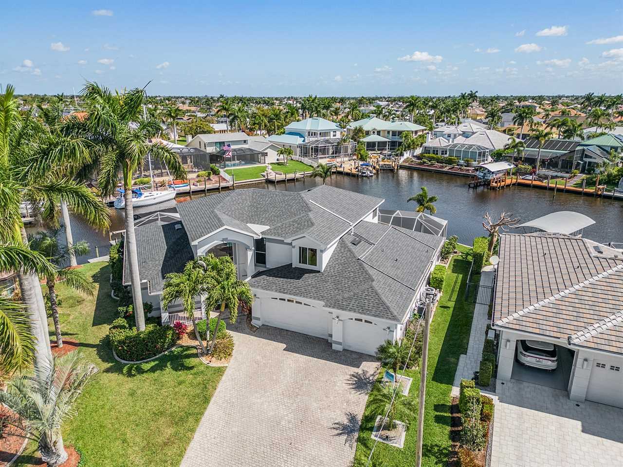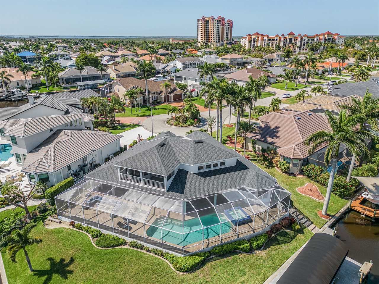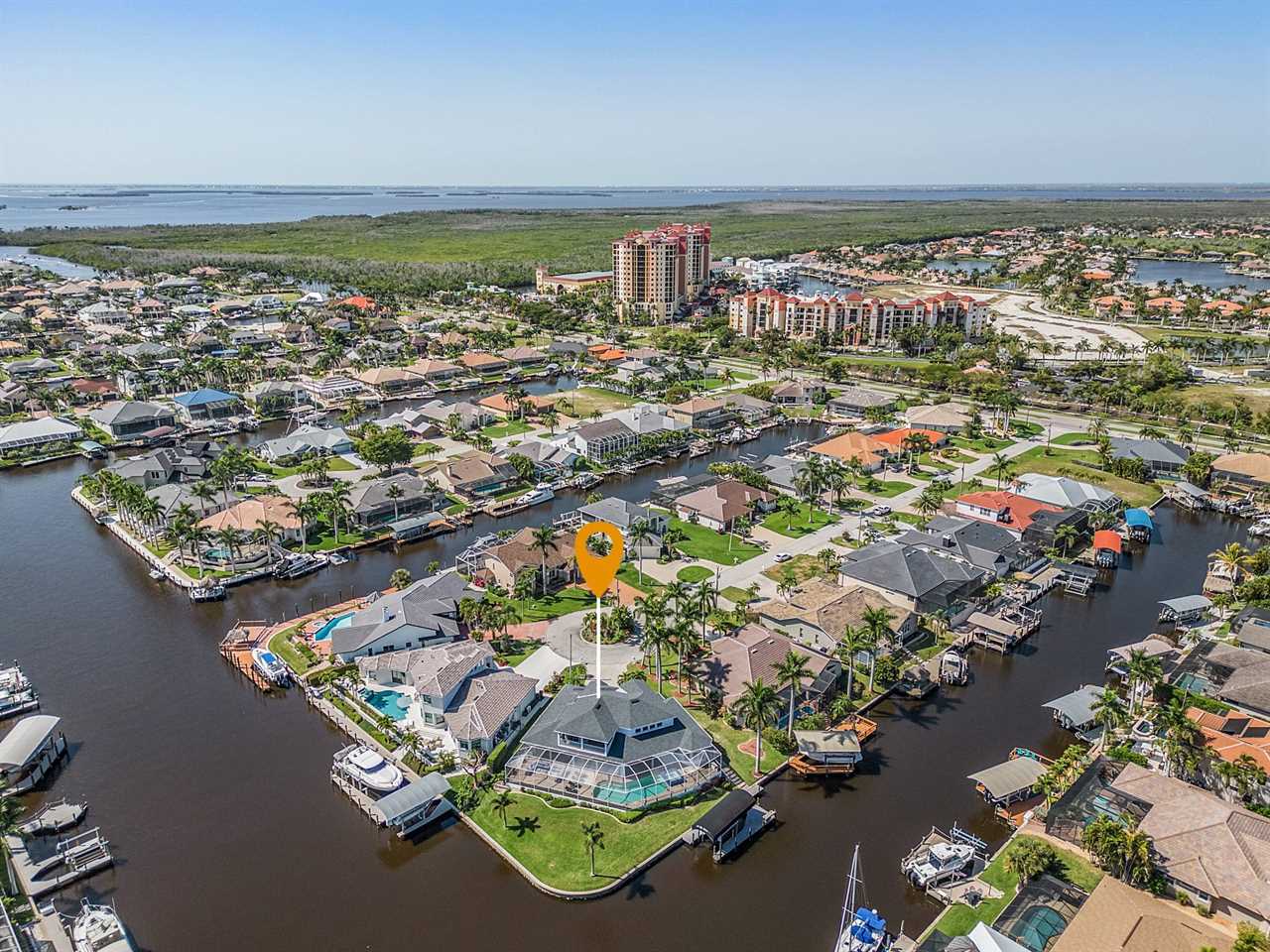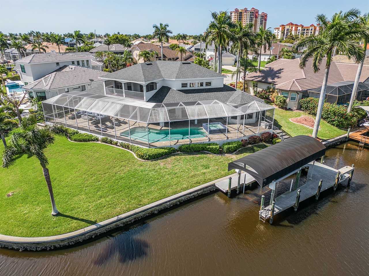 While the inside of this home is beyond luxurious, you will find the true highlight of Villa Whispering Palms when you walk outside. Outside you will find your own private paradise with a large screened in lanai, outdoor kitchen and custom pool, with a brand NEW hot tub. This pool is perfect for soaking up the Florida sun, splashing around or playing pool games. Plenty of outdoor furniture gives you and your guests plenty of options for where to relax and take in the Florida fresh air. Spend your evenings relaxing on the large outdoor couch and electric fireplace. Make yourself a drink and enjoy the views of the canal. Villa Whispering Palms sits on a large lot and has a spacious backyard. Here you have room to play a game of cornhole or walk down to the dock where you can fish or search for Southwest Florida Wildlife.