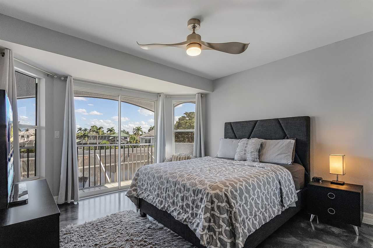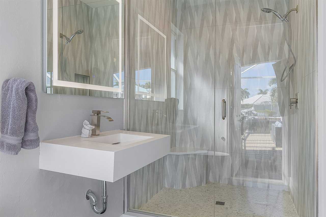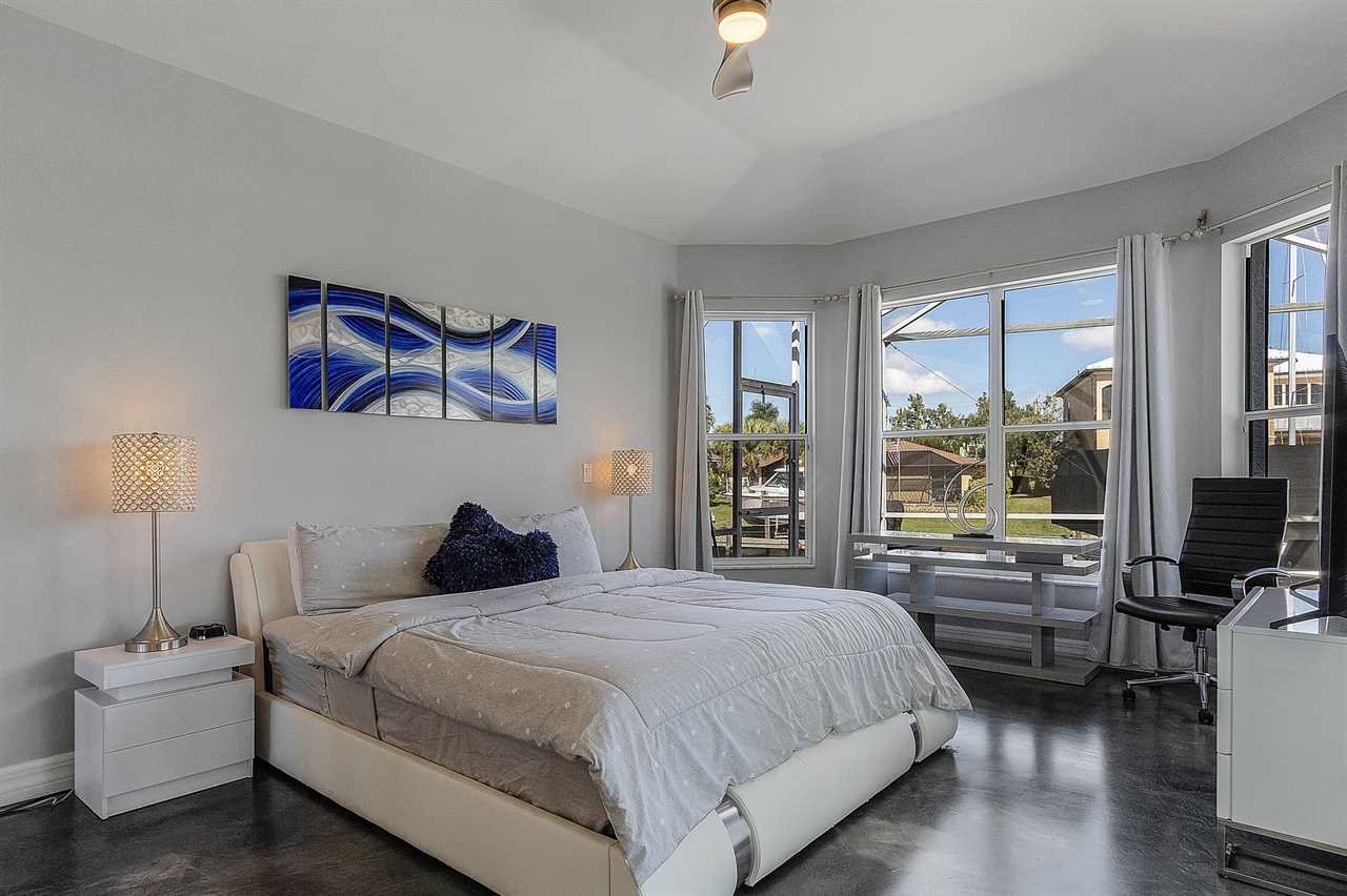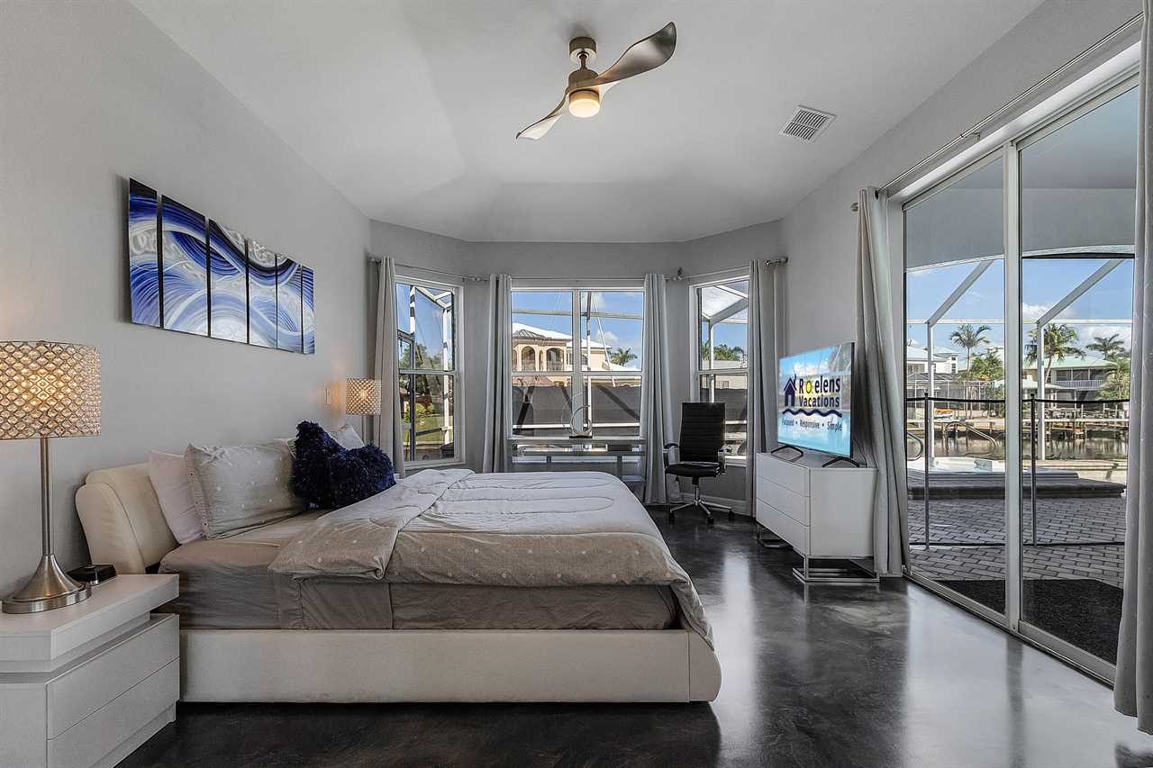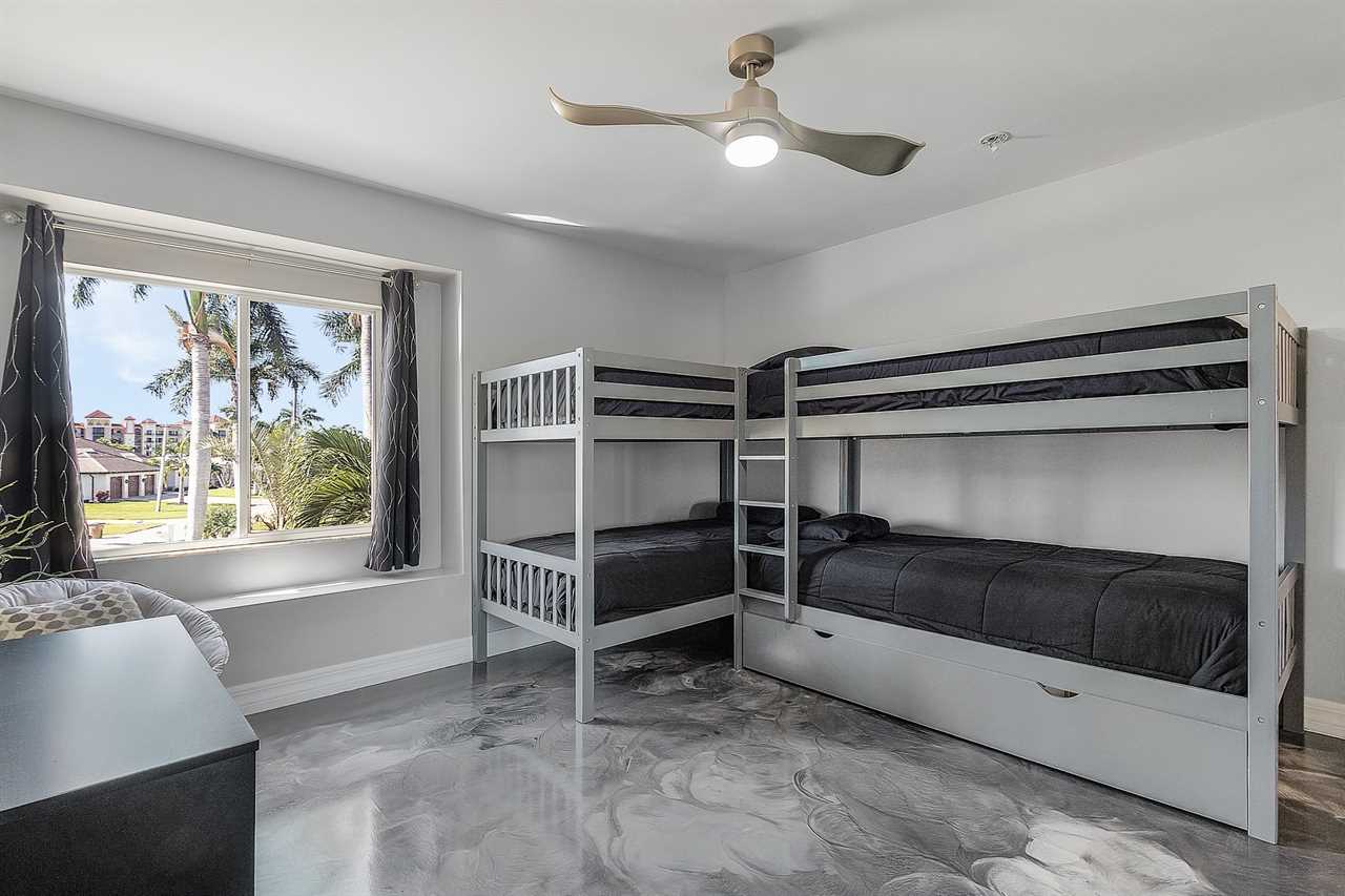 In the Master bedroom located on the first floor, you will find a spacious King size bed, direct access to the lanai, a flat screen TV, and an ensuite bathroom. This ensuite bathroom is fit for royalty with a double vanity sink, large stand-alone soaking tub, and walk in shower with a rain shower head. The second bedroom on the main floor also features a King size bed, and direct lanai access. Once upstairs, guests will find two additional guest rooms. The first room features two cozy beds while the fourth bedroom features 2 bunk beds, making it the perfect room for kids. On the second floor you will also find a large screened in balcony that overlooks the pool and canal. Catch incredible sunsets from this balcony!