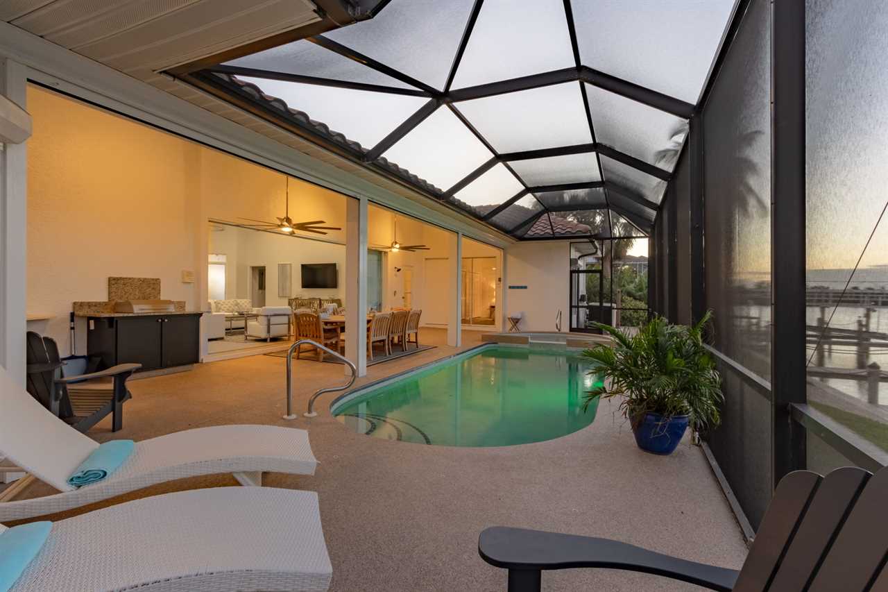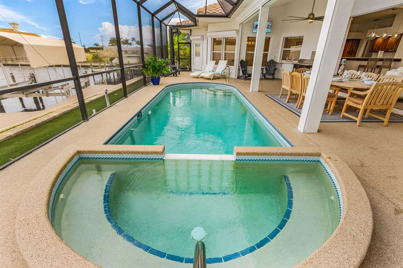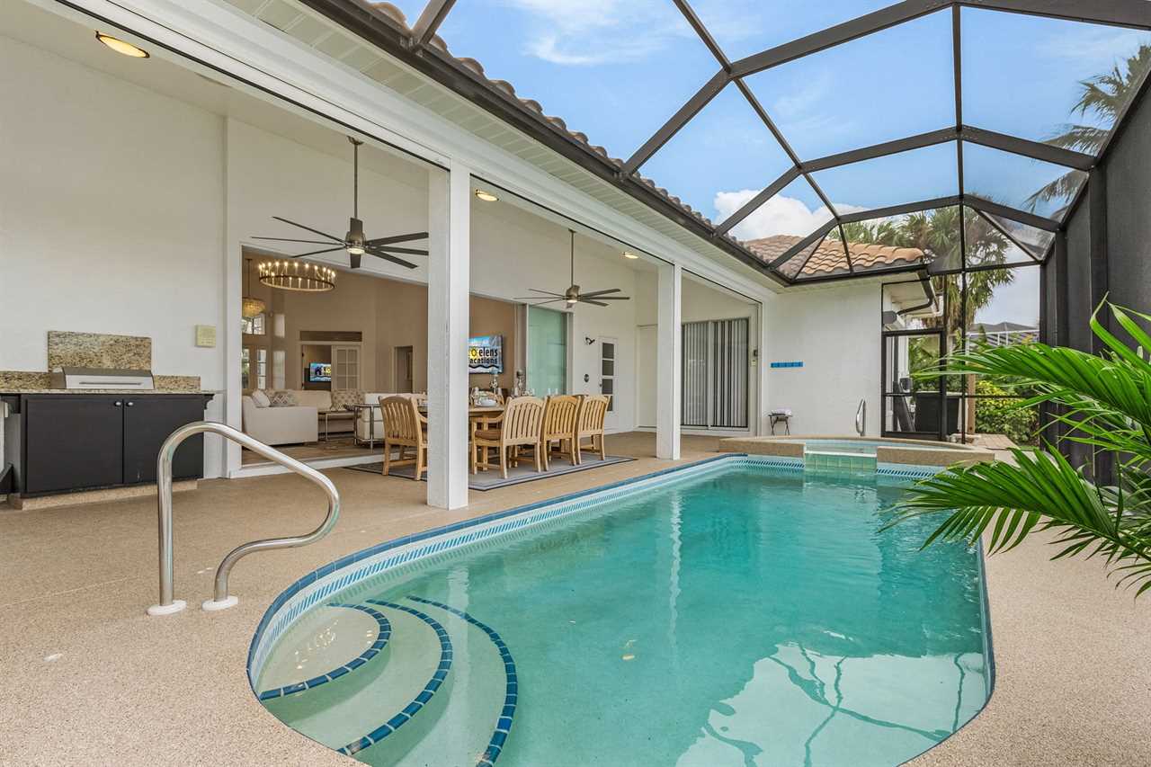 Heated Saltwater Pool with Jacuzzi: Dive into the silky-smooth heated saltwater pool with Jacuzzi, a cover and safety fence, ideal for refreshing swims or relaxing under the Florida sun all year round.