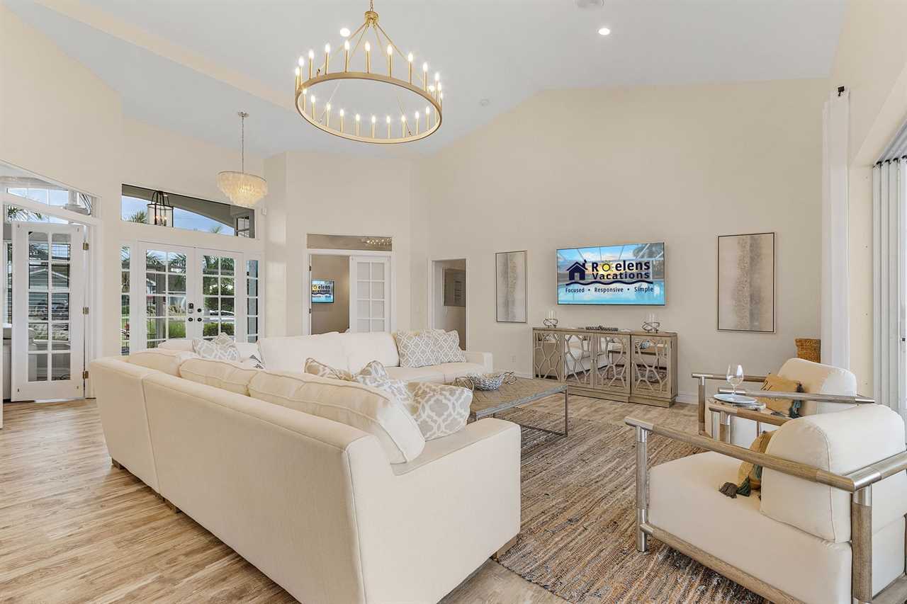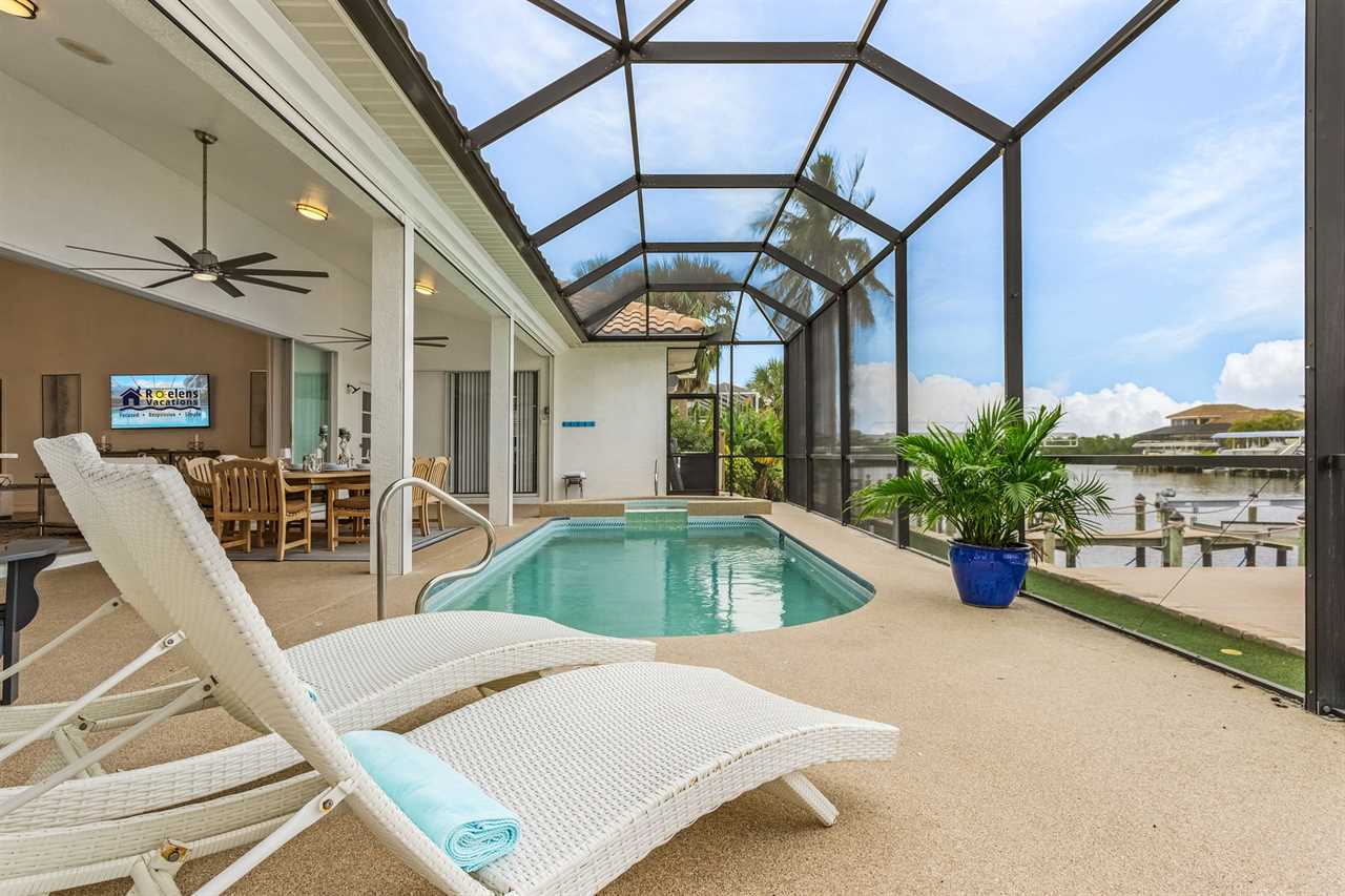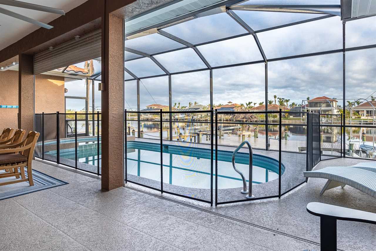 Heated Saltwater Pool with Jacuzzi: Dive into the silky-smooth heated saltwater pool with Jacuzzi, a cover and safety fence, ideal for refreshing swims or relaxing under the Florida sun all year round.