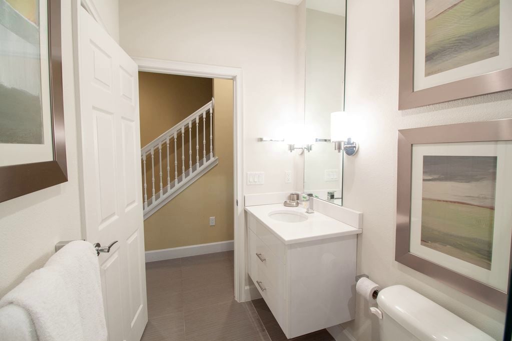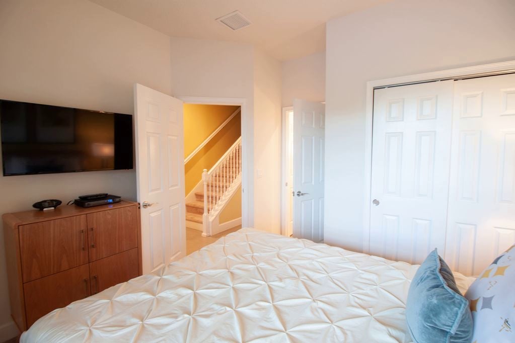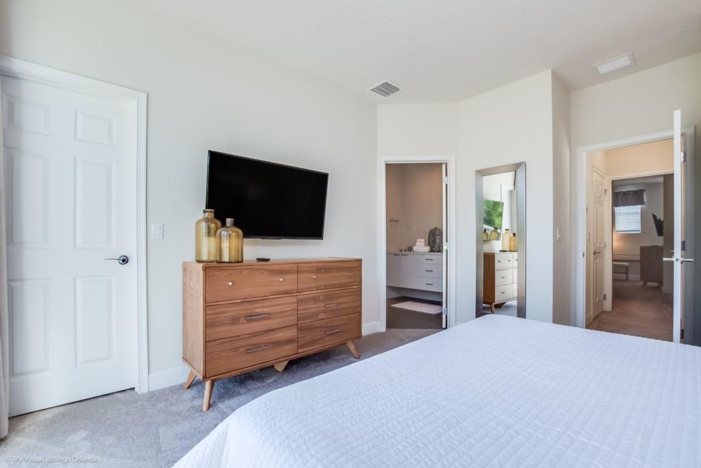 • First Floor – Bedroom 1: Queen bed with TV and private bathroom (dual access from hallway and bedroom)