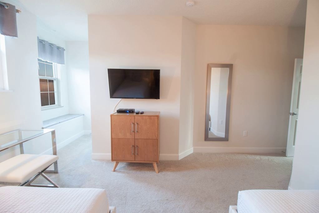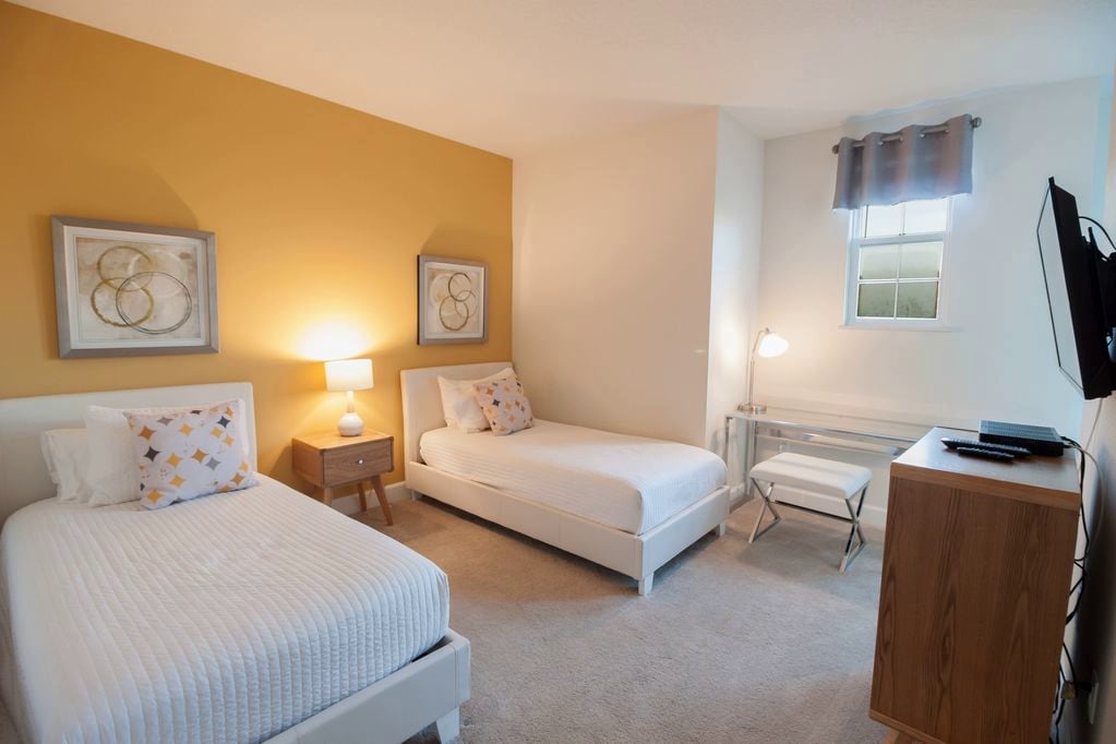 • Second Floor – Bedroom 3: Two twin beds with TV and private bathroom