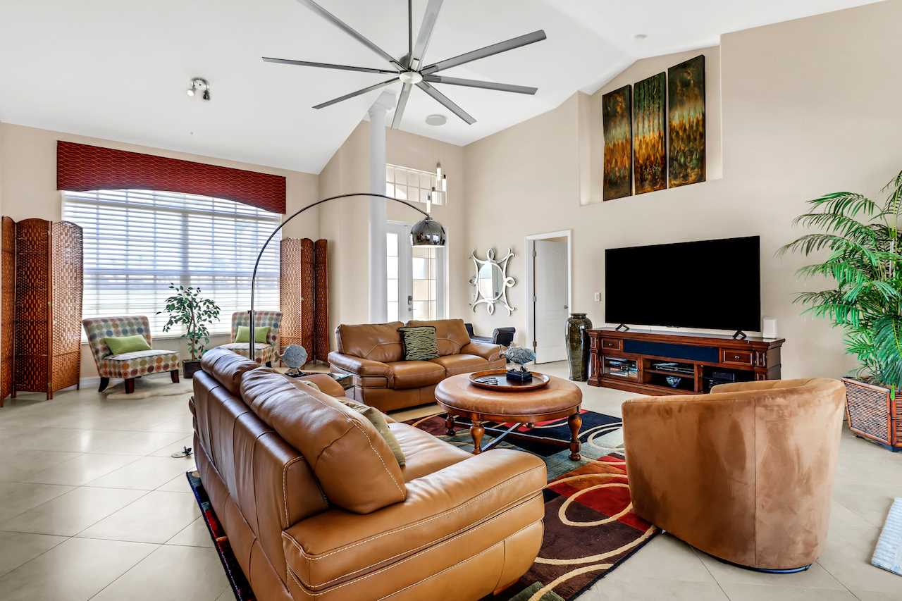 The living room features a large leather seating arrangement and 75" ROKU TV with access to your own streaming accounts. This area is nicely decorated with wall art and beautiful lighting.