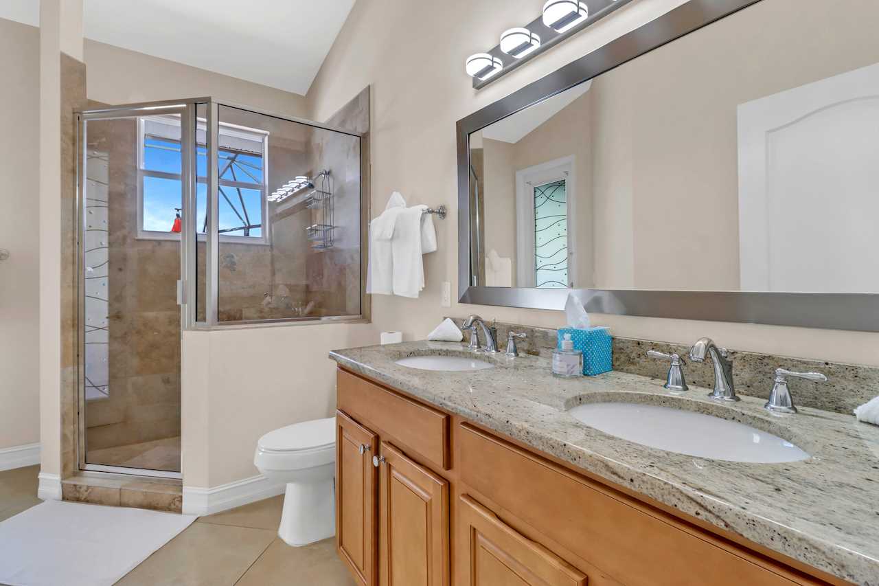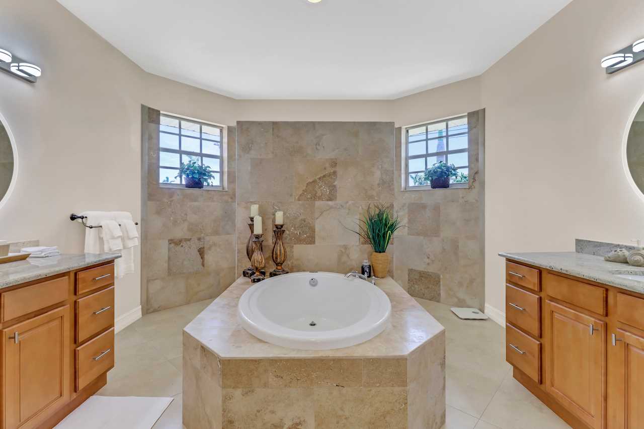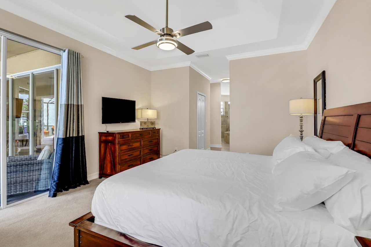 A luxurious 3 bedroom and 2 bathroom home with split floorpan putting the master suite on the northern side of the house. The Master Suite with King sized bed has direct access to the pool area, wall mounted ROKU TV and its own Master Bathroom with walk around shower and large tub. BOSE sound system to connect your phone to and enjoy your tunes is also provided in the Master Bathroom and can be moved.